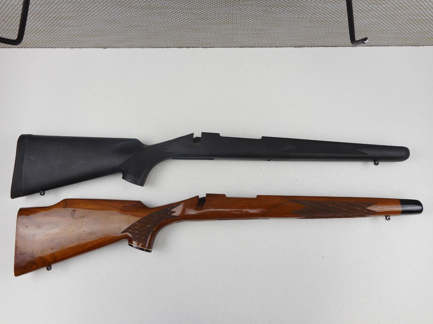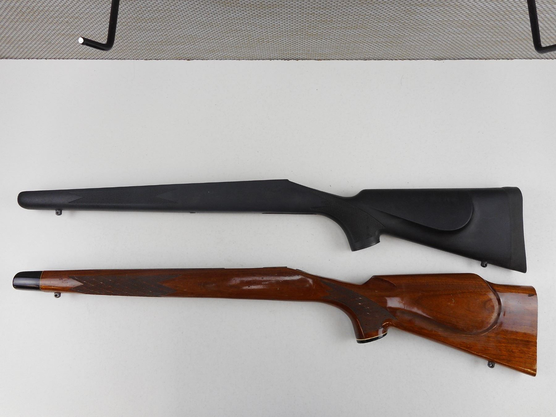 REMINGTON 700 GUN STOCKS , (1) BLACK SYNTHETIC ADL LONG ACTION WITH REMINGTON RUBBER BUTT PLATE, (1) WOODEN BDL VARMET SHORT ACTION, LOT OF 2