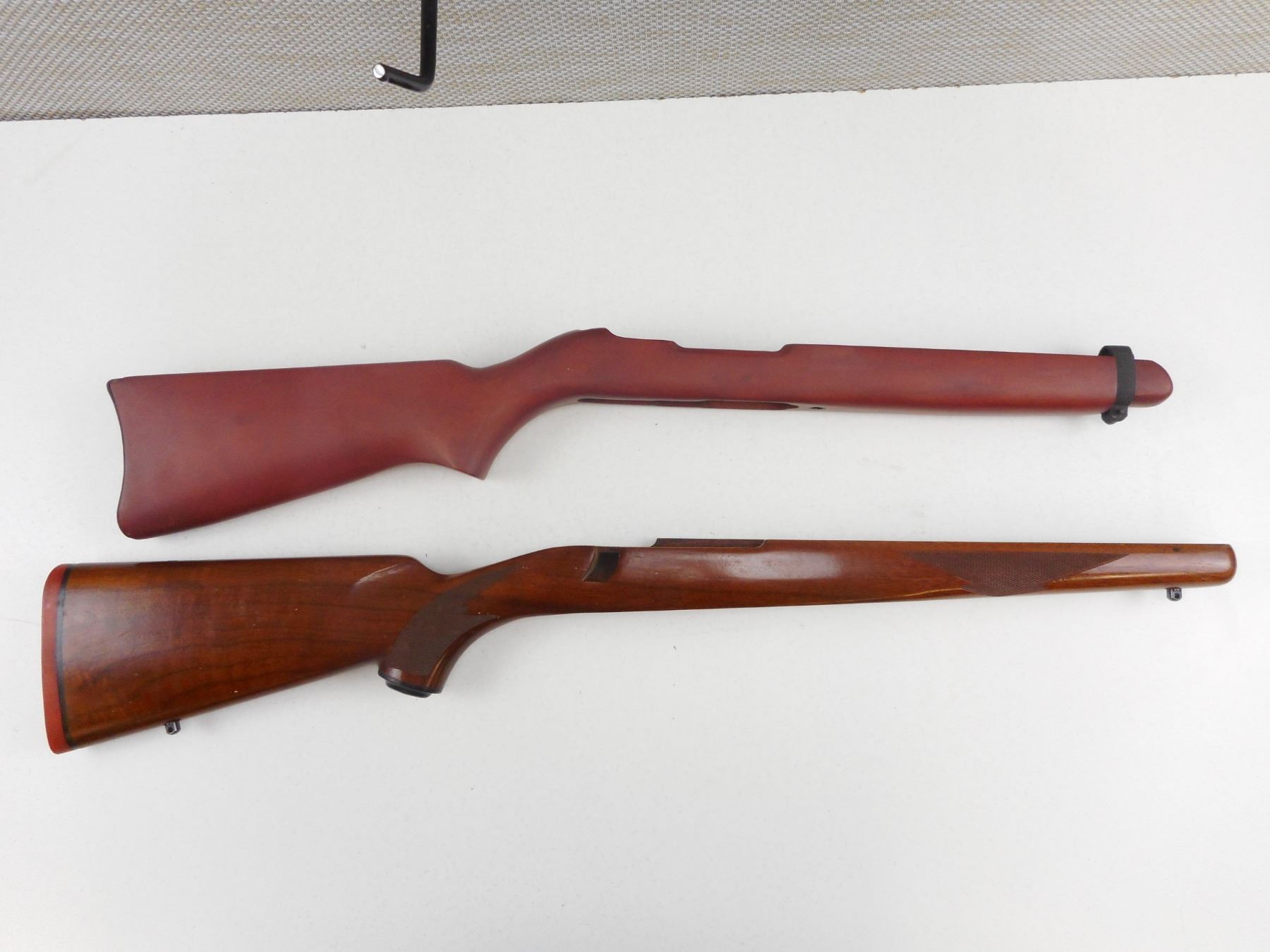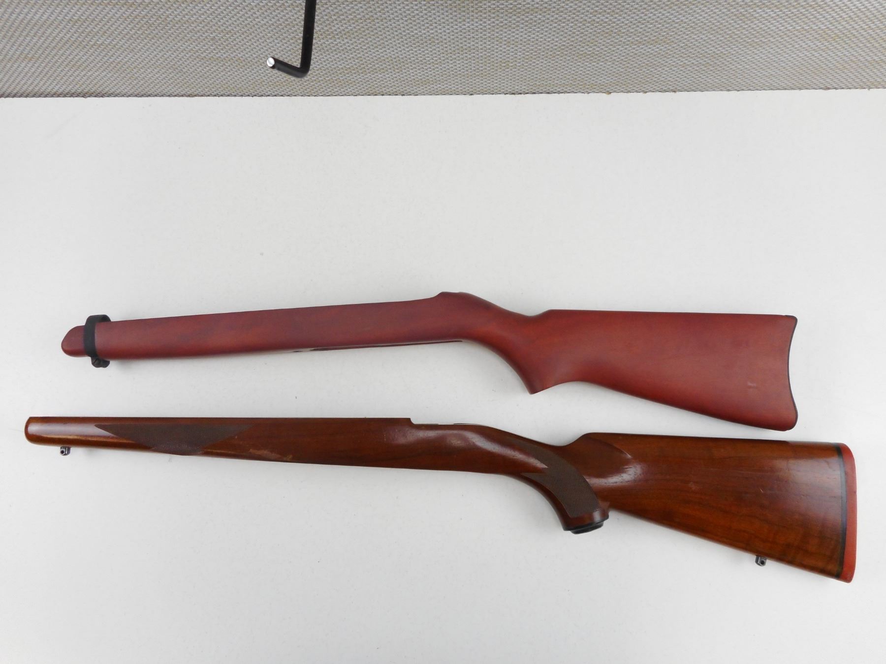 ASSORTED WOODEN GUN STOCKS FOR 10/22 , (1) ROCK ISLAND 10/22 CLONE/ RUGER 10/22 WITH METAL BUTT PLATE (1) RUGER MKI MEDIUM SPORTER SHORT ACTION WITH RUBBER RUGER BUTT PLATE, LOT OF 2