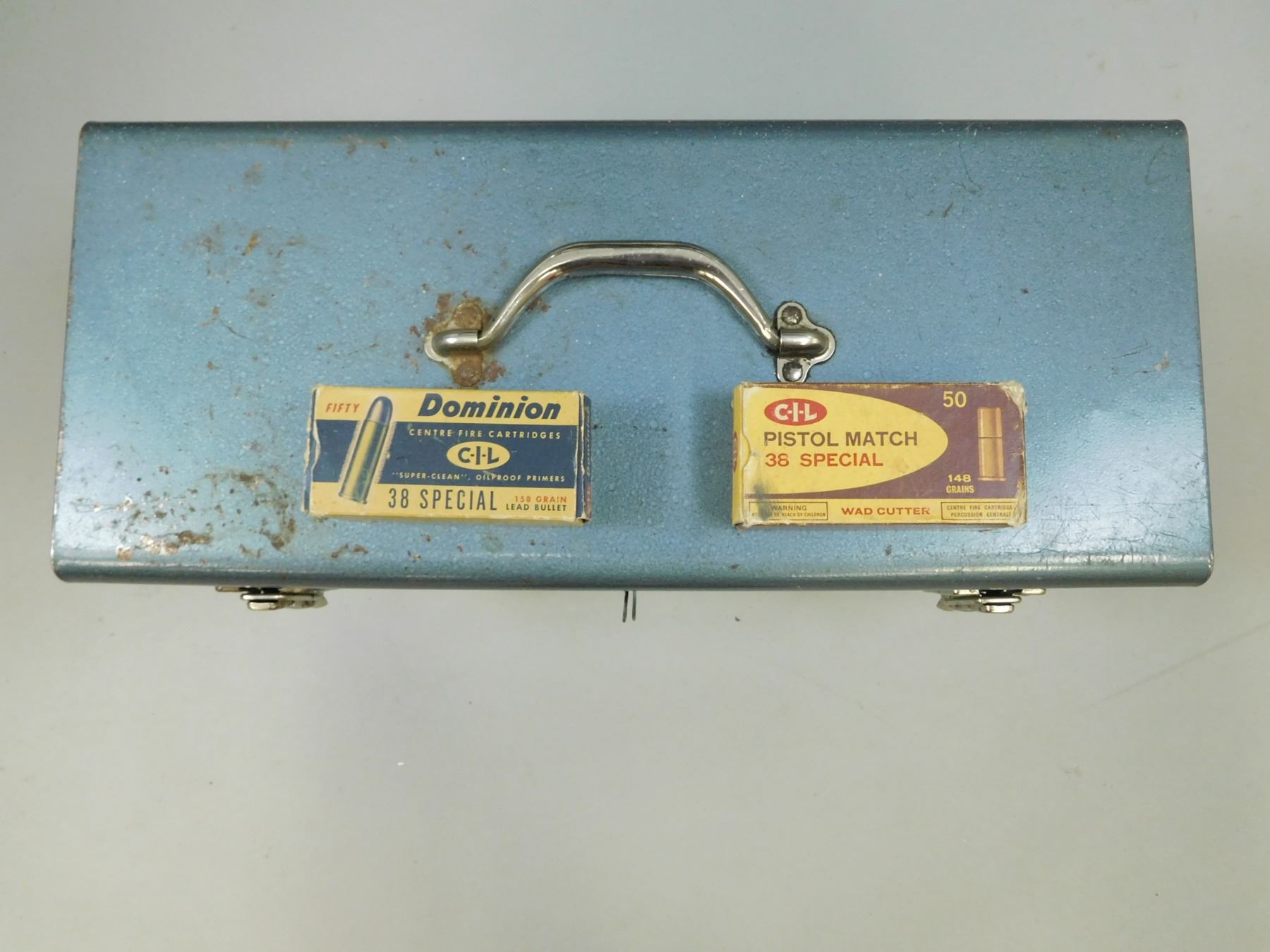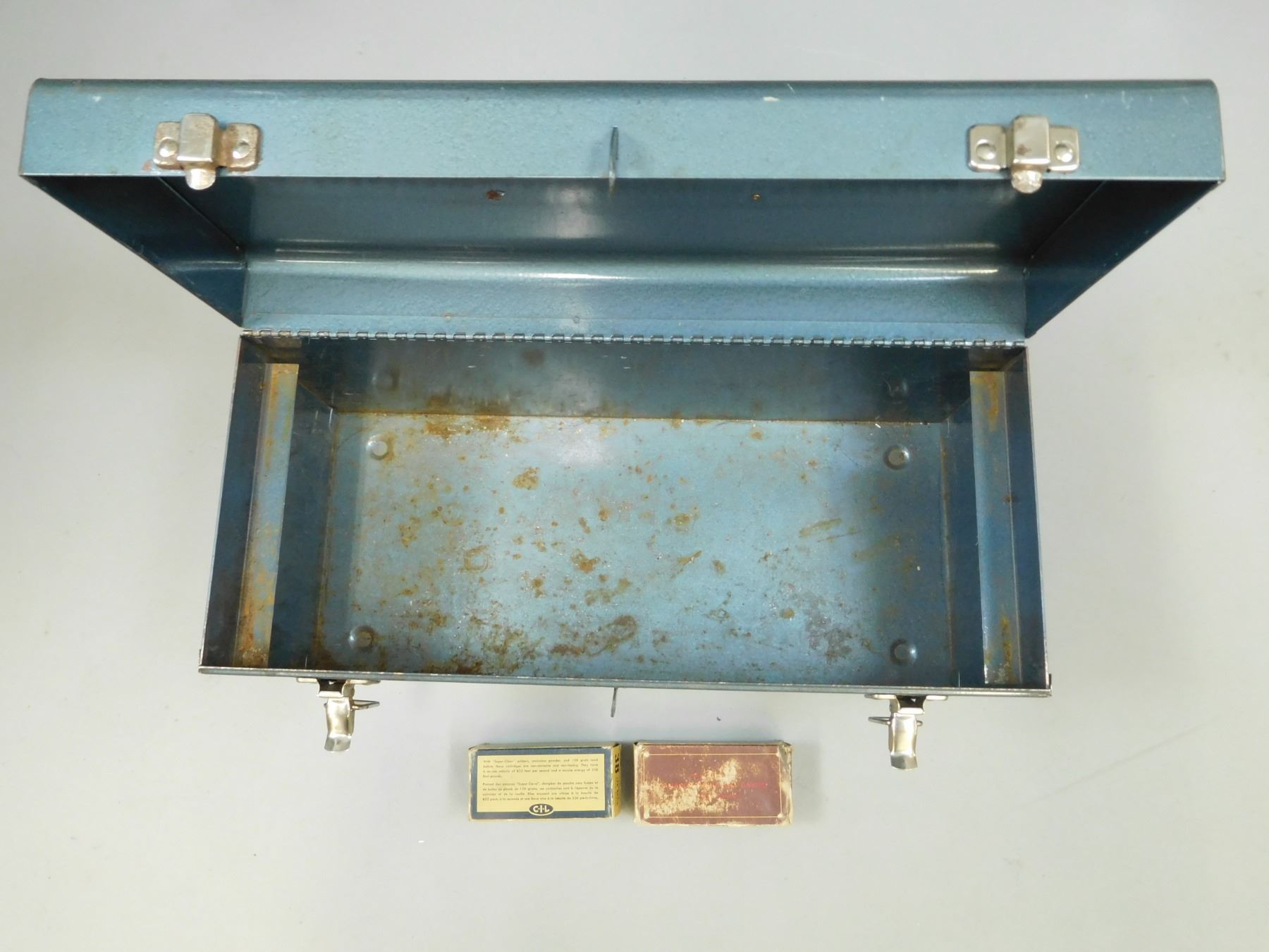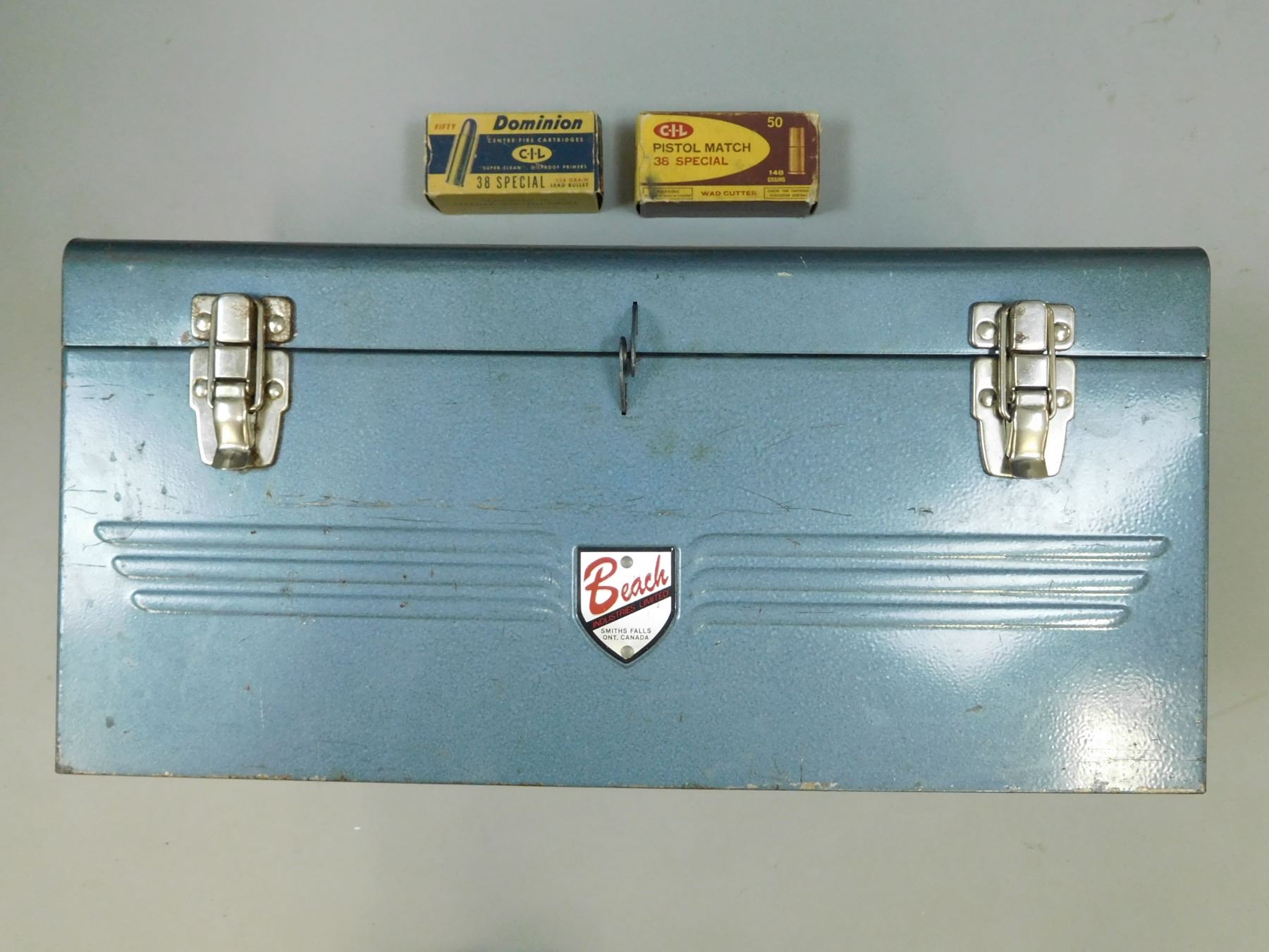 TOOL BOX & AMMO BOXES , (1) METAL TOOL BOX APPROX. 20 X 9.5 X 8.5" (1) EMPTY DOMINION BOX (1) EMPTY CIL BOX