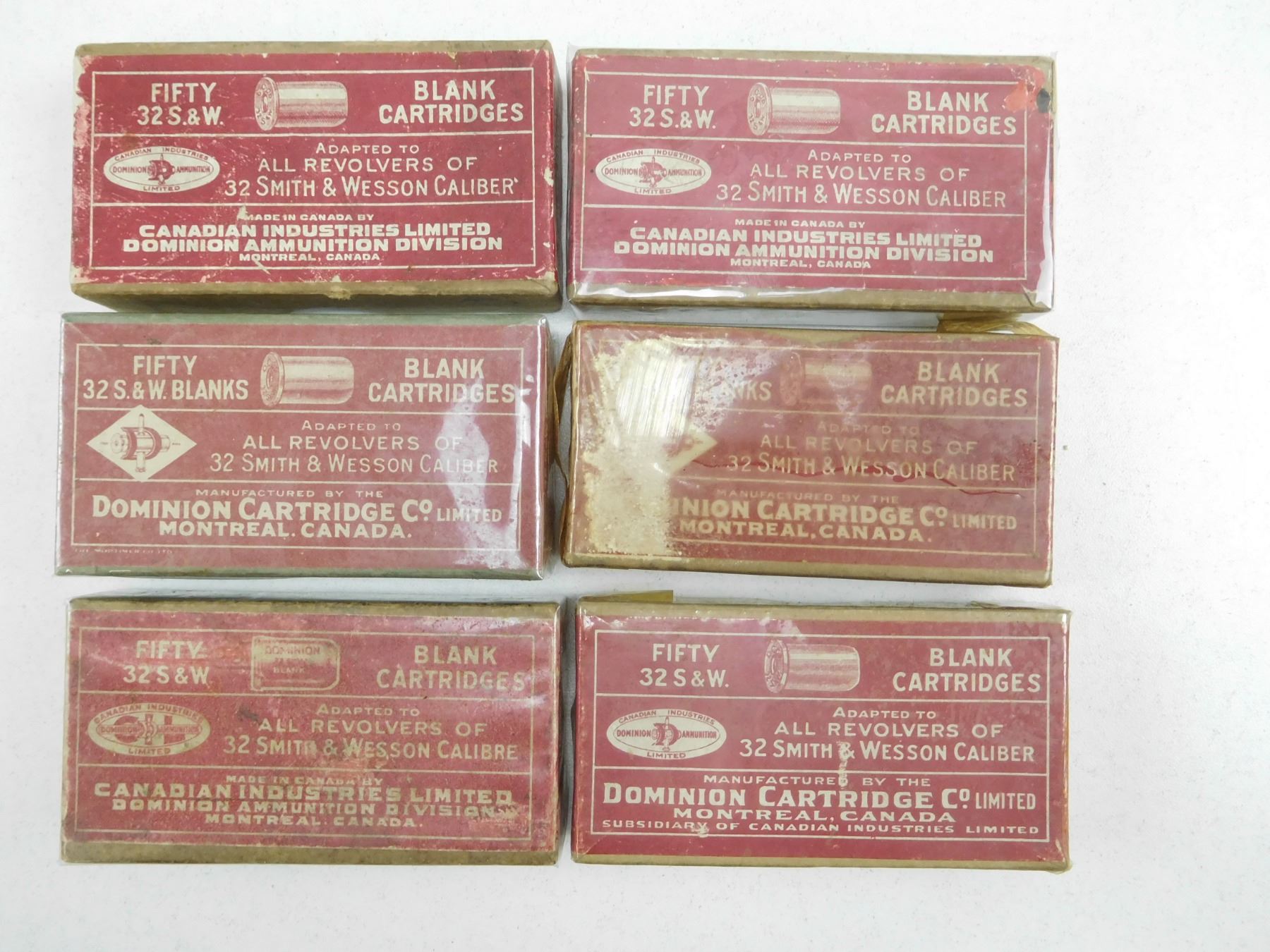 ASSORTED EMPTY AMMO BOXES , DOMINION 32 S&W BLANK BOXES, LOT OF 6