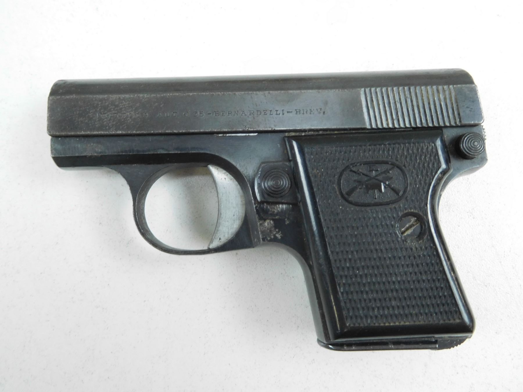 BERNARDELLI VINCENZO , MODEL: VEST POCKET , CALIBER: 6.35MM , COMES WITH MAGAZINE,FIXED NOTCH AND BLADE SIGHTS, CHECKERED PLASTIC GRIPS , BARREL LENGTH: 54MM , SERIAL # 19957 , STOCK # 2171 , CONDITION: 6/10 , CLASS: CANADIAN PROHIBITED CLASS