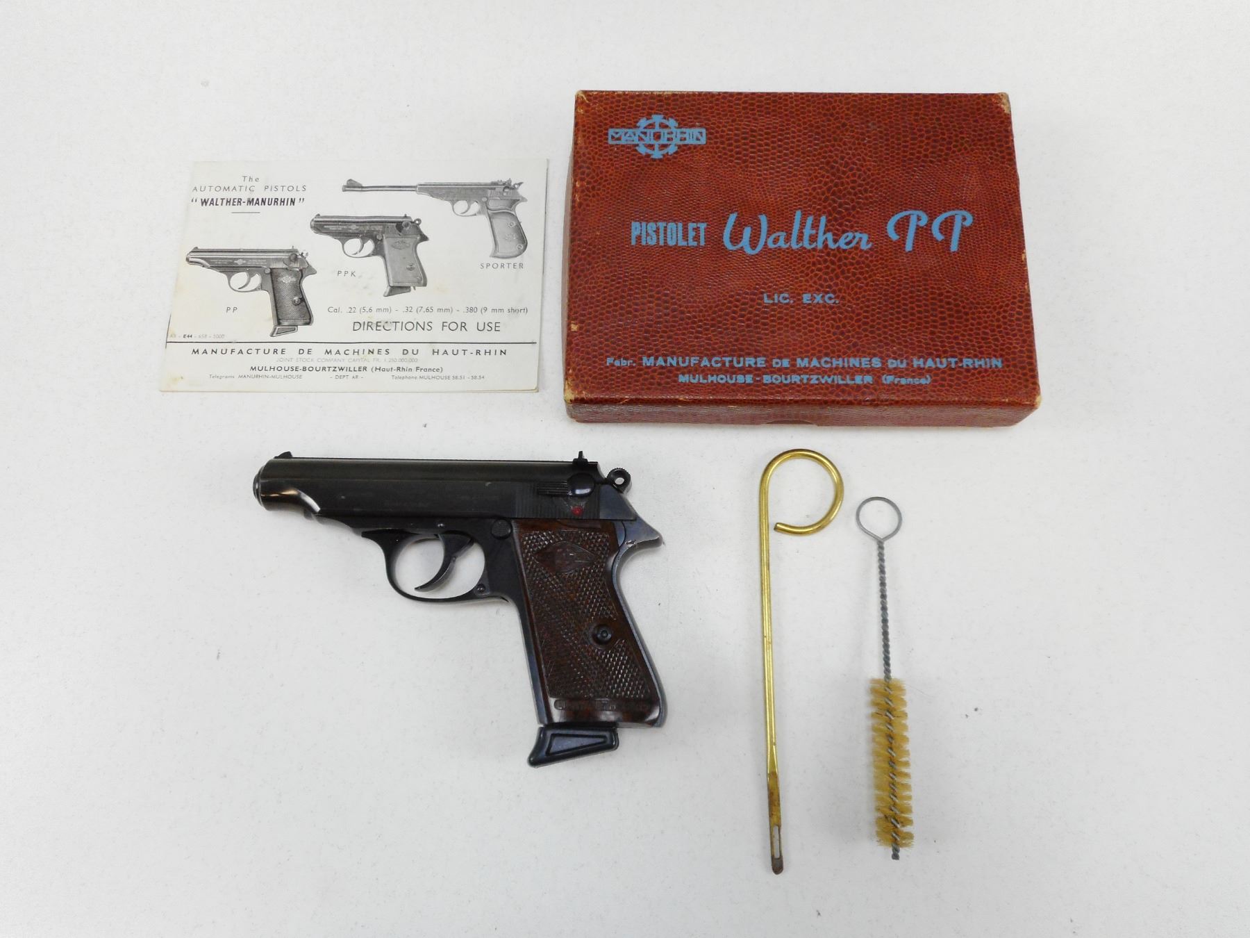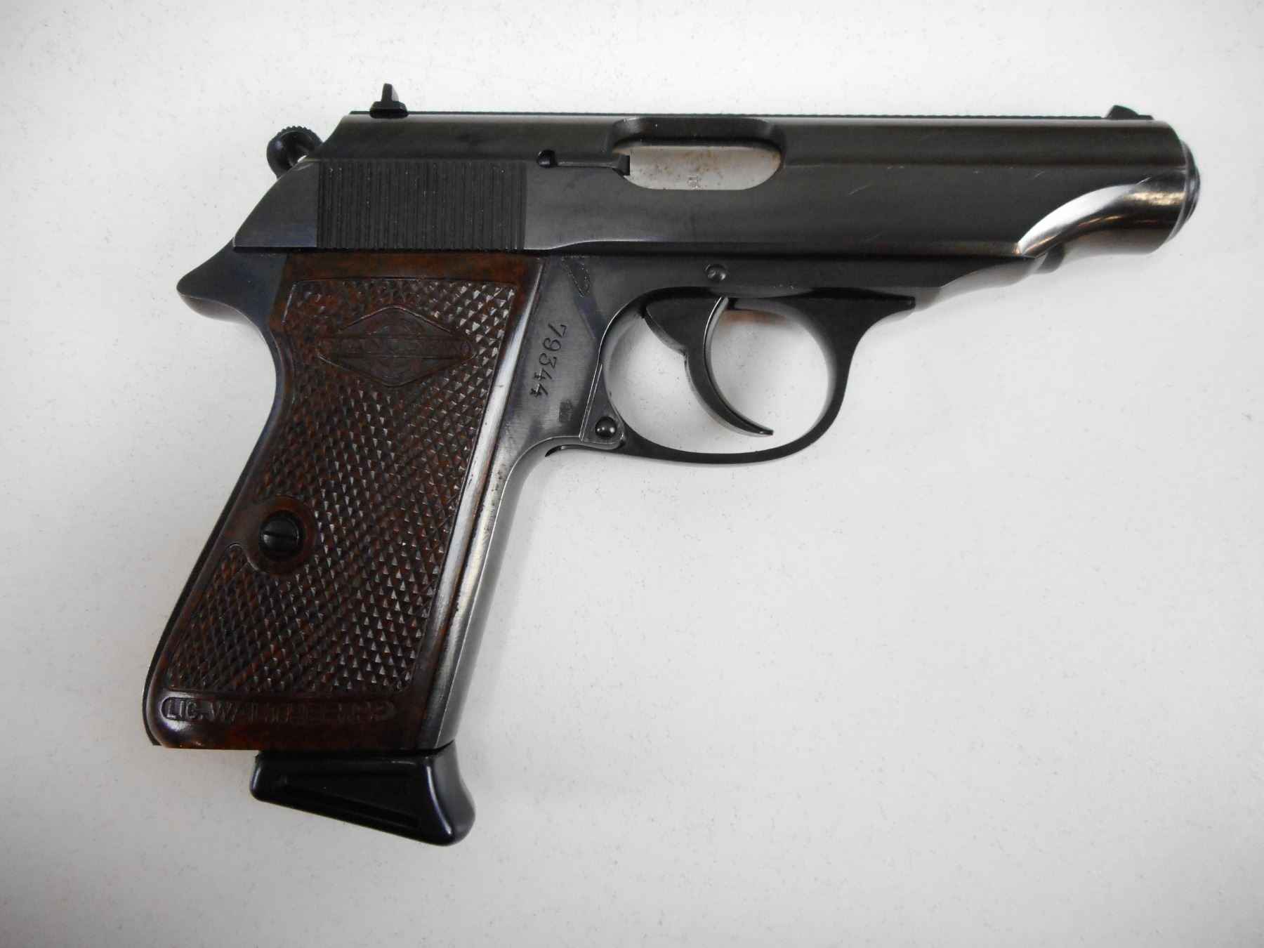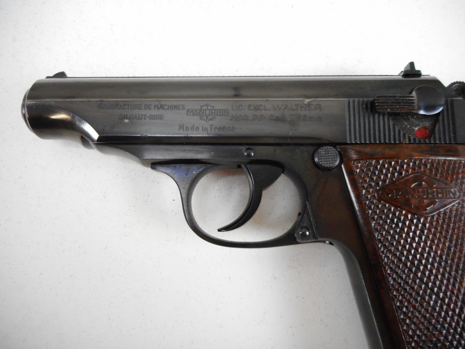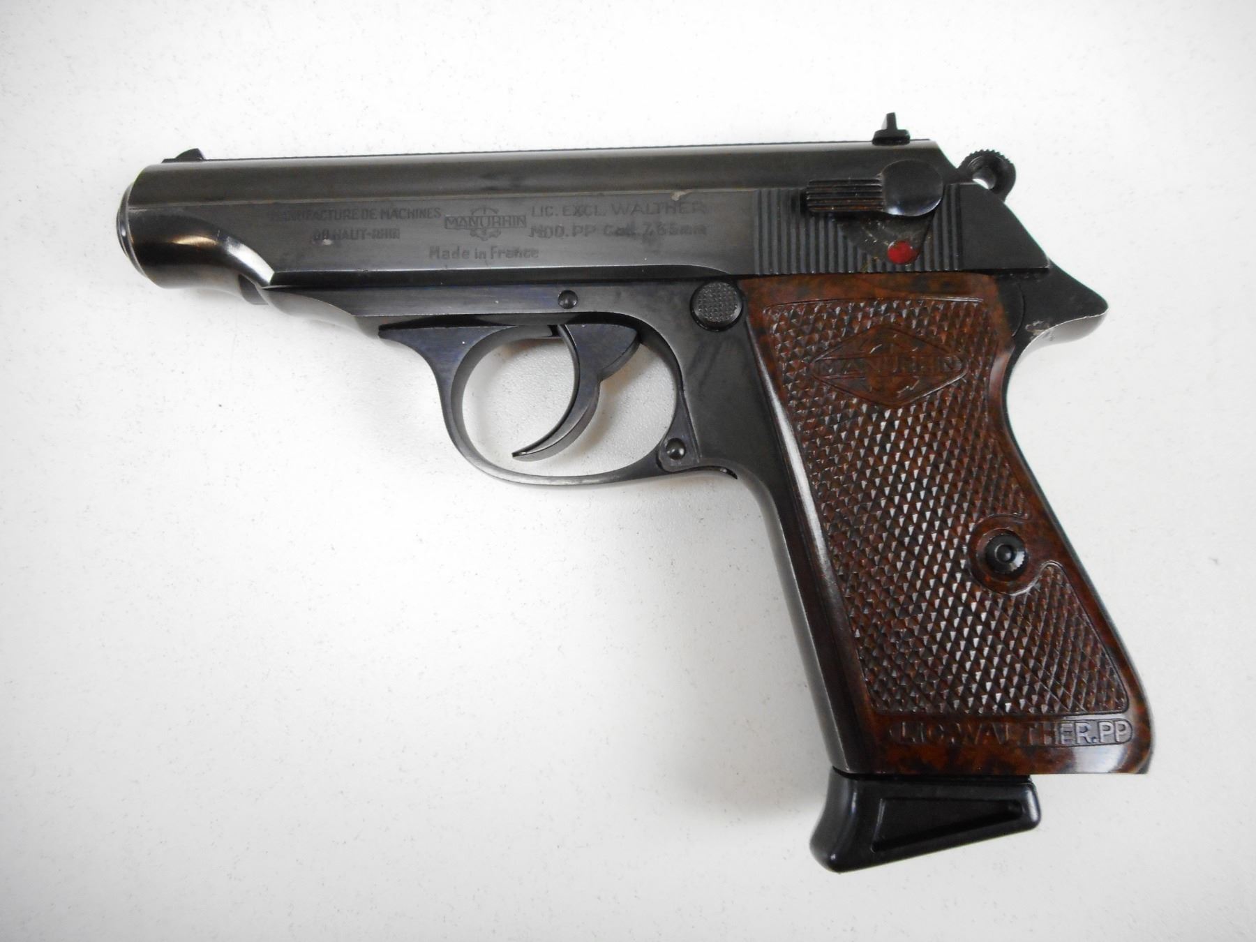 WALTHER/MANURIN , MODEL: PP , CALIBER: 7.65MM , COMES WITH MAGAZINE, FIXED NOTCH AND BLADE SIGHTS, CHECKERED PLASTIC GRIPS, EXCELLENT BLUE FINNISH, EXCELLENT BORE , BARREL LENGTH: 98MM , SERIAL # 79344 , STOCK # 2184 , CONDITION: 9/10 , CLASS: CANADIAN PROHIBITED CLASS