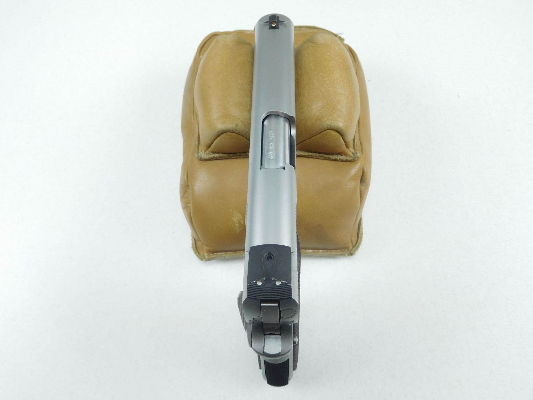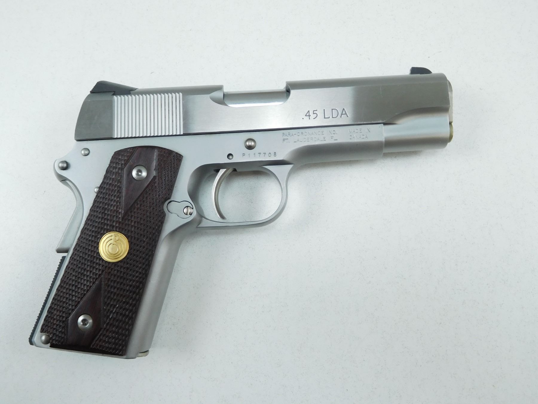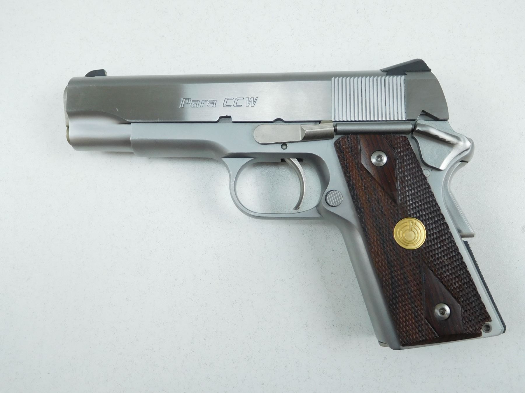 PARA ORDANANCE , MODEL: CCW 7-45 , CALIBER: 45 ACP , COMES WITH MAGAZINE, STAINLESS STEEL FINISH, WITH A ADJUSTABLE BLADE AND REAR NOTCH SIGHTS, CHECKERED ROSEWOOD GRIPS, GRIP SAFETY, BORE IS EXCELLENT , BARREL LENGTH: 127MM , SERIAL # P117708 , STOCK # 2682 , CONDITION: 9/10 , CLASS: CANADIAN RESTRICTED CLASS