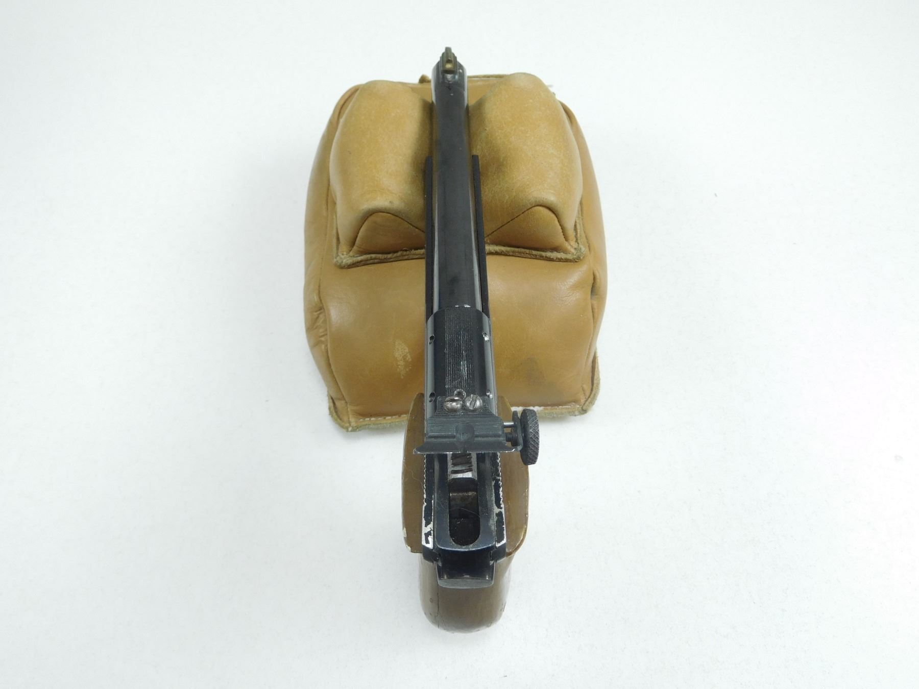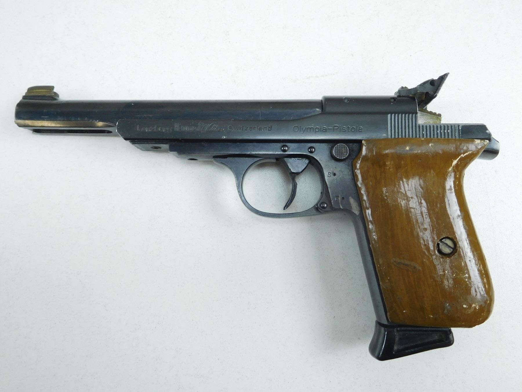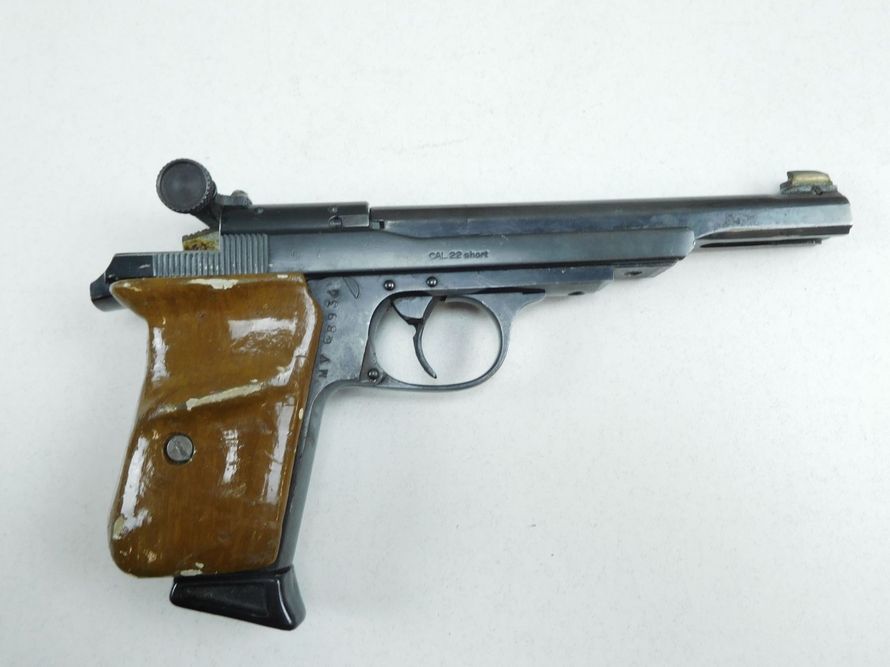 HAMMERLI-WALTHER , MODEL: OLYMPIA , CALIBER: 22 SHORT , MANUFACTURED BY HAMMERLI, OLYMPIC PISTOL, FRONT BLADE AND ADJUSTABLE REAR SIGHTS, WOODEN WRAP AROUND GRIP IS BROKEN AND REPAIRED AT BUTT, HAS A GOOD BORE, TARGET TRIGGER , BARREL LENGTH: 145MM , SERIAL # MV68934 , STOCK # 2690 , CONDITION: 5/10 , CLASS: CANADIAN RESTRICTED CLASS