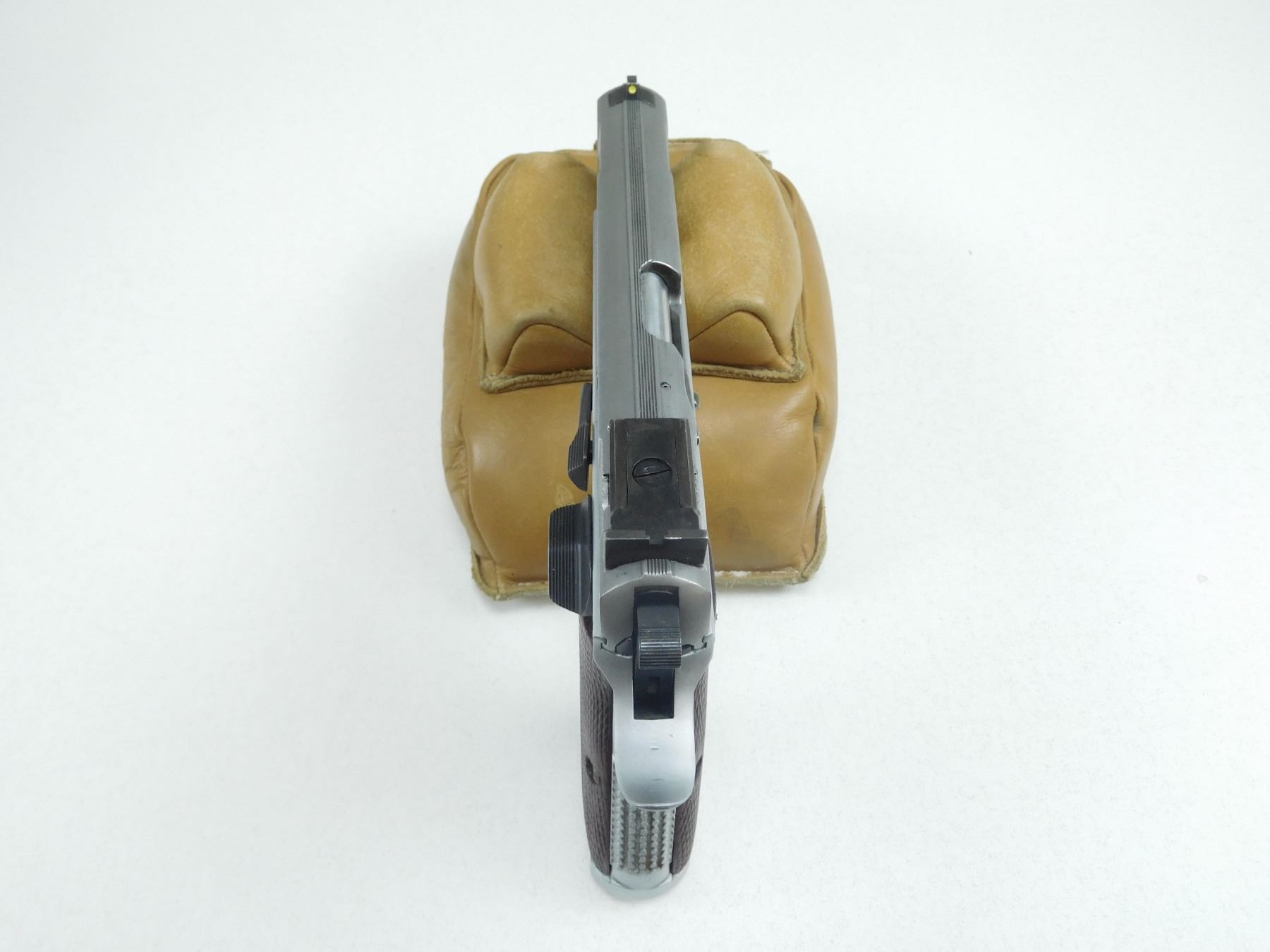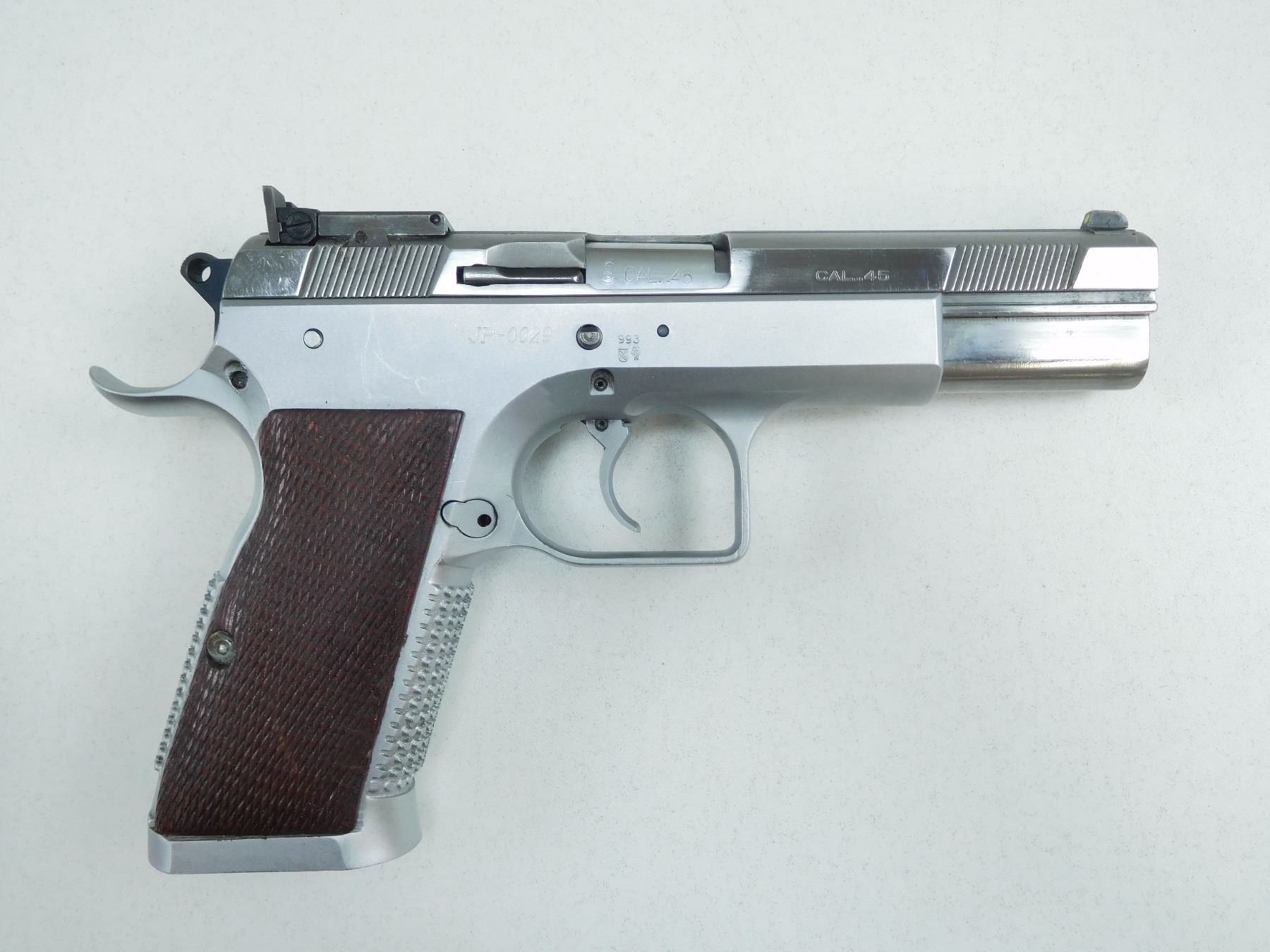 TANGFOLIO , MODEL: JOE PETERS CUSTOM , CALIBER: 45 AUTO , DOES NOT COME WITH MAGAZINE, JOE PETER SPECIAL, GOOD BORE, ADJUSTABLE FRONT NOTCH AND REAR TARGET SIGHT, STAINLESS STEEL FINISH , BARREL LENGTH: 113MM , SERIAL # JP0029 , STOCK # 2691 , CONDITION: 7/10 , CLASS: CANADIAN RESTRICTED CLASS