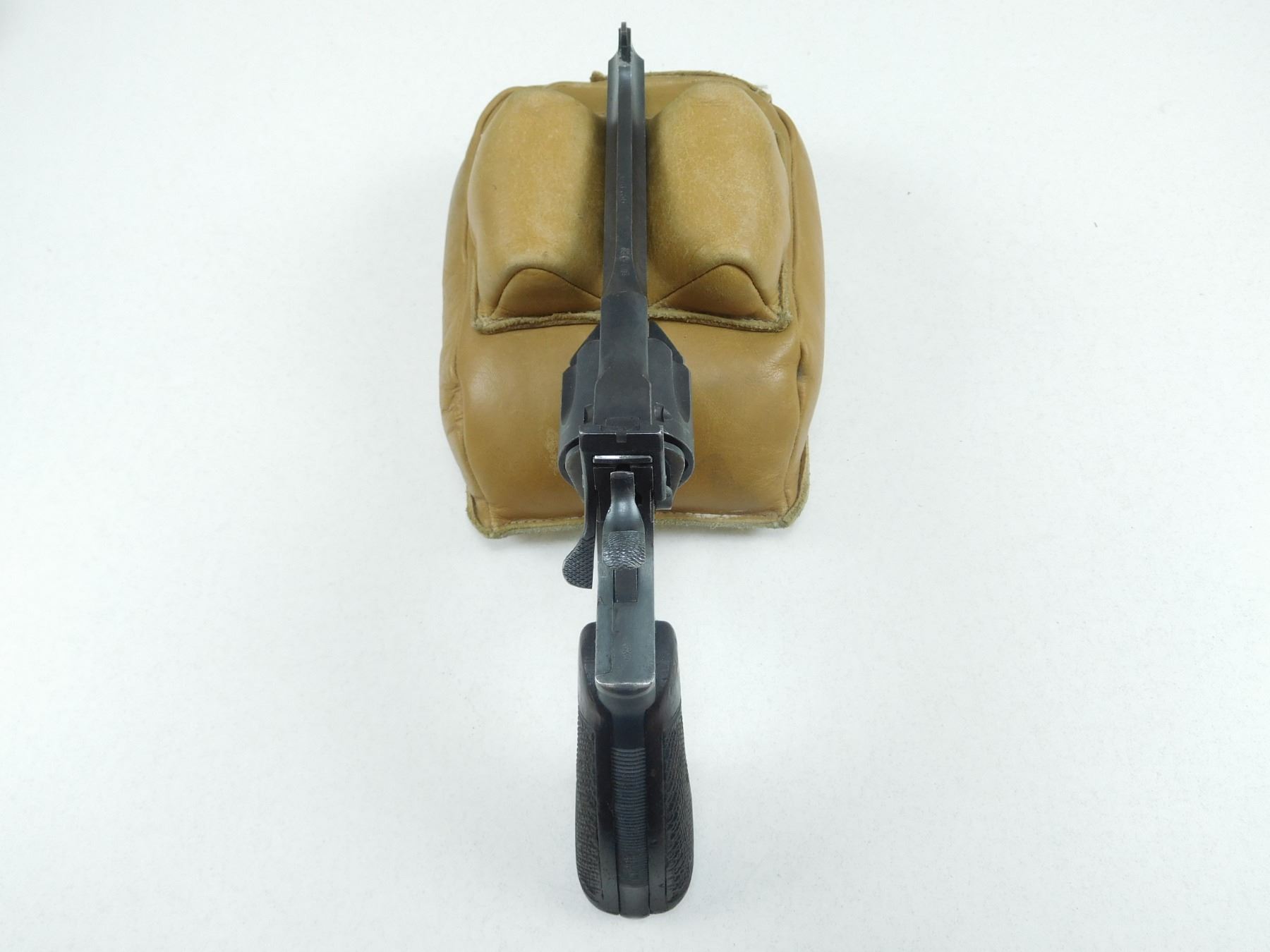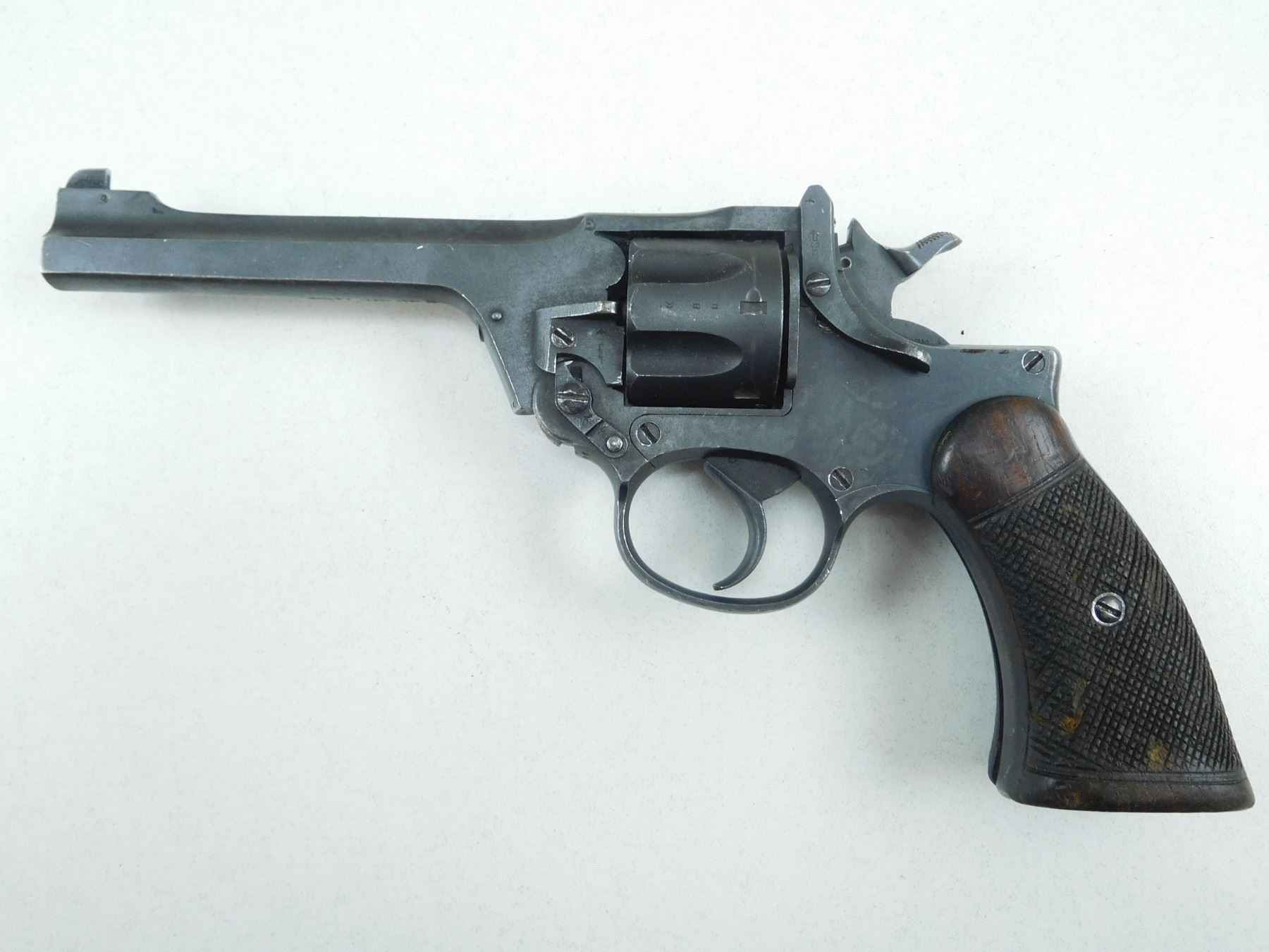 WWII ERA, ENFIELD , MODEL: NO 2 MKI , CALIBER: 38 S&W , DATED 1939, BRD ARROW MARKED, FIXED NOTCH AND BLADE SIGHTS, CHECKERED WOODEN GRIPS, MISSING THE LANYARD LOOP, BORE IS EXCELLENT, PARKERIZED WAR FINISH, WEAR APPROPRIATE TO AGE , BARREL LENGTH: 127MM , SERIAL # F8804 , STOCK # 2721 , CONDITION: 8/10 , CLASS: CANADIAN RESTRICTED CLASS