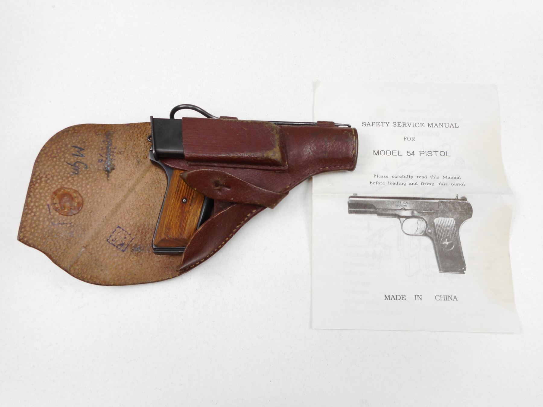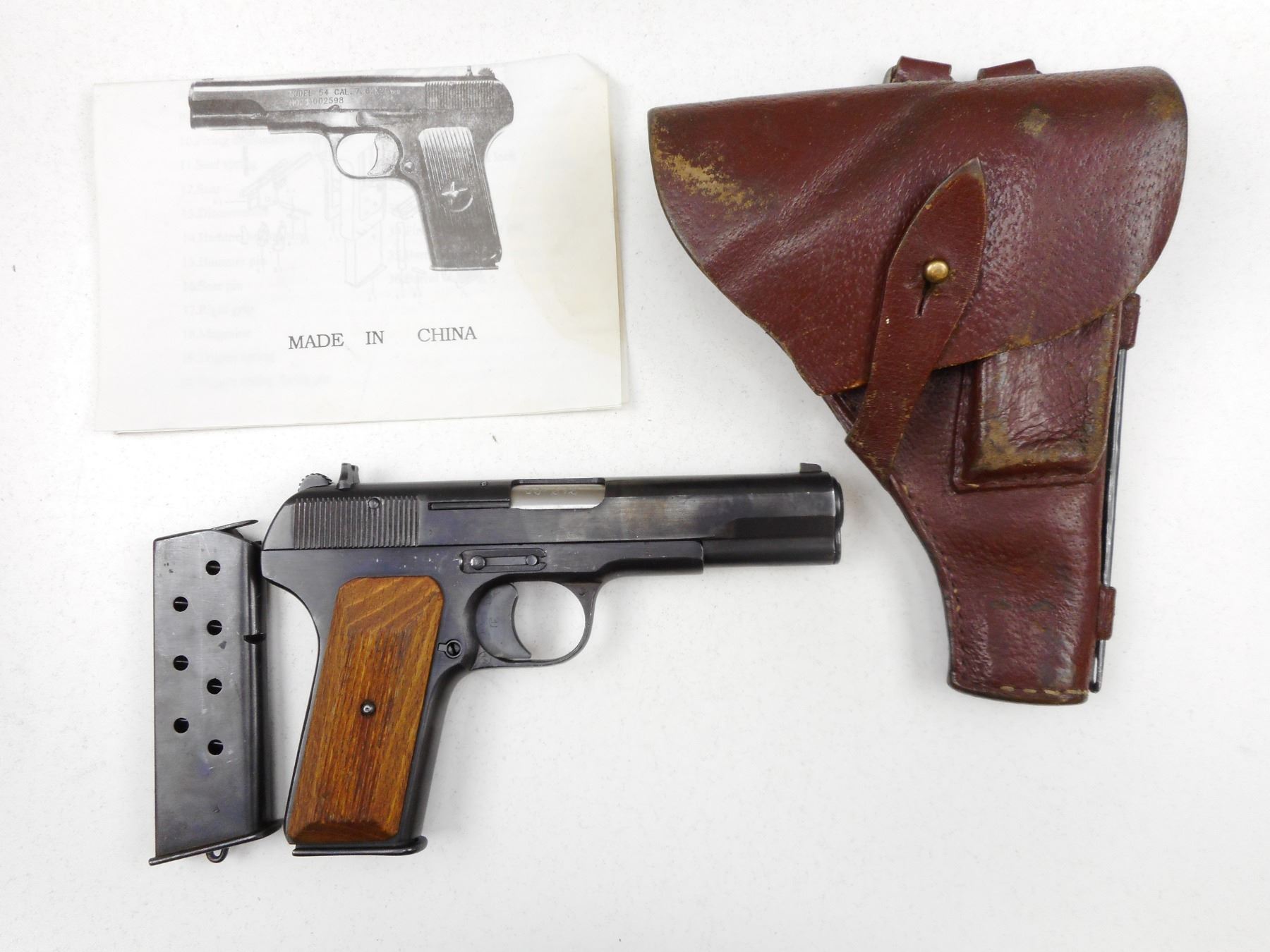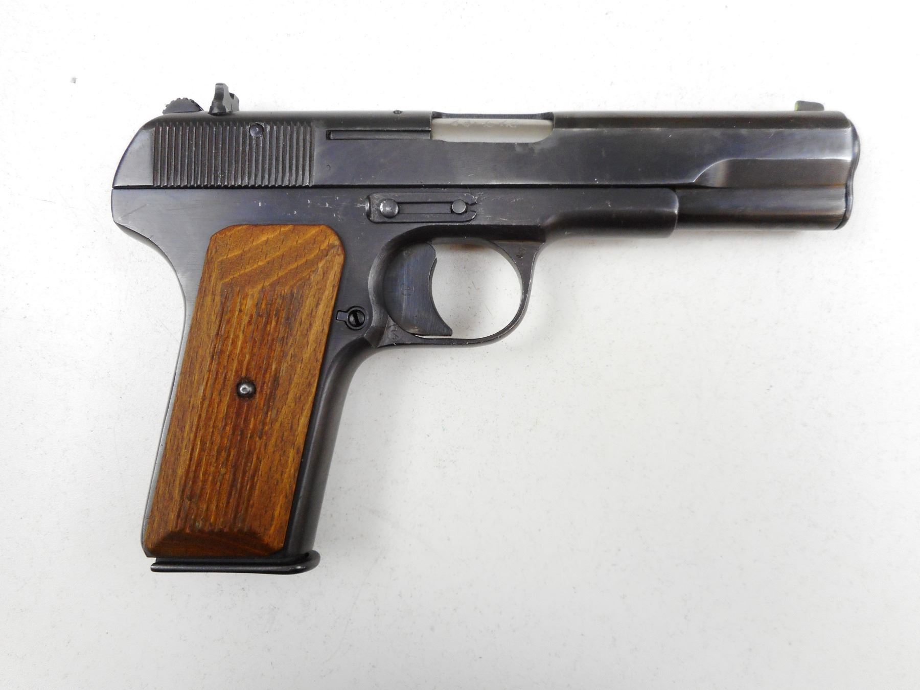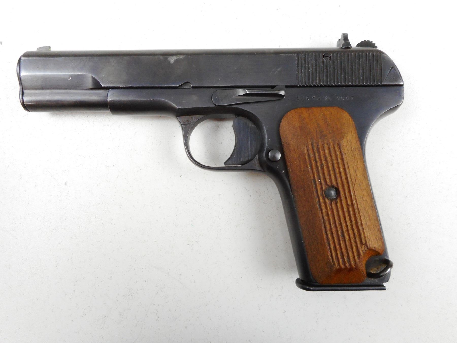 TOKAREV , MODEL: TT33 , CALIBER: 7.62 X 25 TOKAREV , COMES WITH 2 MAGAZINES, DATED 1947 IZHEVSK ARSENAL, FIXED NOTCH AND BLADE SIGHTS, SERRATED WOODEN GRIPS, LANYARD RING, GOOD BORE , BARREL LENGTH: 115MM , SERIAL # 33612 , STOCK # 2733 , CONDITION: 7/10 , CLASS: CANADIAN RESTRICTED CLASS