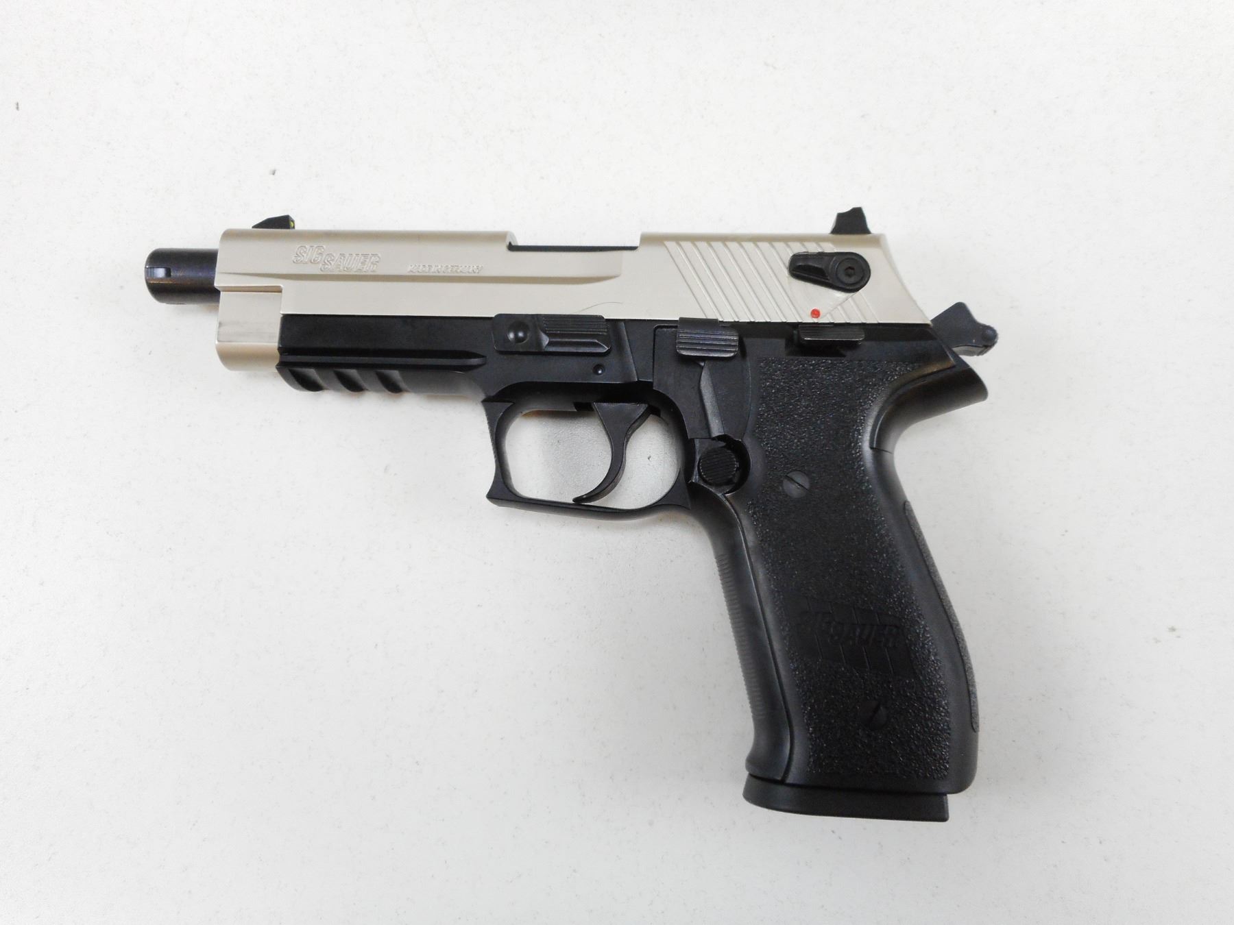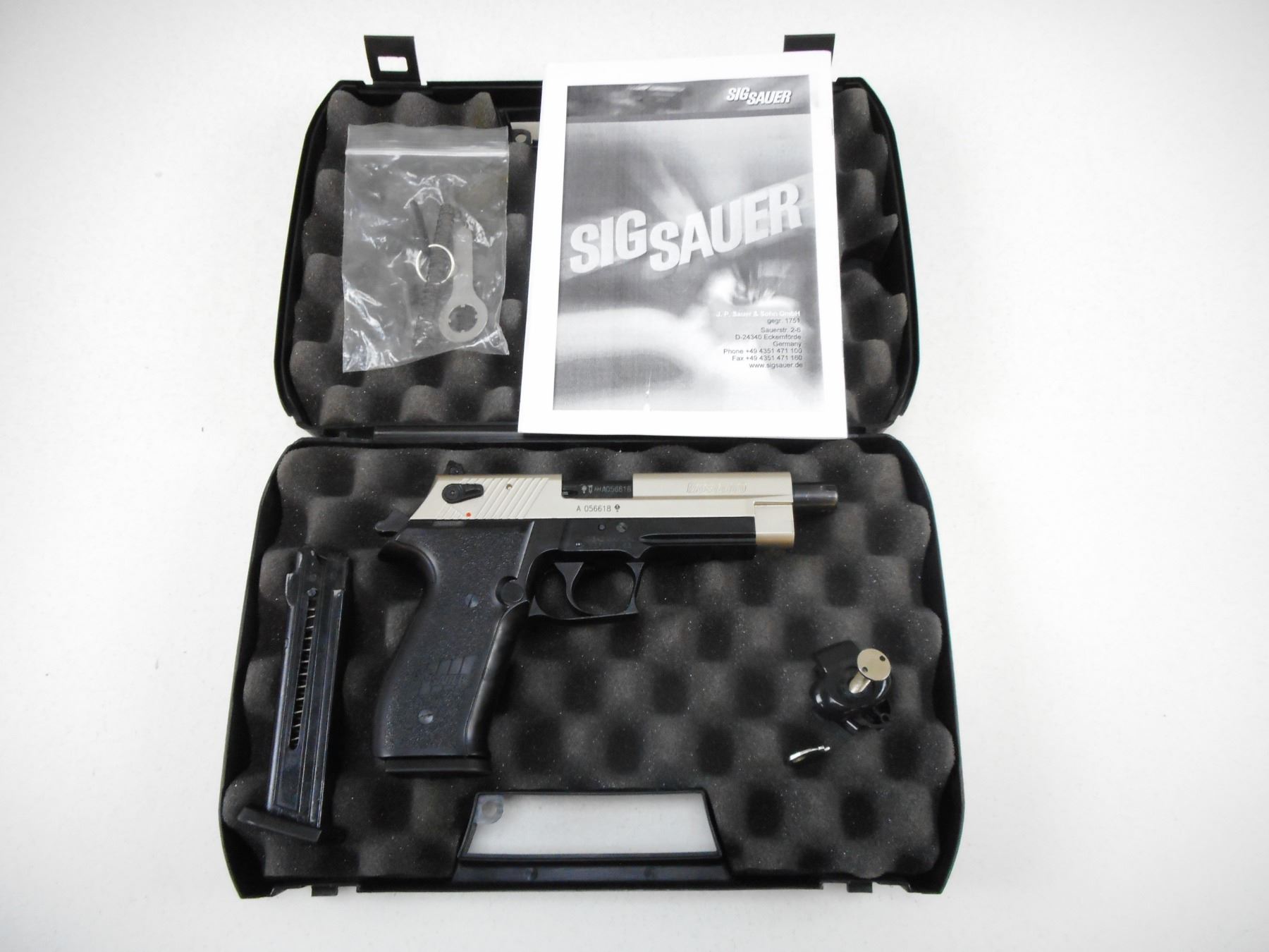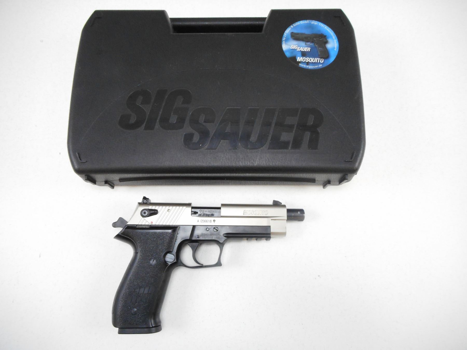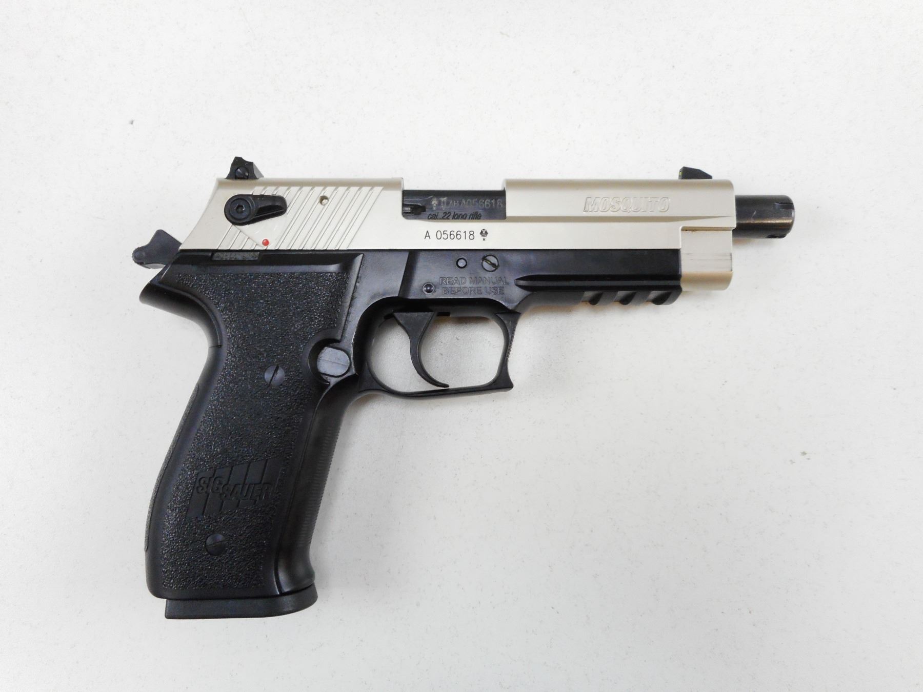 SIG SAUER , MODEL: MOSQUITO , CALIBER: 22 LR , COMES WITH BLACK PLASTIC CASE, 2 MAGAZINES, AND TOOLS, STAINLESS STEEL SLIDE, POLYMER FRAME WITH TEXTURED GRIPS, UNDER BARREL PICATTINY RAIL, ADJUSTABLE NOTCH AND BLADE SIGHTS, EXCELLENT BORE , BARREL LENGTH: 125MM , SERIAL # A056618 , STOCK # 2737 , CONDITION: 9/10 , CLASS: CANADIAN RESTRICTED CLASS