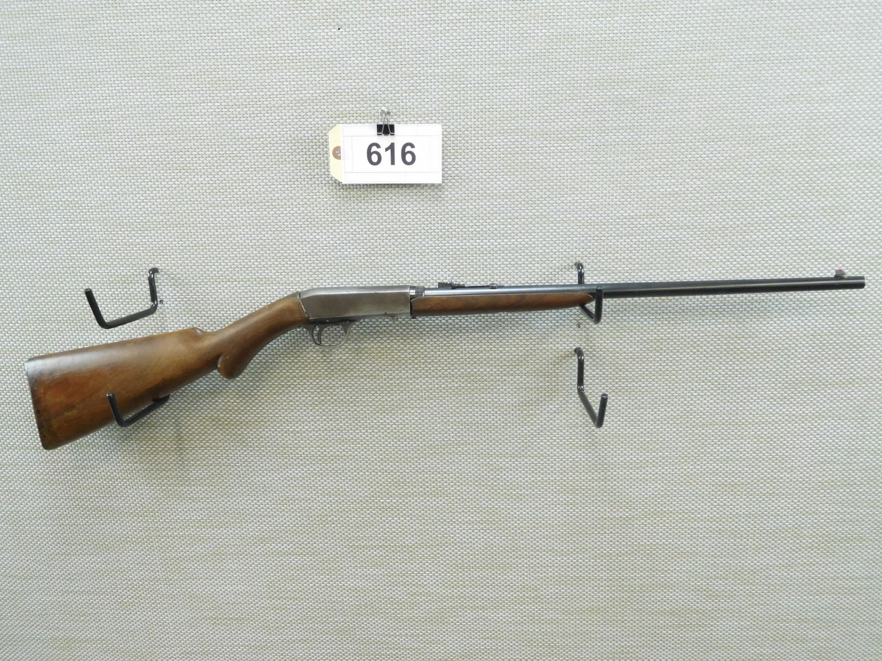 FABRIQUE NATIONAL , MODEL: 22 AUTO , CALIBER: 22 LR , HAS A TUBULAR MAGAZINE IN THE BUTT, CRACKED FOREND, VERY GOOD BORE, DOVETAIL FRONT AND ADJUSTABLE REAR SIGHTS, FOREND IS CRACKED AND CHIPPED AT THE BREACH, BUTT STOCK IS CRACKED AND REPAIRED AT THE WRIST, STEEL BUTT PLATE, SHOWS EXTENSIVE HANDLING MARKS , BARREL LENGTH: 19" , SERIAL # 136755 , STOCK # 7985 , CONDITION: 4/10 , CLASS: CANADIAN NON RESTRICTED CLASS