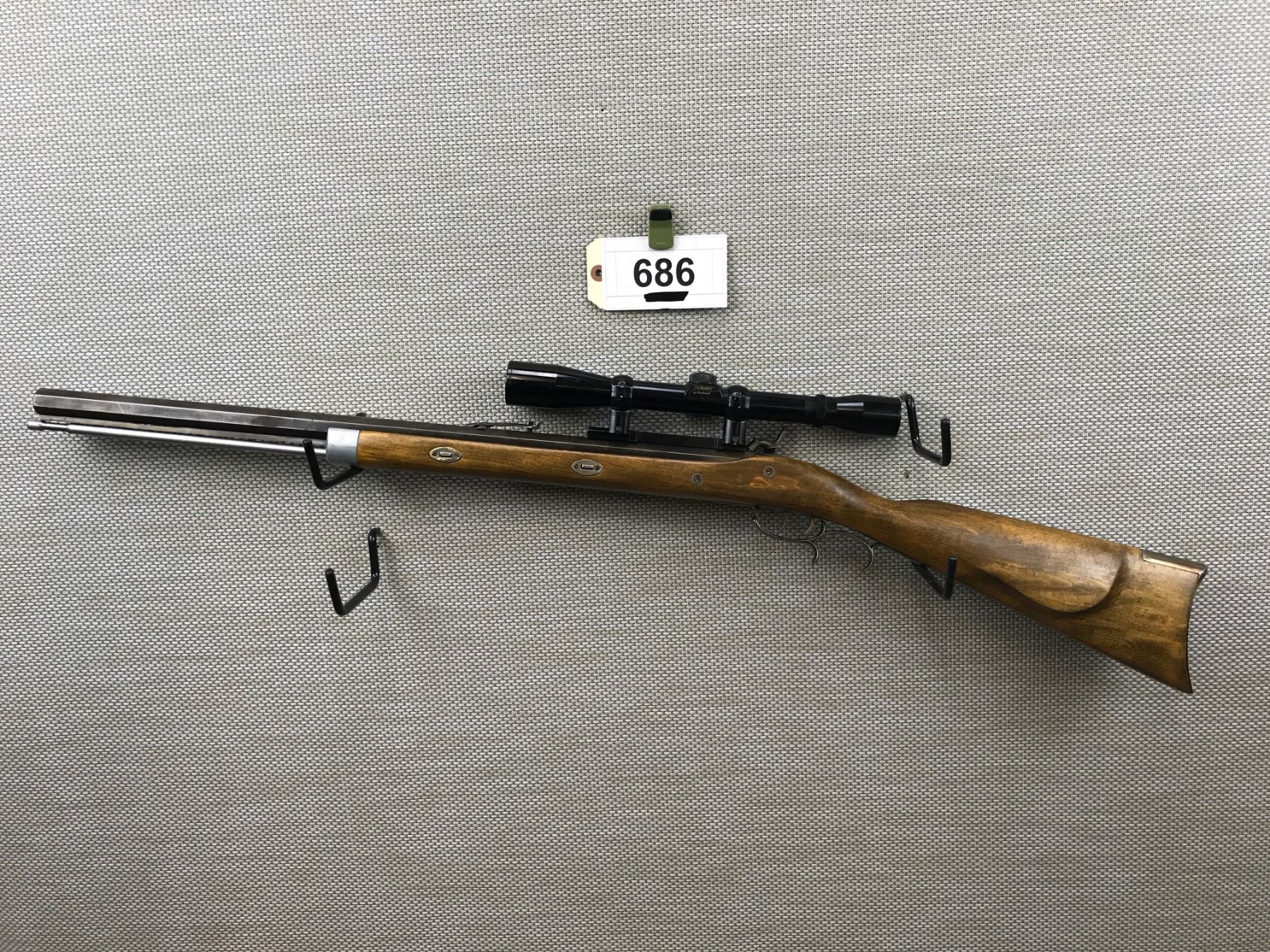 REPRODUCTION PERCUSSION , MODEL: SINGLE SHOT MUZZLE LOADING , CALIBER: 45 CAL PERCUSSION , HEAVY OCTAGONAL BARREL, EQUIPPED WITH A BUSHNELL BANNER 6 POWER SCOPE, NO FRONT SIGHT, ADJUSTABLE REAR SIGHT, HAS A STEEL RAM ROD, ENGRAVED SIDE LOCK, BRASS PATCH BOX, SET TRIGGER, SHOWS SOME HANDLING MARKS , BARREL LENGTH: 24" , SERIAL # N/A , STOCK # 8055 , CONDITION: 6/10 , CLASS: CANADIAN NON RESTRICTED CLASS