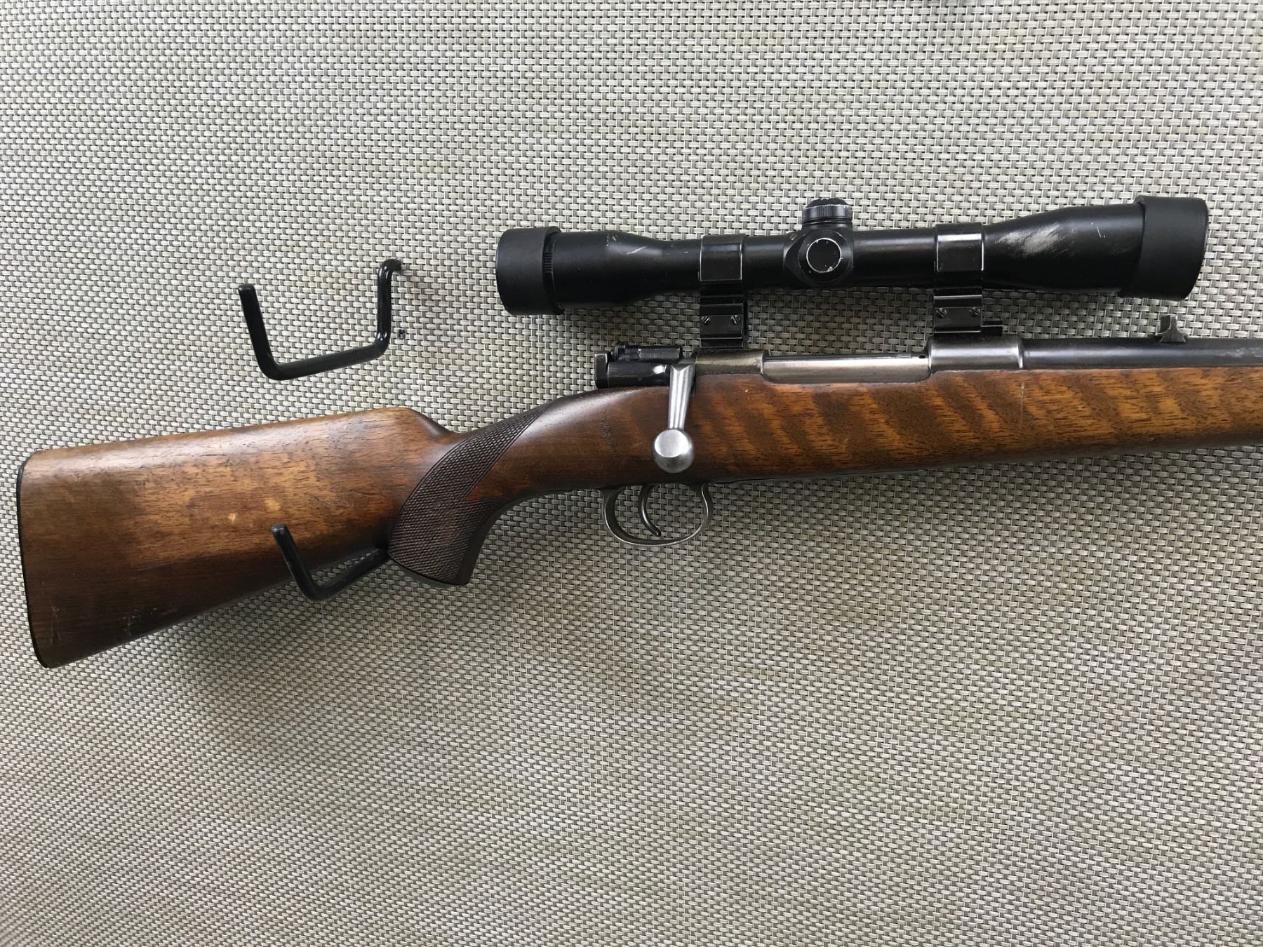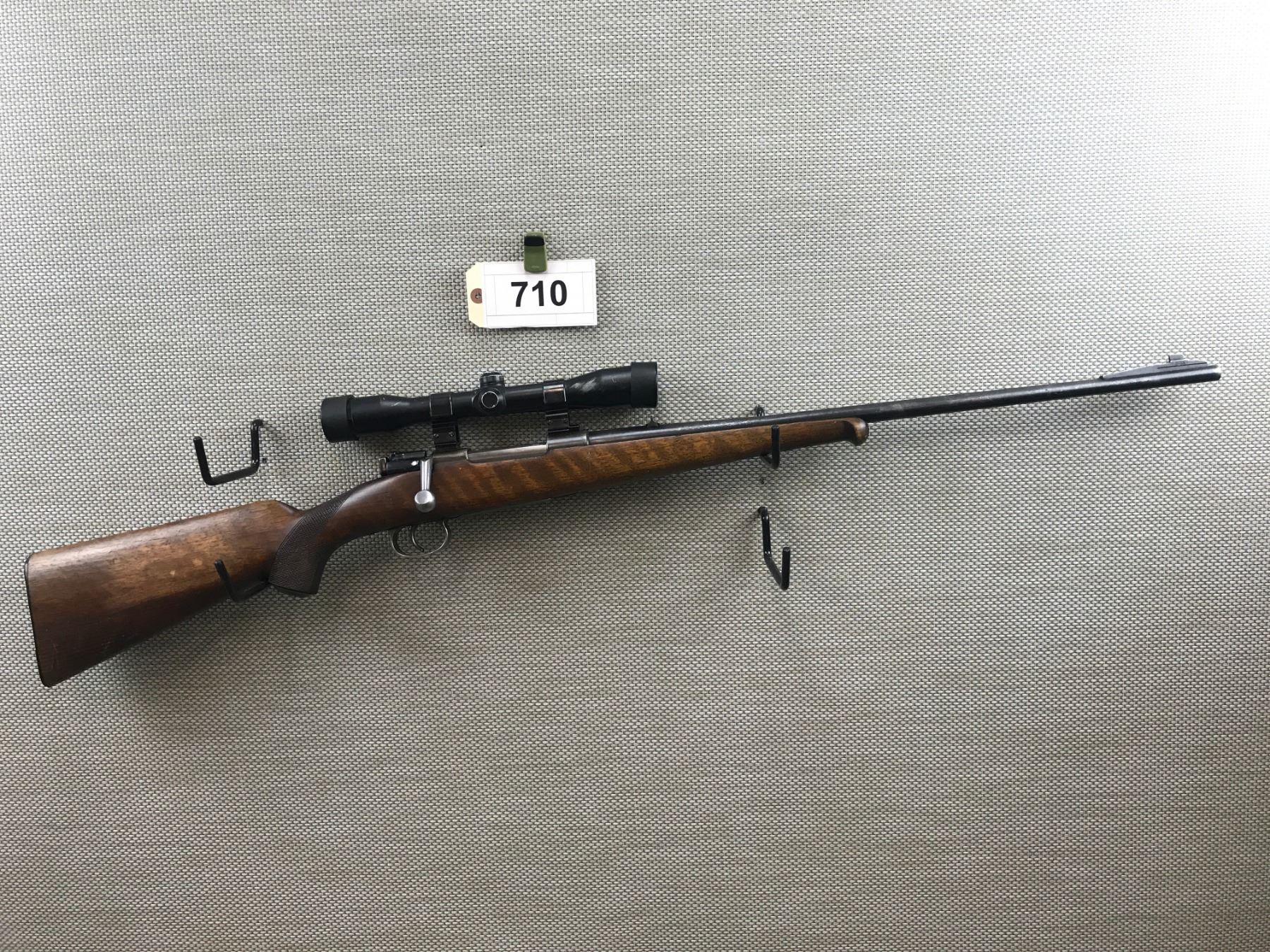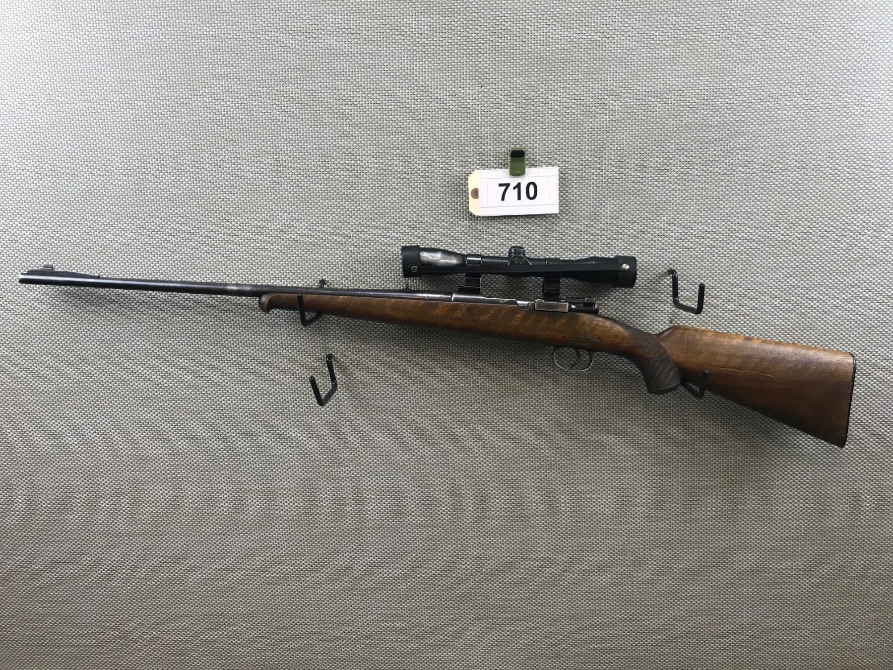 MAUSER , MODEL: STIGA M96 SPORTER , CALIBER: 30-06 SPRG , BORE IS VERY GOOD, CHECKERED CAPPED PISTOL GRIP BUTT STOCK WITH PLASTIC BUTT PLATE, SHOWS SOME HANDLING MARKS, RAMP FRONT AND FIXED REAR SIGHTS, ALSO FEATURES A HUBERTUS 4 X SCOPE ON WEAVER MOUNTS , BARREL LENGTH: 24" , SERIAL # 109477 , STOCK # 8079 , CONDITION: 5/10 , CLASS: CANADIAN NON RESTRICTED CLASS