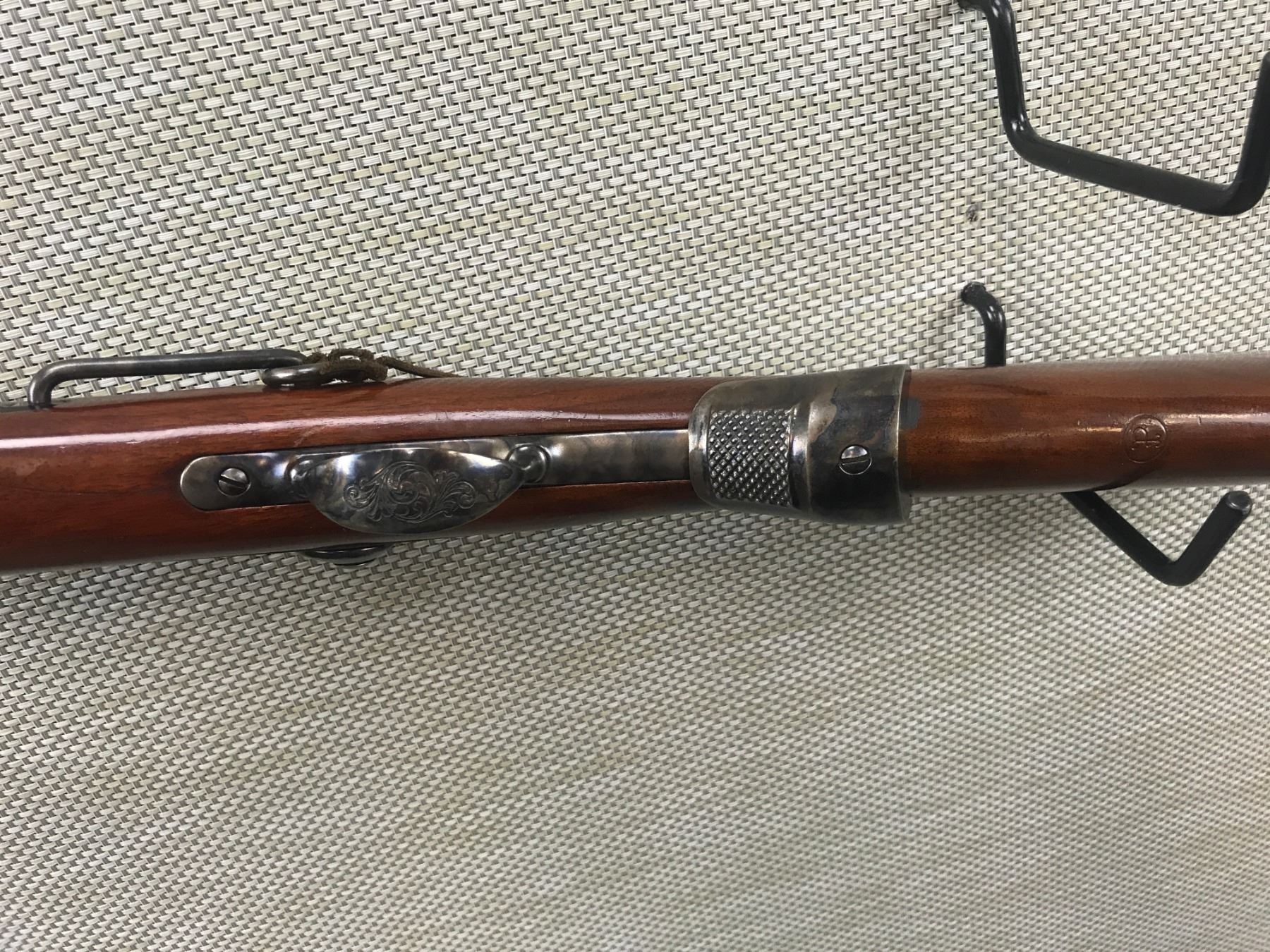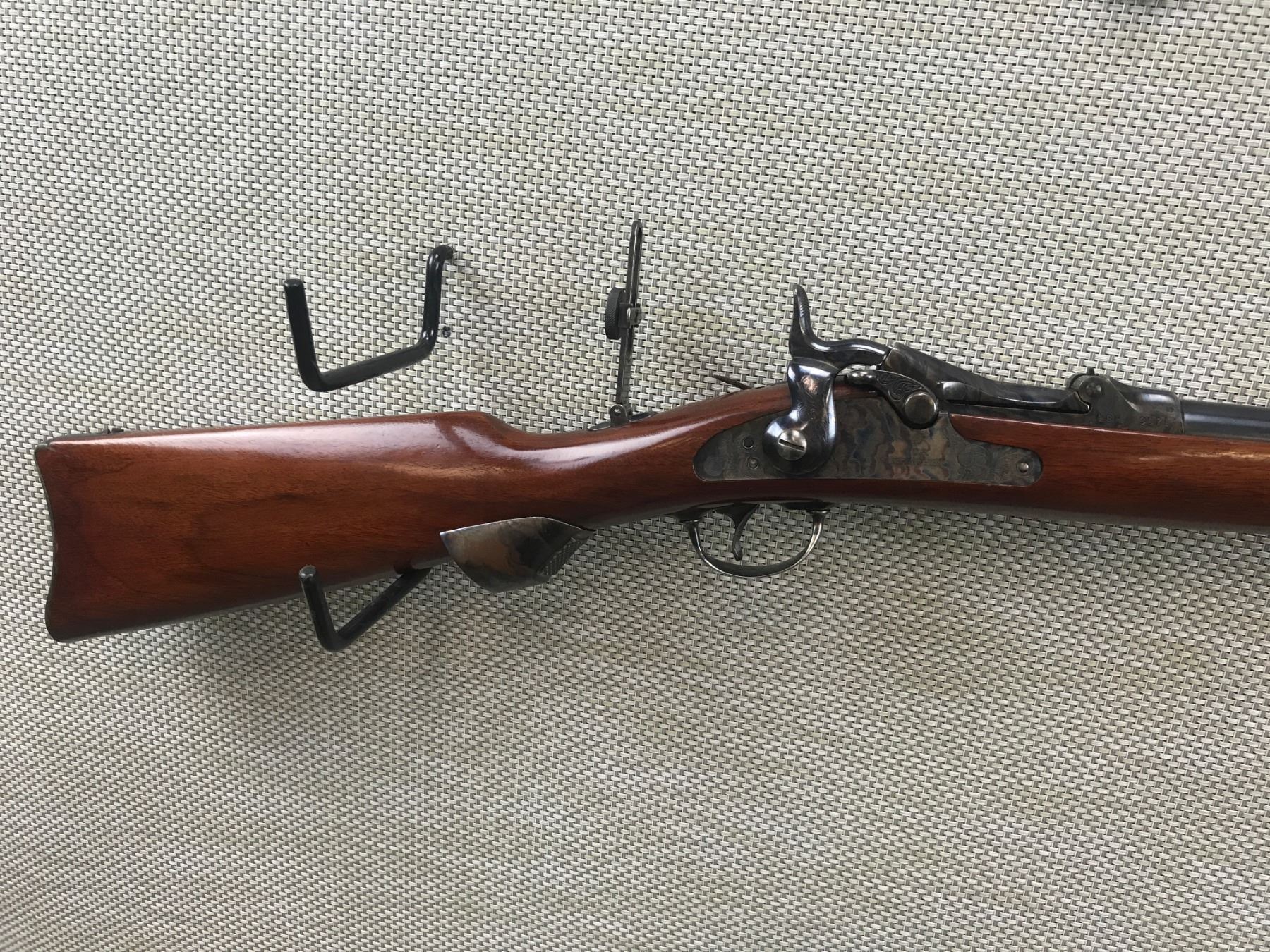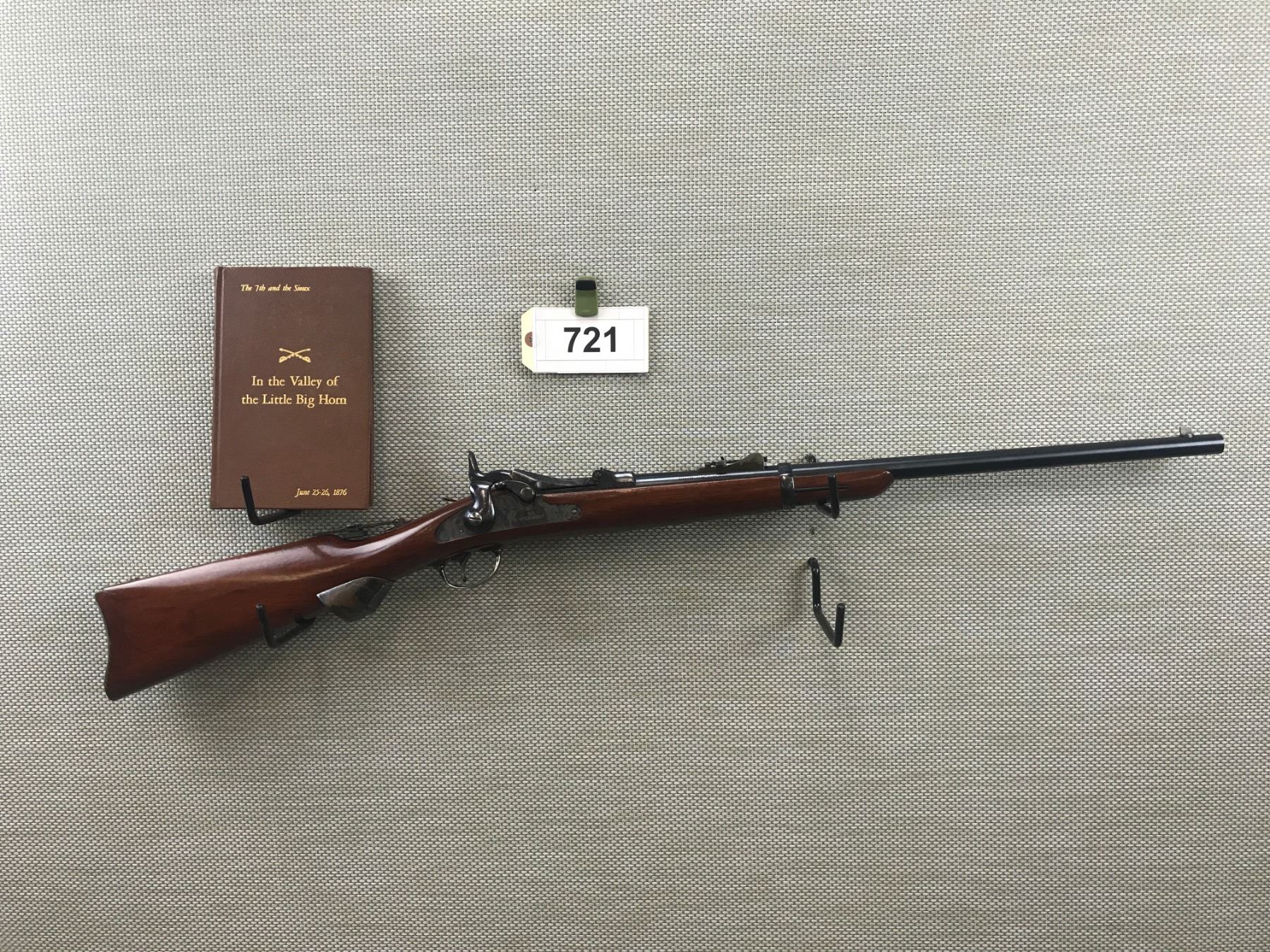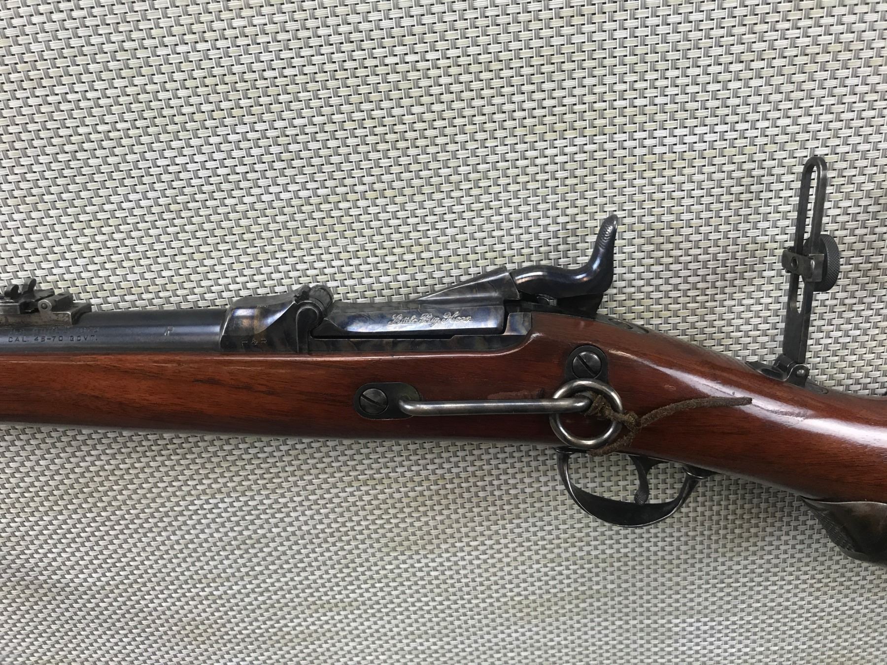 US SPRINGFIELD , MODEL: COPY OF 1873 REMINGTON , CALIBER: 45-70 GOVT , COMES WITH BOOK,MANUFACTURED BY HARRINGTON & RICHARDSON, ALSO MARKED LITTLE BIG HORN, BORE IS EXCELLENT, CASE HARDENED RECEIVER AND LOCK PLATE, SADDLE RING, VERNIER PEEP SIGHT WITH FRONT DOVETAIL AND MID ADJUSTABLE SIGHTS, EXTENDED SEMI PISTOL GRIP STEEL BUTT PLATE MARKED US, AS NEW CONDITION , BARREL LENGTH: 22" , SERIAL # LBH3071 , STOCK # 8090 , CONDITION: 9/10 , CLASS: CANADIAN NON RESTRICTED CLASS