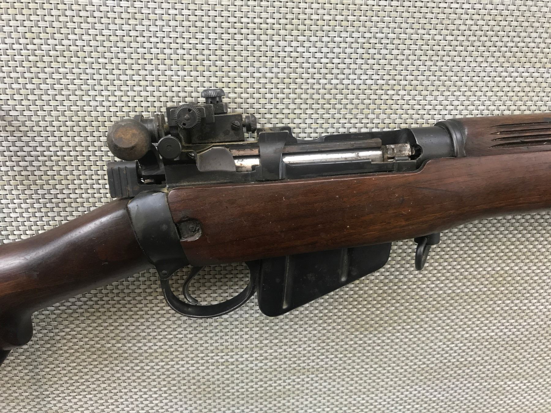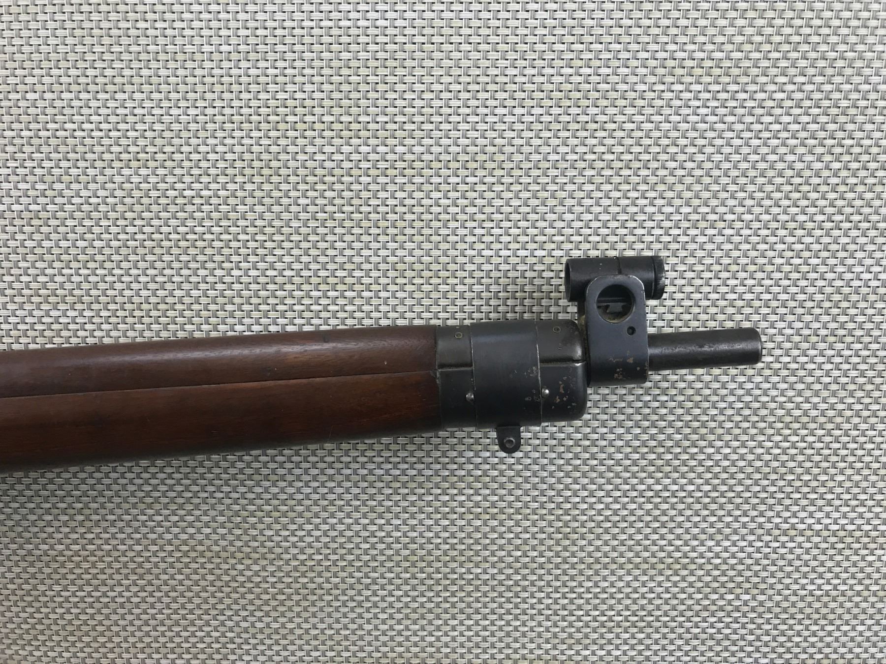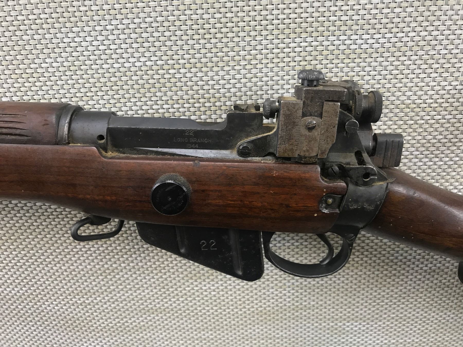 LEE ENFIELD , MODEL: C NO 7 MK 1 , CALIBER: 22 LR , COMES WITH MAGAZINE MARKED 22, LEE ENFIELD DESIGNED FOR TRAINING, MADE BY LONG BRANCH, HAS A HOODED FRONT AND PARKER HALE 5C REAR SIGHT, MISSING THE REAR SAFETY, RETAINS FULL MILITARY CONFIGURATION, SHOWS SOME HANDLING MARKS AND LIGHT SURFACE RUST ON SOME AREAS , BARREL LENGTH: 25 1/2" , SERIAL # 0L5293 , STOCK # 8104 , CONDITION: 6/10 , CLASS: CANADIAN NON RESTRICTED CLASS