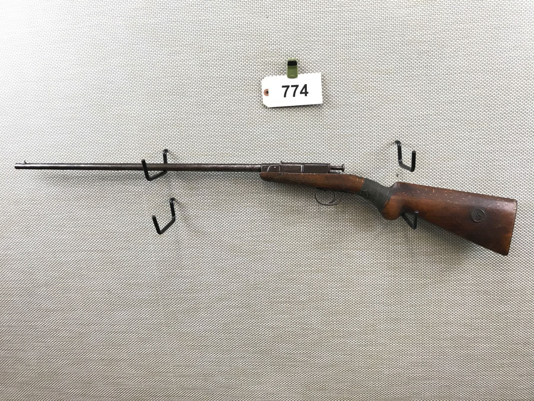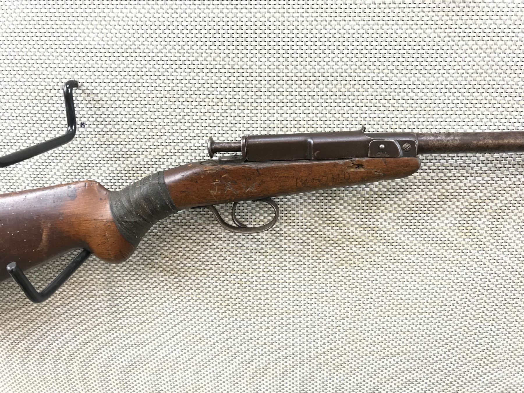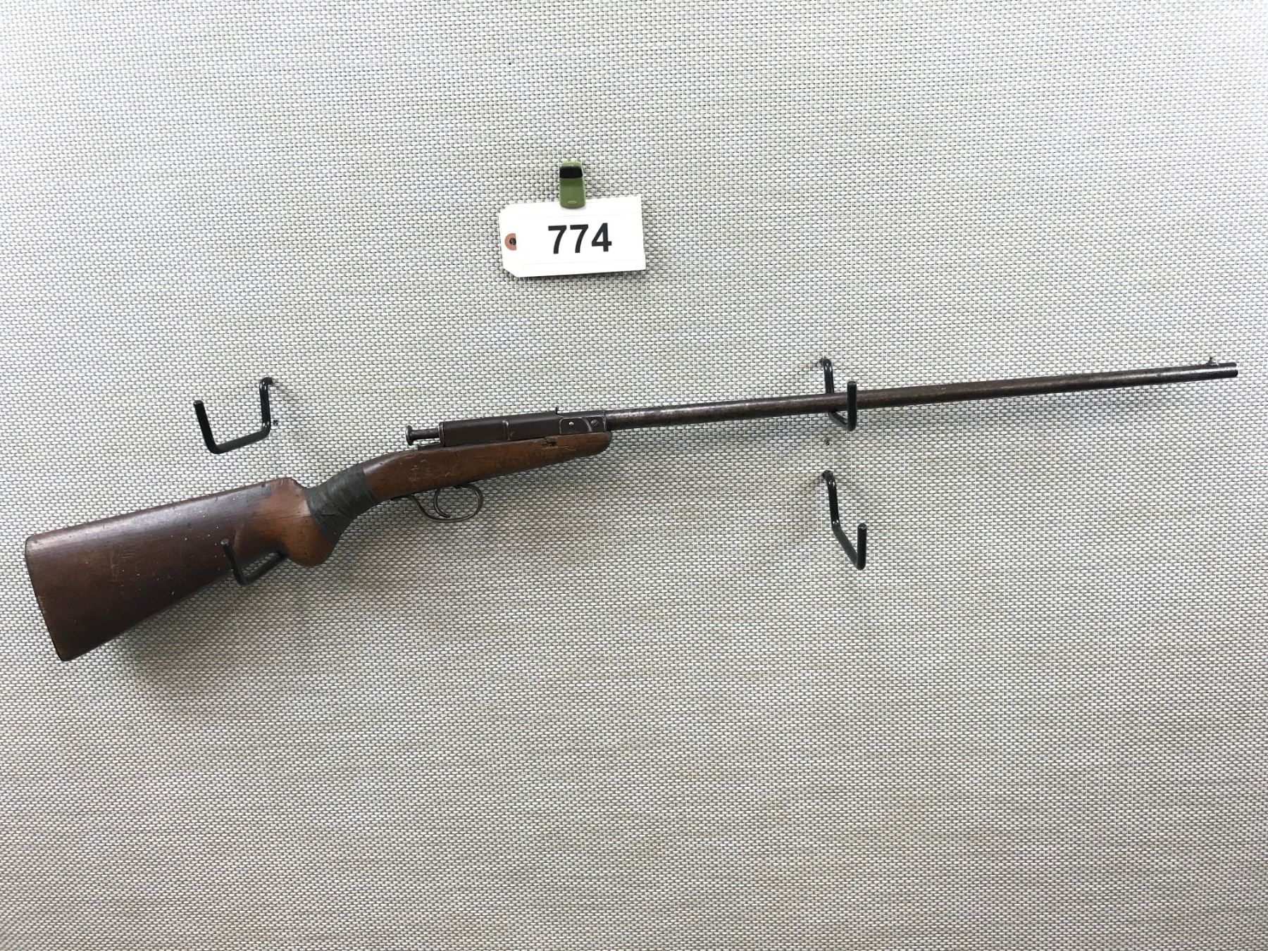 DEUTCHE WERKE , MODEL: 1 , CALIBER: 22 LR , HAS A DARK BORE, PITTED BARREL, STOCK IS CRACKED AND CHIPPED AT THE WRIST AND RETAINED BY TAPE, STOCK IS ALSO CHIPPED AND CRACKED AT THE FOREND, INITIALS ARE CARVED INTO THE STOCK, EXTENSIVE HANDLING MARKS , BARREL LENGTH: 22 3/4" , SERIAL # N/A , STOCK # 8143 , CONDITION: 2/10 , CLASS: CANADIAN NON RESTRICTED CLASS