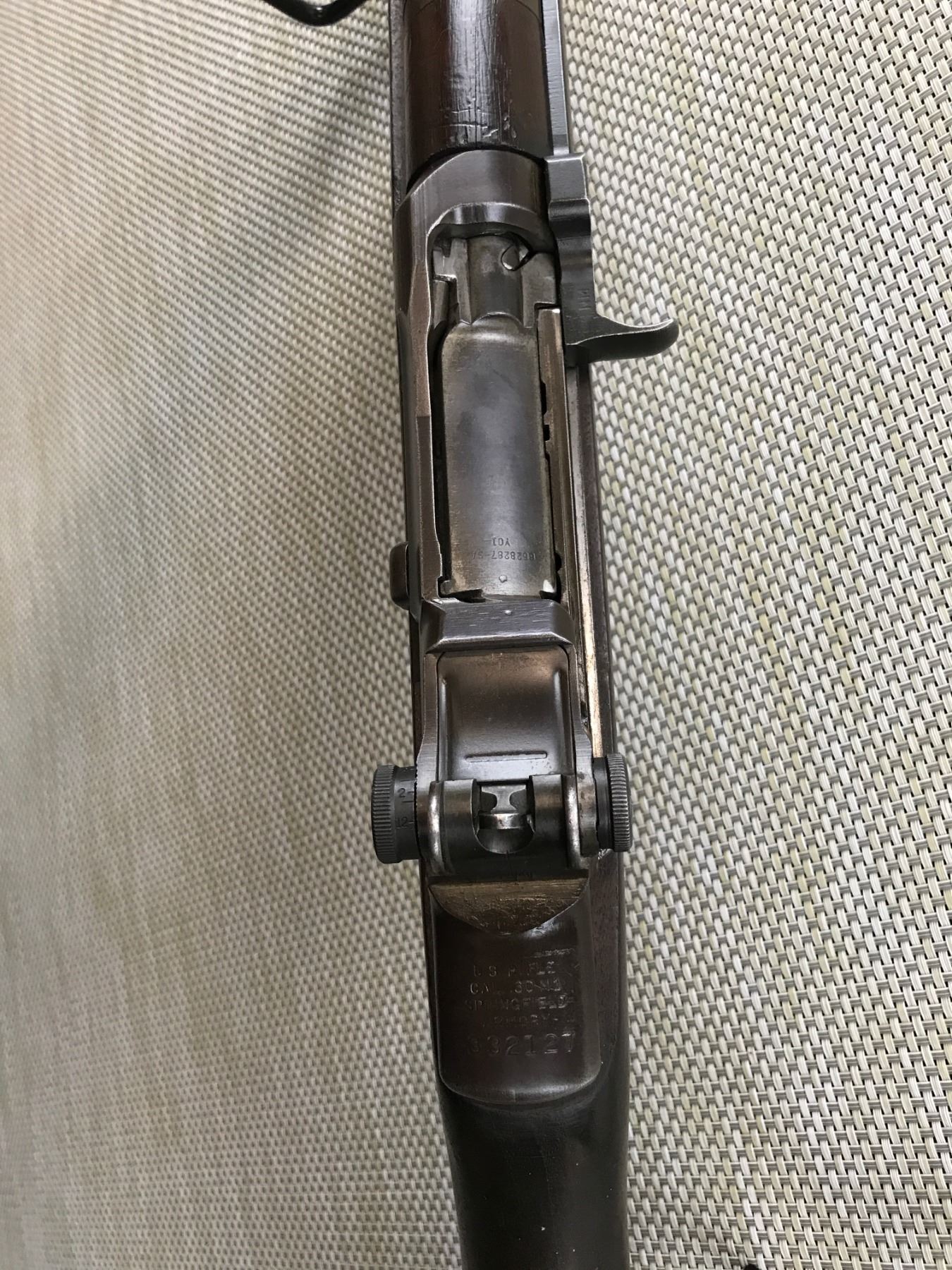 US SPRINGFIELD ARMORY , MODEL: M1 GARAND , CALIBER: 30 M1 , LOW DIGIT SERIAL #, BORE IS GOOD WITH SCATTERED VERY LIGHT PITTING, BARLEY CORN FRONT AND PEEP REAR SIGHT, SHOWS SOME HANDLING MARKS, SLING SWIVEL LOOPS, STEEL BUTT PLATE WITH TRAP DOOR , BARREL LENGTH: 24" , SERIAL # 332127 , STOCK # 8164 , CONDITION: 6/10 , CLASS: CANADIAN NON RESTRICTED CLASS