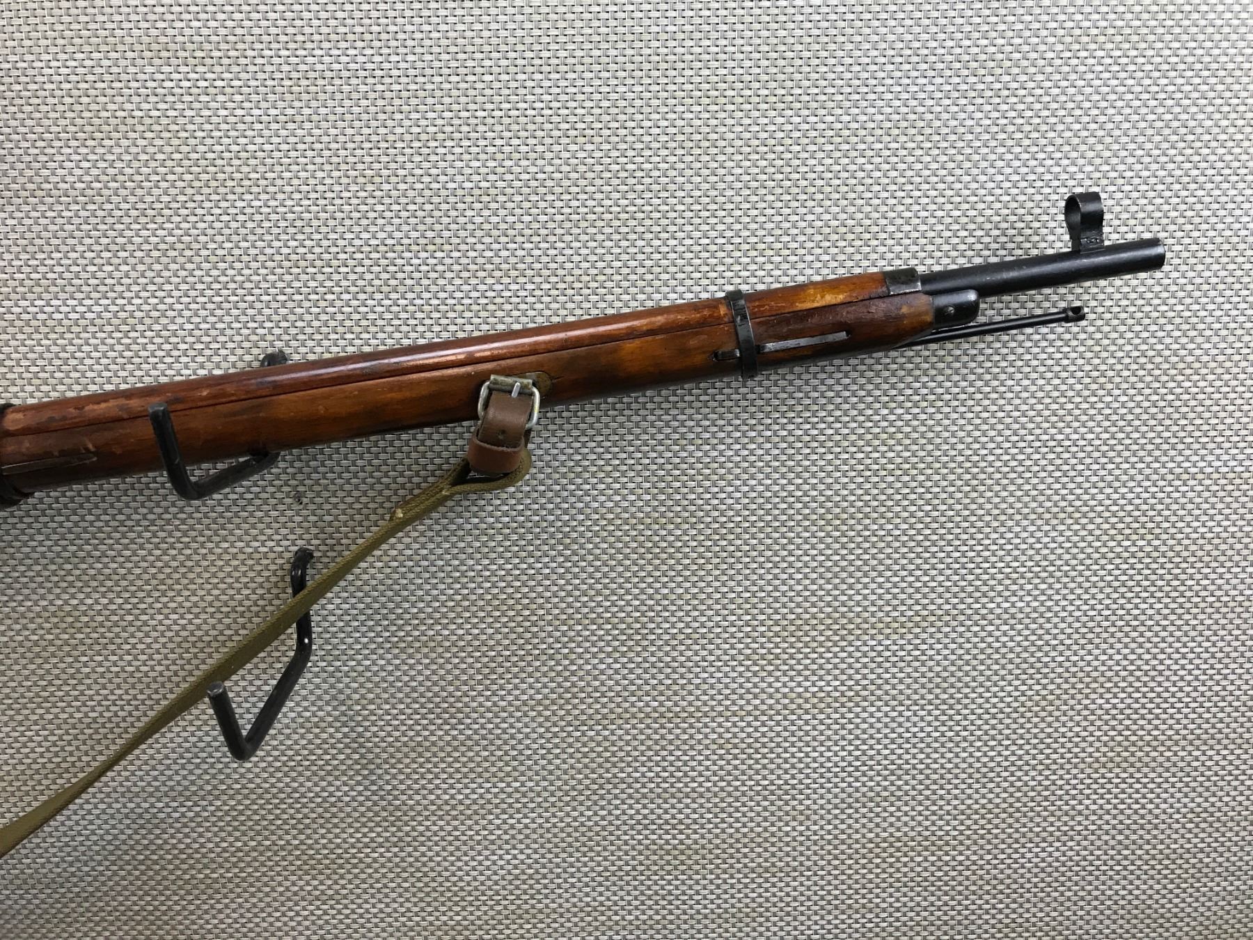 MOSIN NAGANT , MODEL:1928 DRAGOON, CALIBER: 7.62 X 54R , BOLT , STOCK AND RECEIVER MATCH BY SERIAL # , HAS ORIGINAL RUSSIAN STOCK, VERY GOOD BORE, HOODED FRONT AND ADJUSTABLE REAR SIGHTS, RETAINS FULL MILITARY CONFIGURATION, ORIGINAL LEATHER AND CANVAS SLING, SHOWS VERY LITTLE HANDLING MARKS, A MOSIN EXPERT HAS TOLD ME THAT THE MODEL 91/30 EVOLVED FROM THE DRAGOON MODEL SHORT RIFLE DURING THE 1920'S AND THE 1928 DATED VERSION WAS A PART OF THAT EVOLUTION UNTIL THE FINAL VERSION EMERGED AS THE 91/30 SHORT RIFLE BARREL LENGTH: 30" , SERIAL # N84465 , STOCK # 8187 , CONDITION: 8/10 , CLASS: CANADIAN NON RESTRICTED CLASS