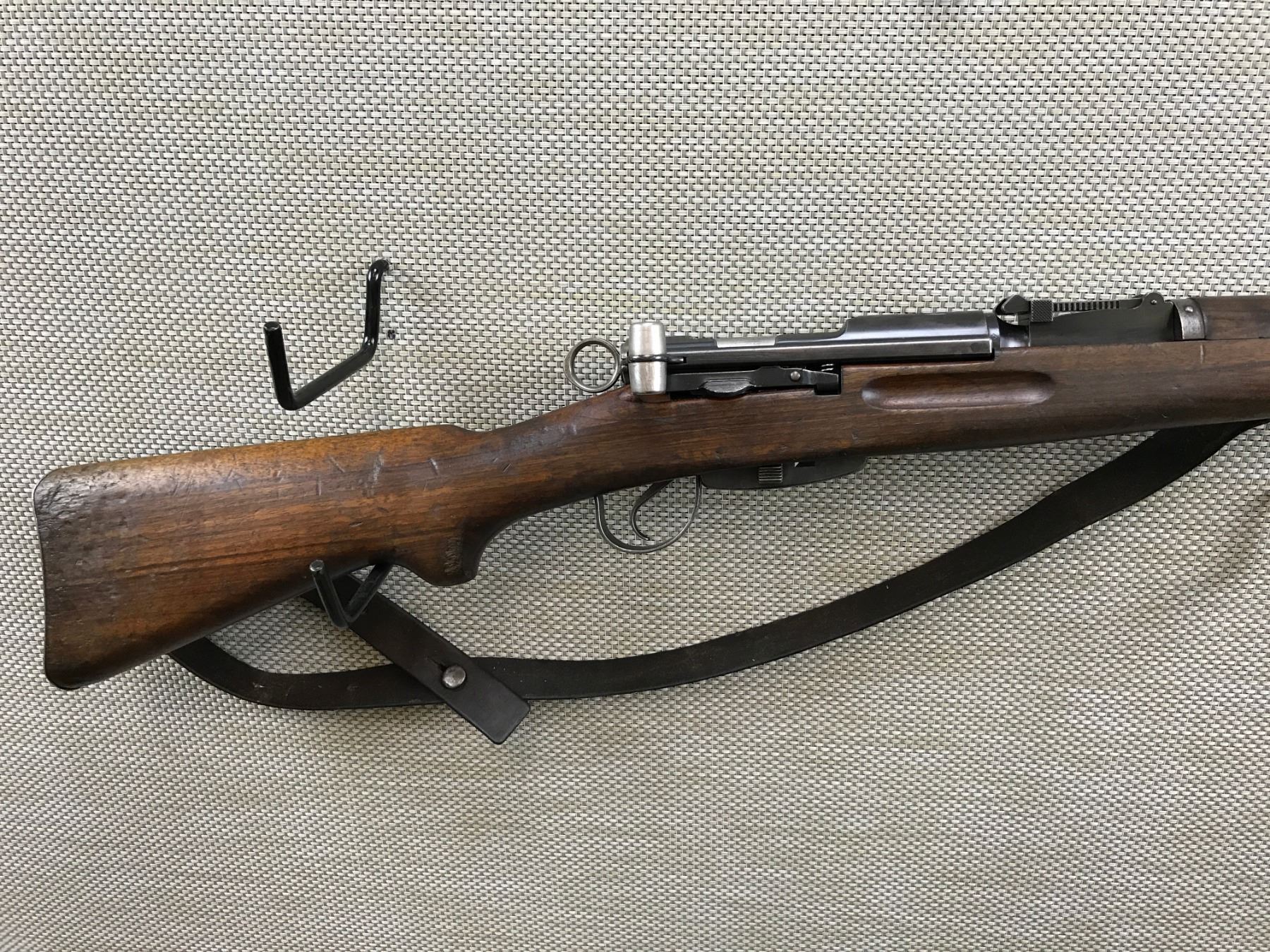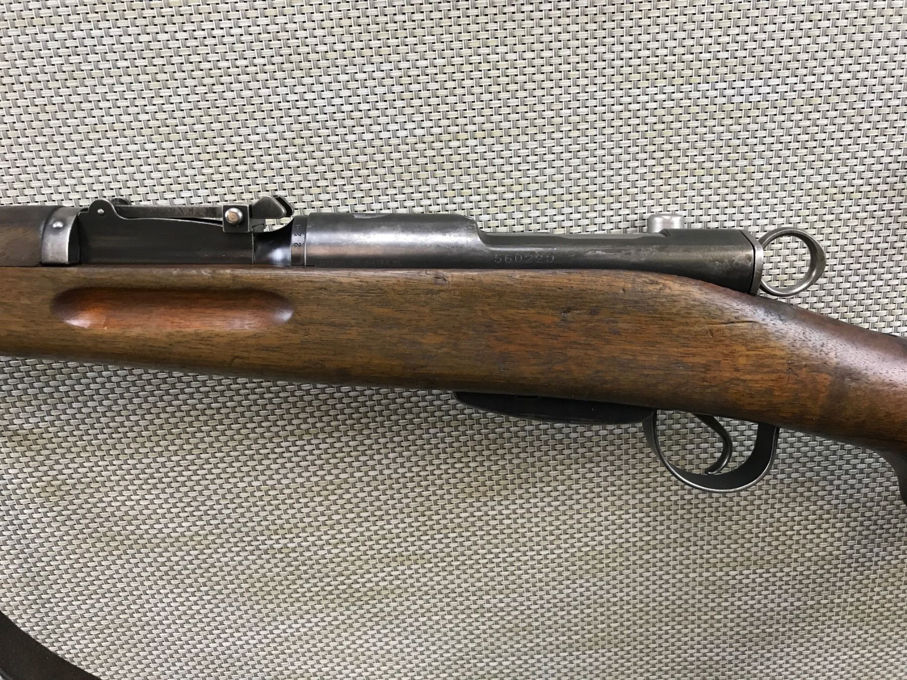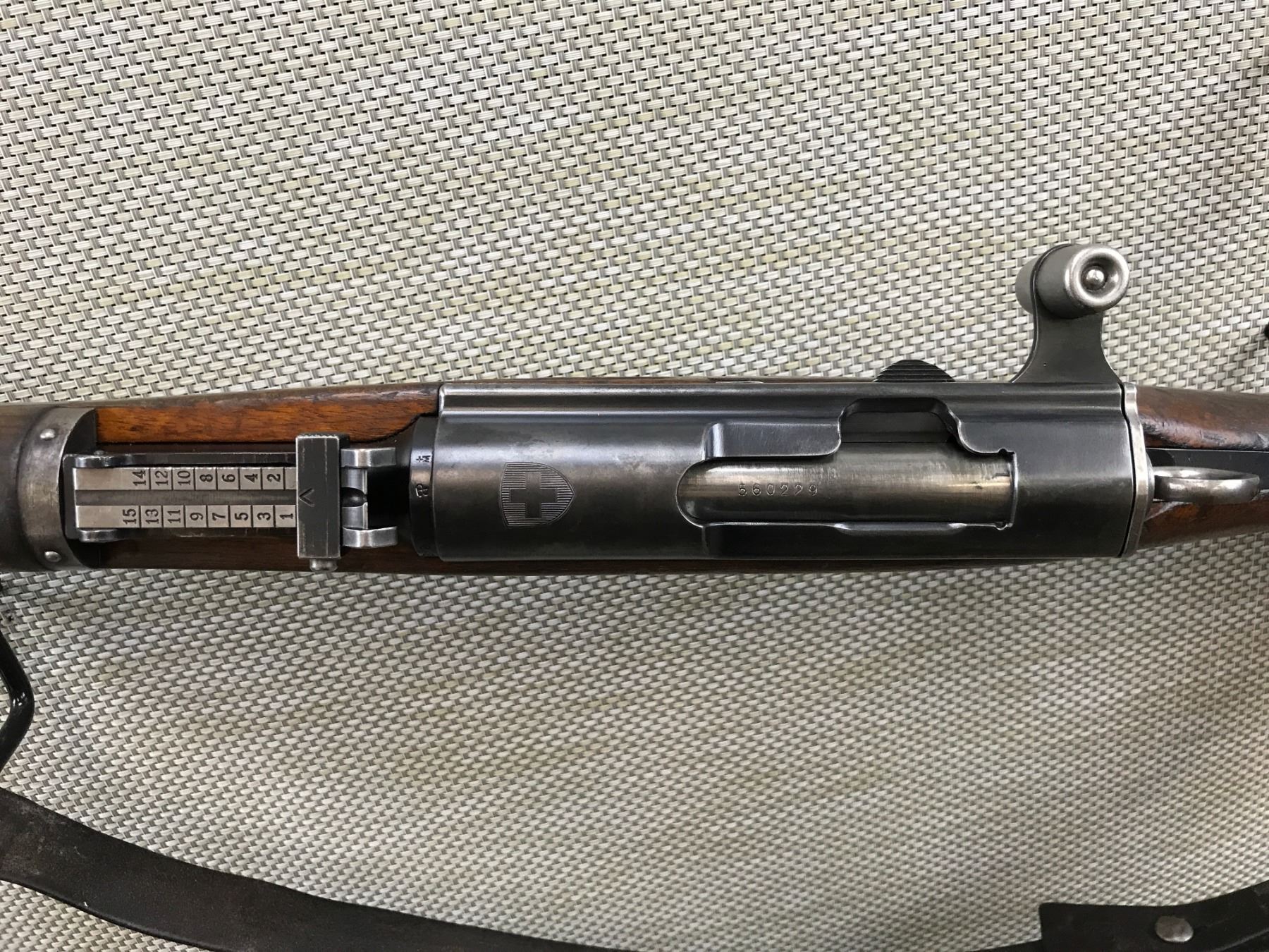 SWISS RIFLE , MODEL: K31 , CALIBER: 7.5 SWISS , RECEIVER AND BOLT MATCH BY SERIAL # , EXCELLENT BORE, BARLEY CORN FRONT SIGHT WITH MUZZLE PROTECTOR, ADJUSTABLE REAR SIGHT, ORIGINAL LEATHER SLING, FEATURES A SWISS CROSS ON THE RECEIVER, ALLEGEDLY TO MOST ACCURATE BOLT ACTION RIFLE EVER MADE VERY DESIRABLE , BARREL LENGTH: 25" , SERIAL # 560229 , STOCK # 8196 , CONDITION: 8/10 , CLASS: CANADIAN NON RESTRICTED CLASS