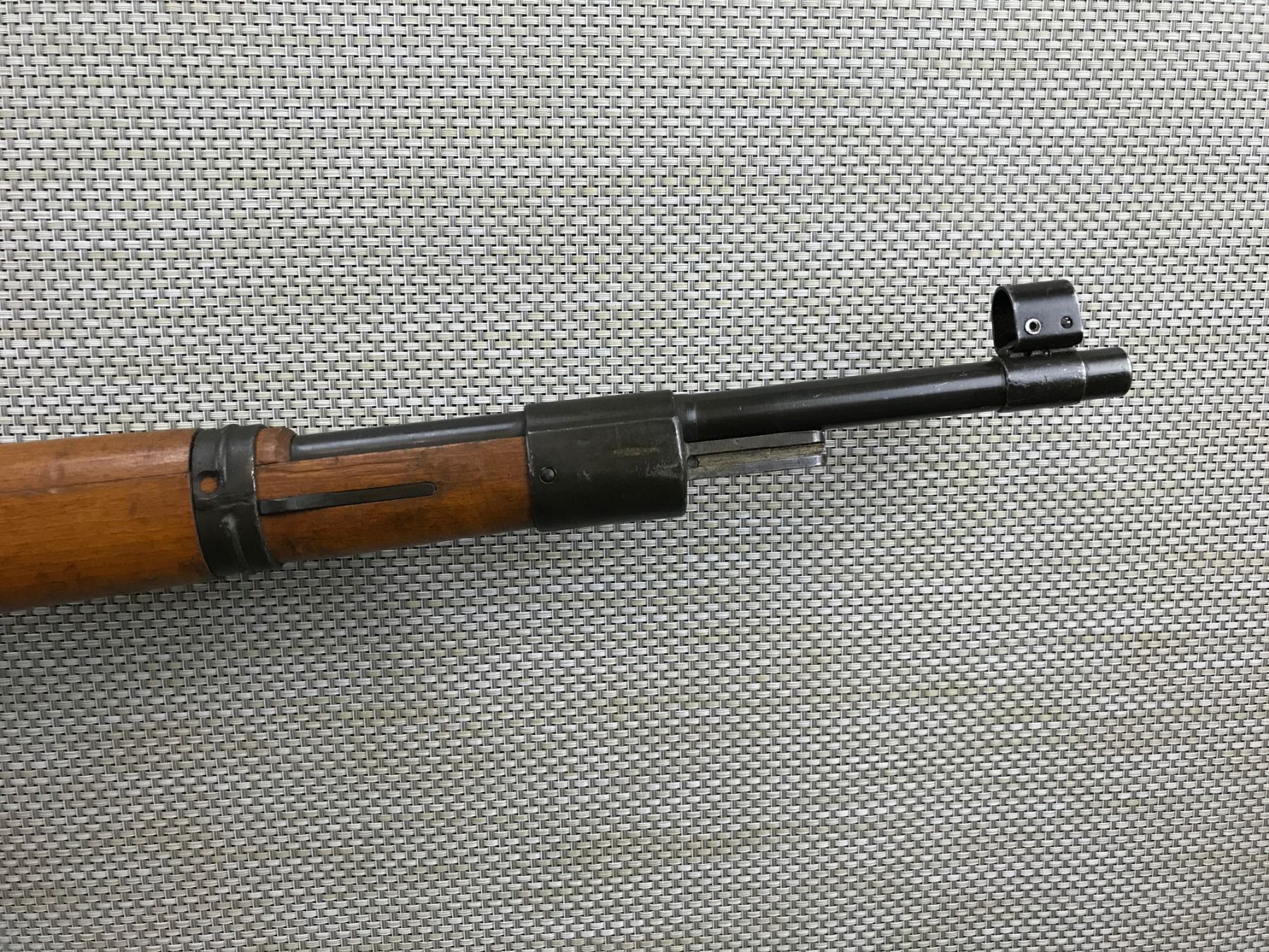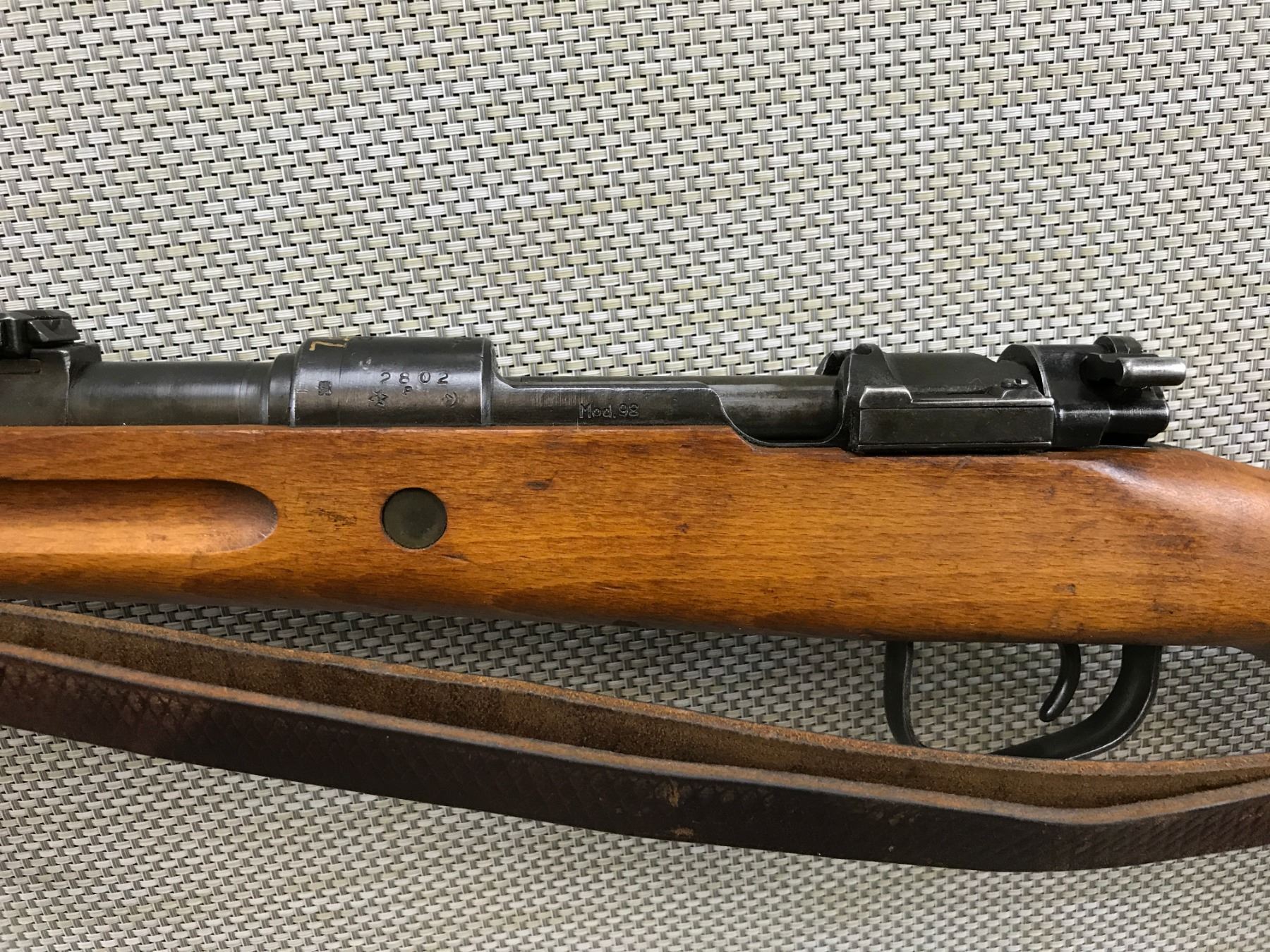 WWII ERA MAUSER , MODEL: 98 , CALIBER: 7.62 X 51 NATO , WWII ERA MANUFACTURED IN 1945 BY WAFFENWERKE BRUNN IN CZECH, REWORKED IN ISREAL, RETAINS SOME ORIGINAL GERMAN MILITARY MARKINGS, FEATURES THE WINTER TRIGGER GUARD, RECEIVER AND BOLT DON'T MATCH BY SERIAL #, EXCELLENT BORE, HOODED FRONT AND ADJUSTABLE REAR SIGHT, LEATHER SLING APPEARS TO BE ORIGINAL, SHOWS SOME HANDLING MARKS, STEEL BUTT PLATE , BARREL LENGTH: 24" , SERIAL # 2802 , STOCK # 8197 , CONDITION: 7/10 , CLASS: CANADIAN NON RESTRICTED CLASS