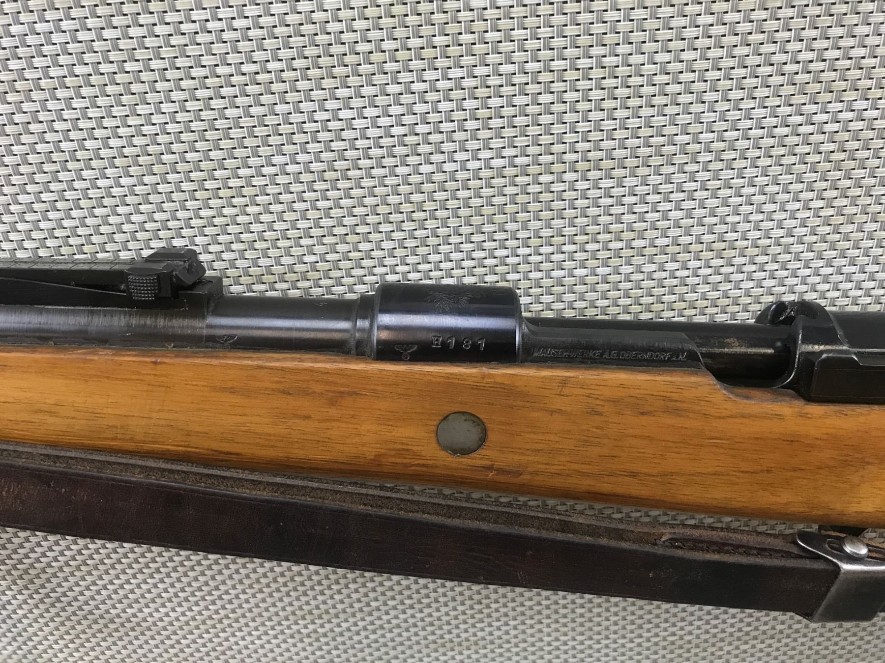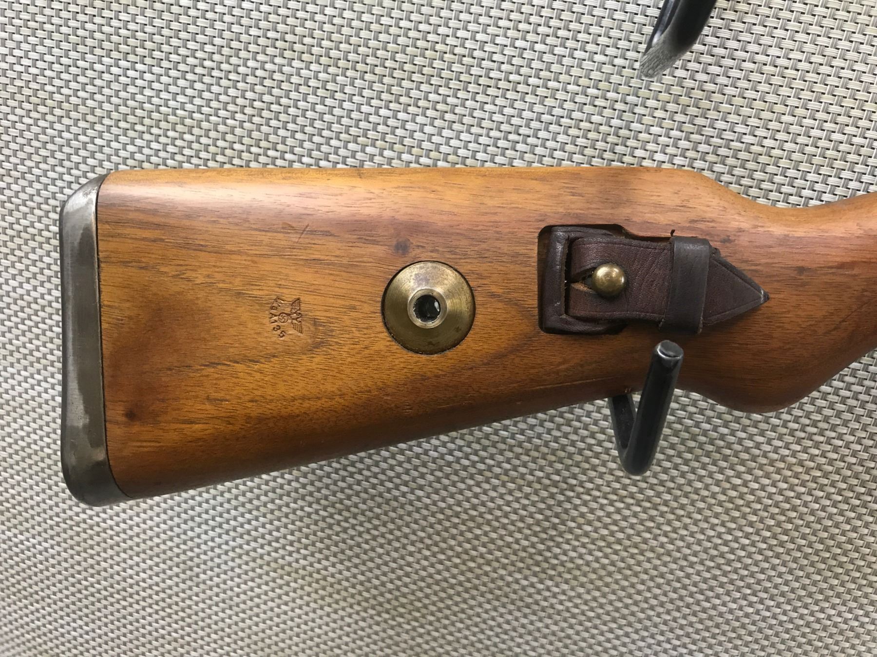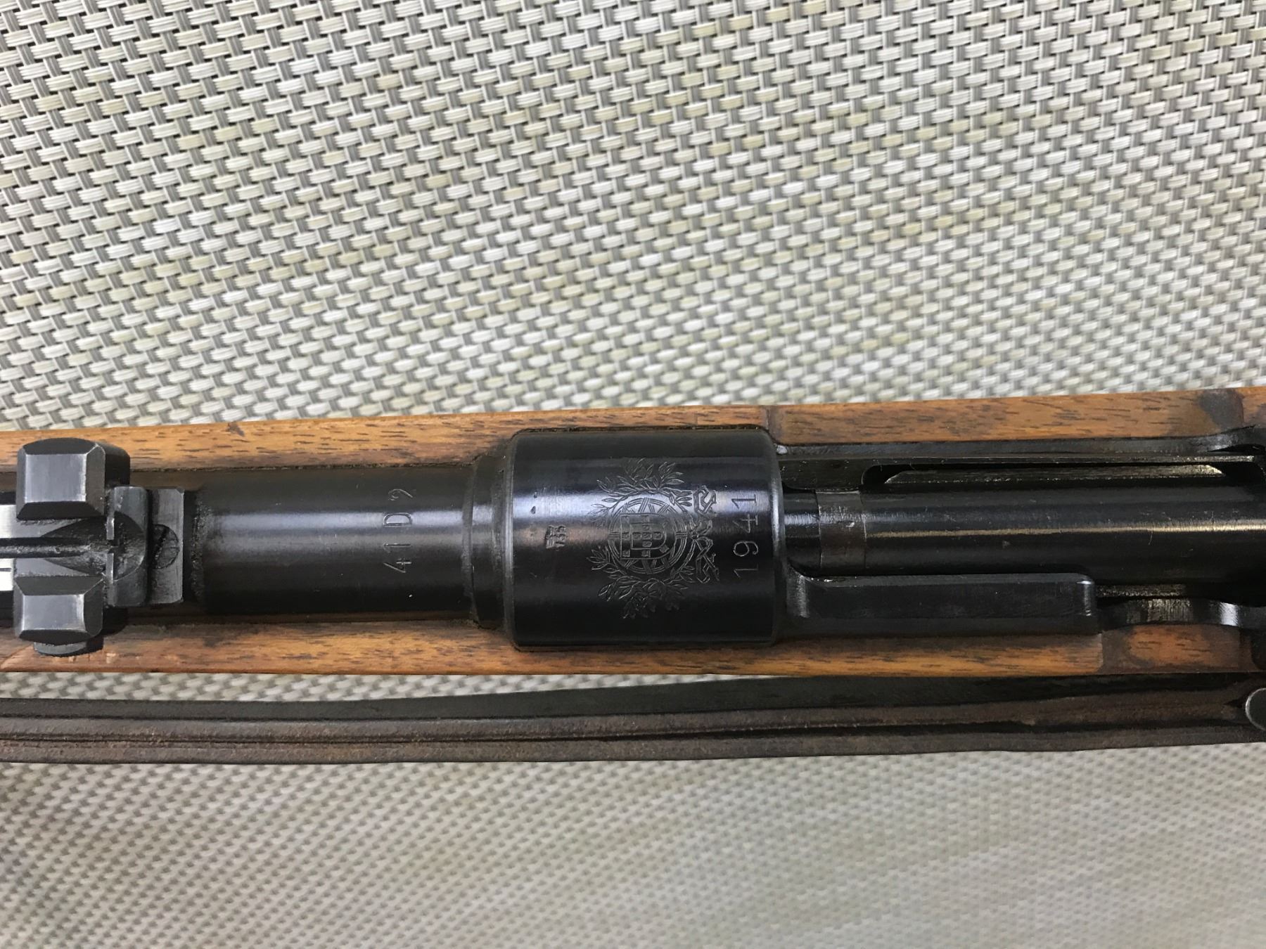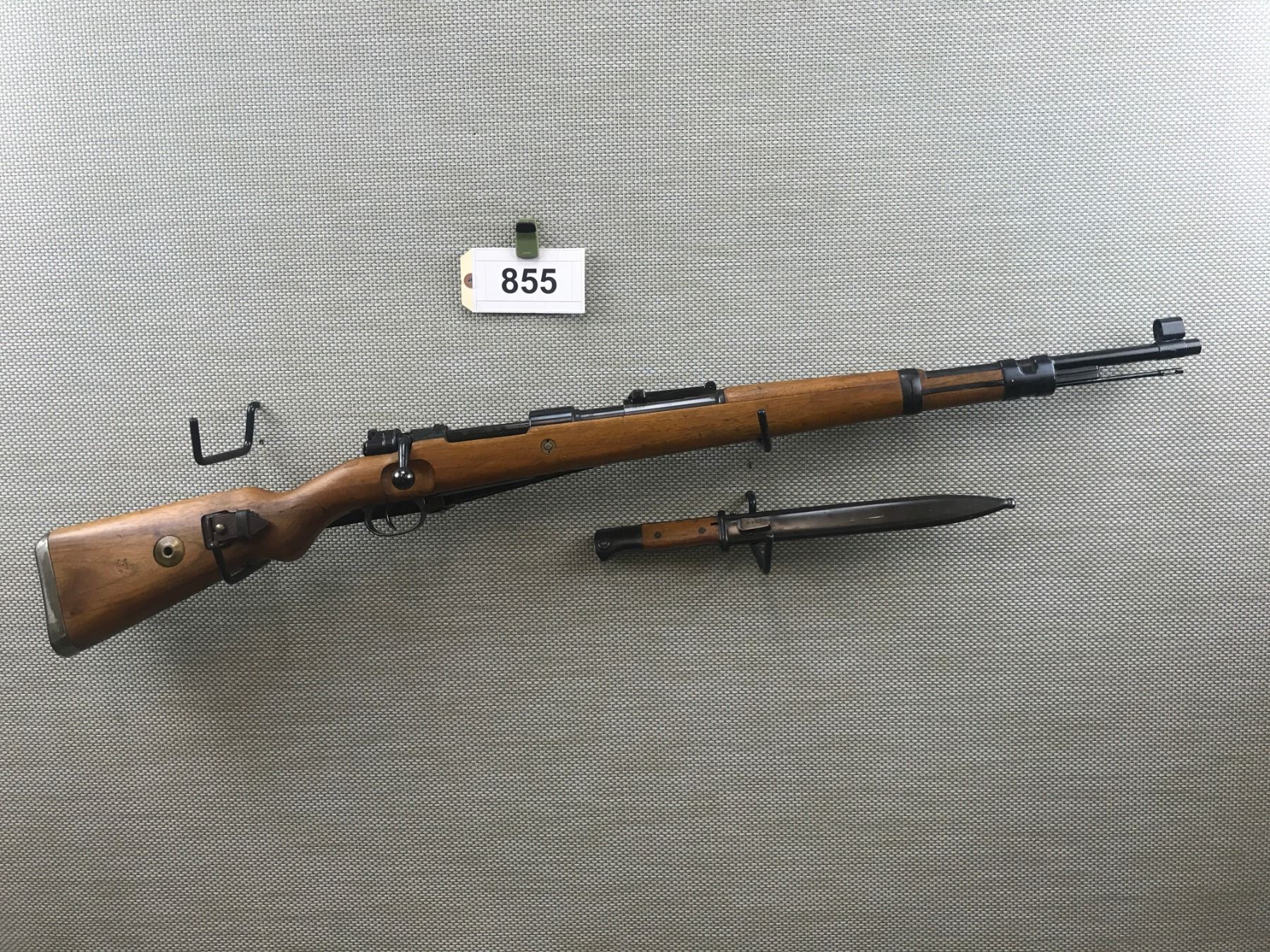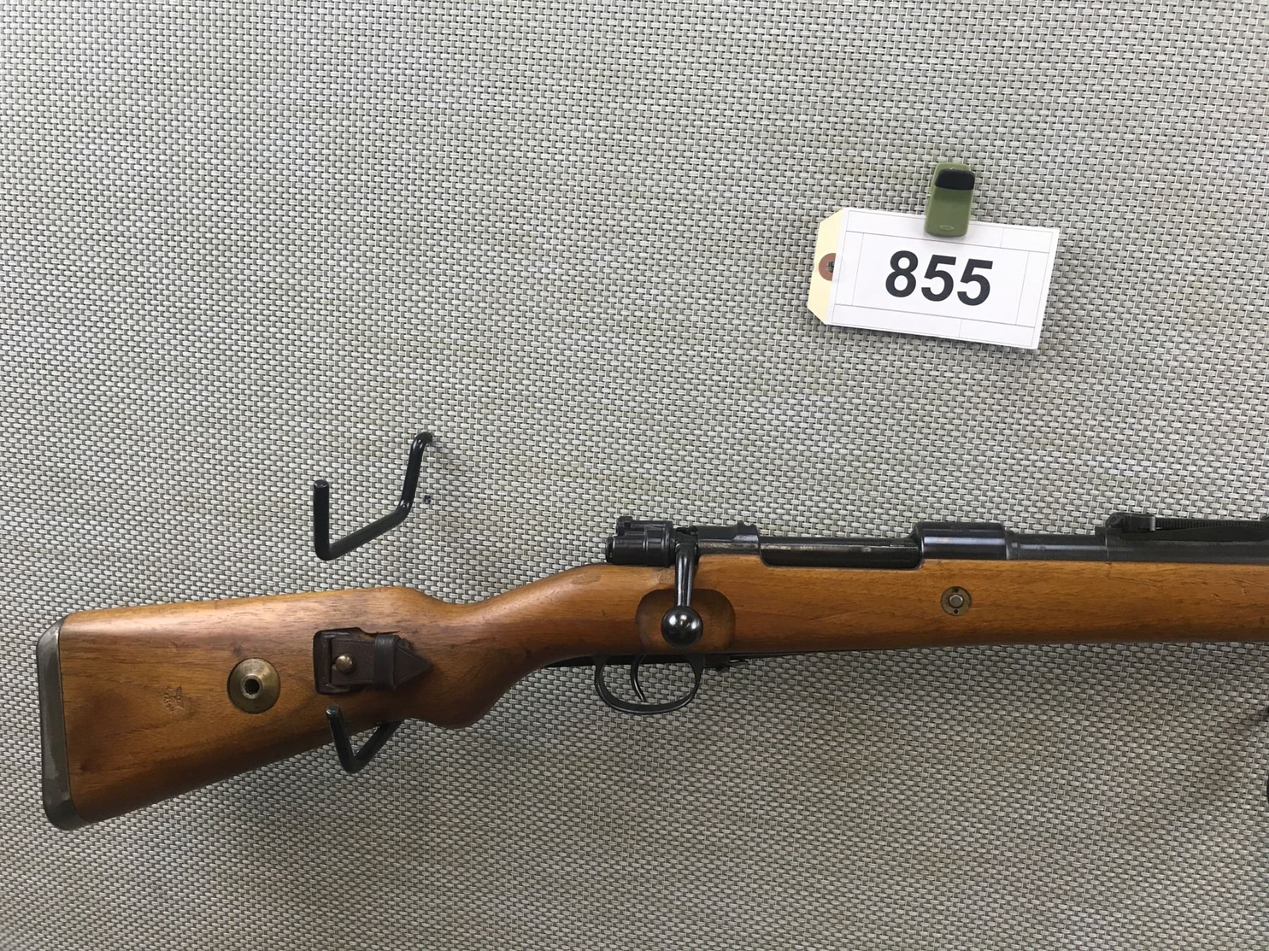 RARE WWII ERA UNFIRED PORTUGESE MAUSER , MODEL: 1941 PORTUGESE SHORT RIFLE , CALIBER: 8MM MAUSER , COMES WITH MATCHING BAYONET, BOLT AND RECEIVER ALSO MATCH BY SERIAL #, DATED 1941, EXCELLENT BORE, HOODED FRONT SIGHT AND ADJUSTABLE REAR SIGHT, ORGINIAL LEATHER SLING, RETAINS FULL MILITARY CONFIGURATION, HAS A PORTUGESE CREST AND GERMAN WAFFEN MARKS , BARREL LENGTH: 24" , SERIAL # H181 , STOCK # 8224 , CONDITION: AS NEW , CLASS: CANADIAN NON RESTRICTED CLASS