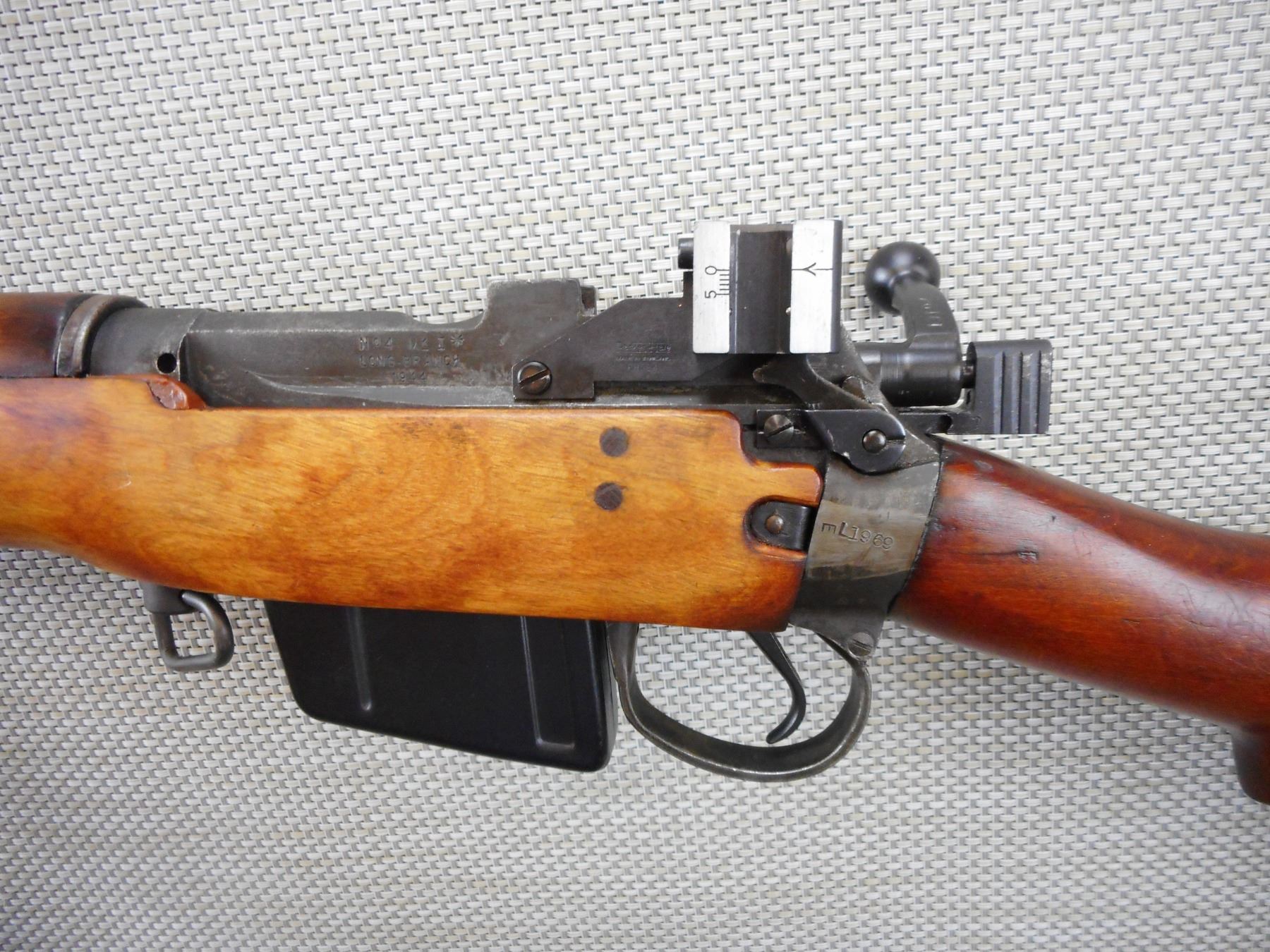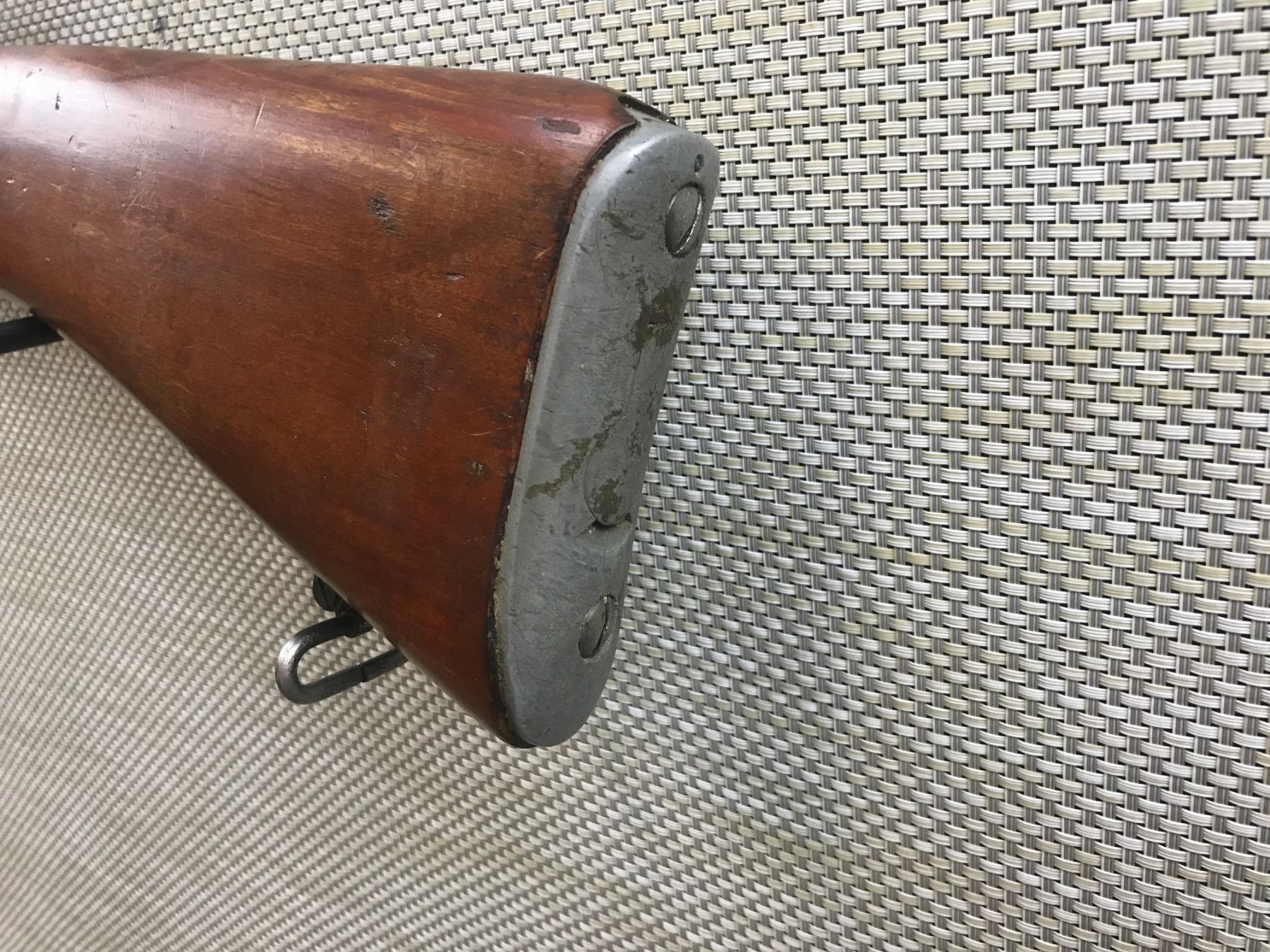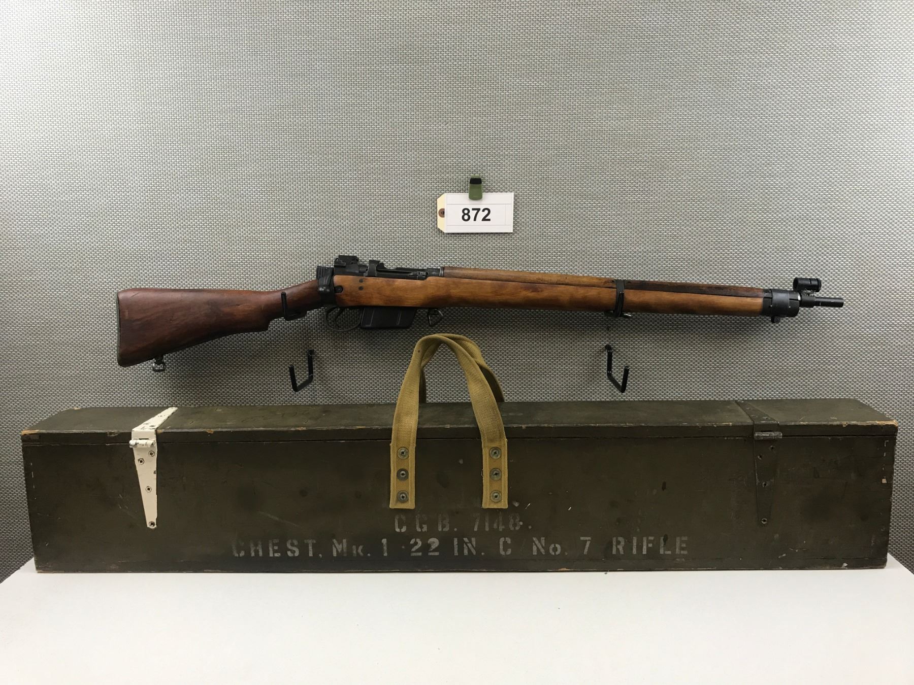 WWII ERA, LEE ENFIELD DCRA TARGET RIFLE , MODEL: NO 4 MKI* , CALIBER: 7.62 X 51 NATO , COMES WITH COMES WITH A CANADIAN WOOD CHEST C NO. 7 -- WOOD IS AS ASSEMBLED AND ISSUED BY ARMOURER AT CANADIAN ARSENALS-- HAS THE TWO WOODEN PEGS INSERTED INTO STOCK AT REAR OF RECEIVER AS PER CANADIAN ACCURIZING PROCEDURE -- SLING LOOP IN FRONT OF MAGAZINE IS FOR TARGET SHOOTING -- HAS STERLING 7.62 X 51 NATO MAGAZINE, FIREARM IS DATED 1944, BOLT AND RECEIVER MATCH BY SERIAL #, LONGBRANCH DCRA TARGET RIFLE, HAS A PARKER HALE PH 5 E4 BACK SIGHT AND A WALTHER MARK I FRONT SIGHT, RETAINS FULL MILITARY CONFIGURATION, SHOWS SOME HANDLING MARKS, WOOD IS DIFFERENT COLOURS BUT THIS IS THE ORIGINAL WAY THE ARSENAL PUT IT TOGETHER, SLING LOOPS , BARREL LENGTH: 25" , SERIAL # 1919 , STOCK # 8241 , CONDITION: 8/10 , CLASS: CANADIAN NON RESTRICTED CLASS