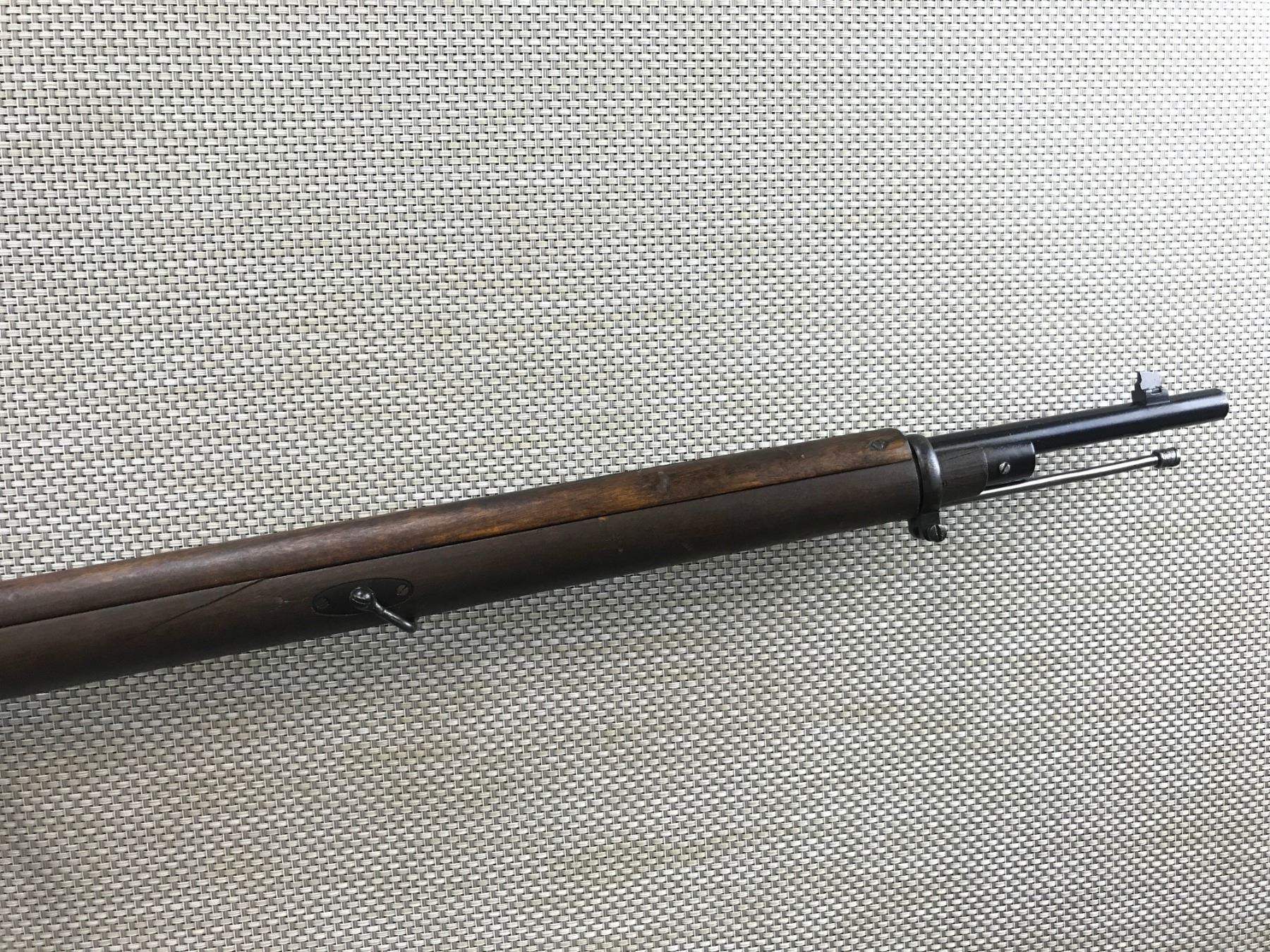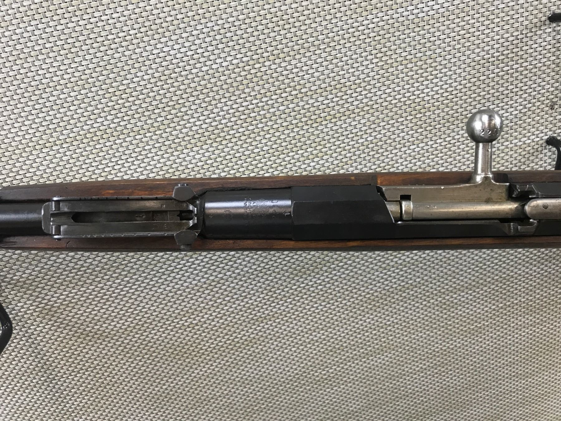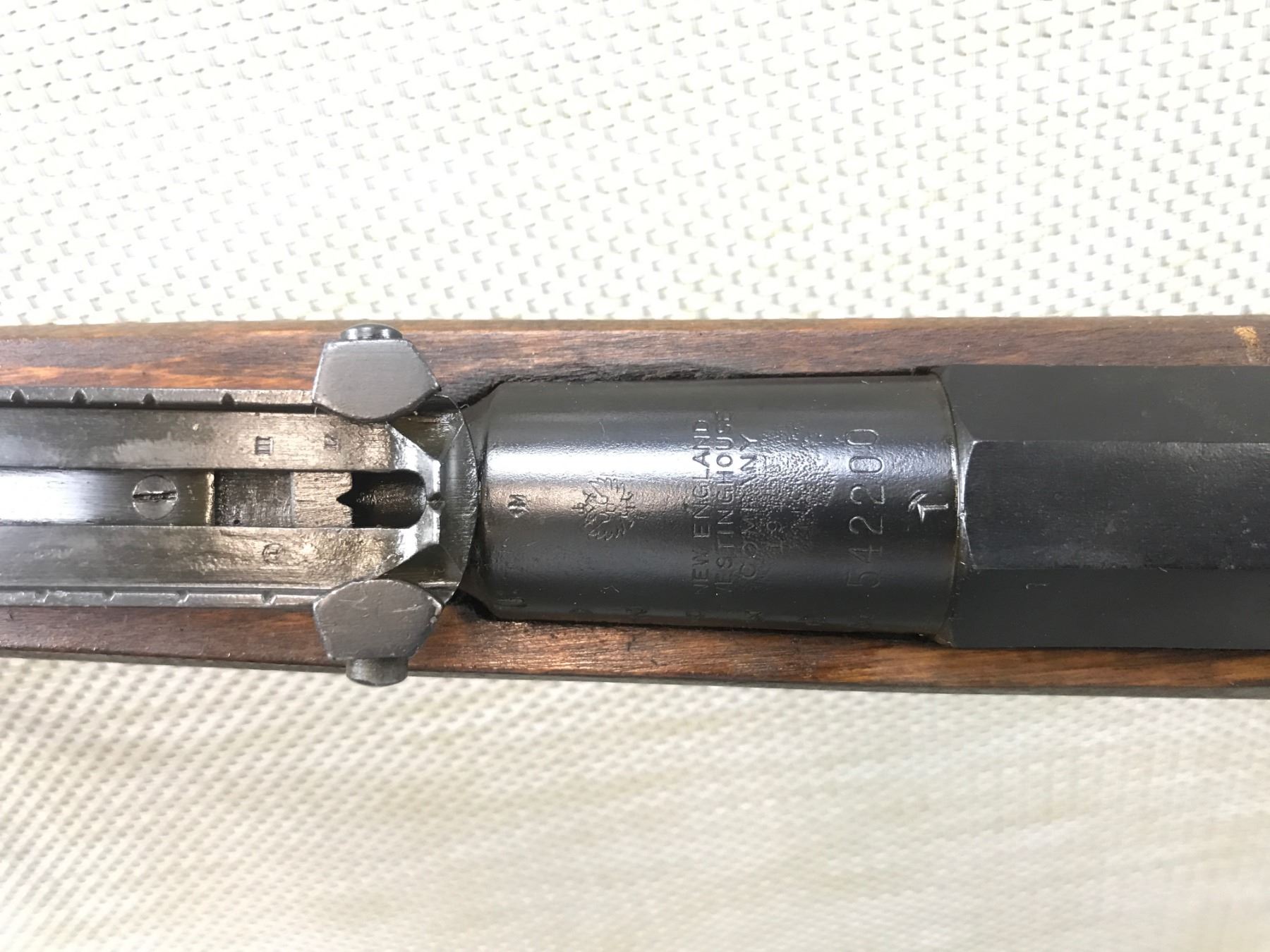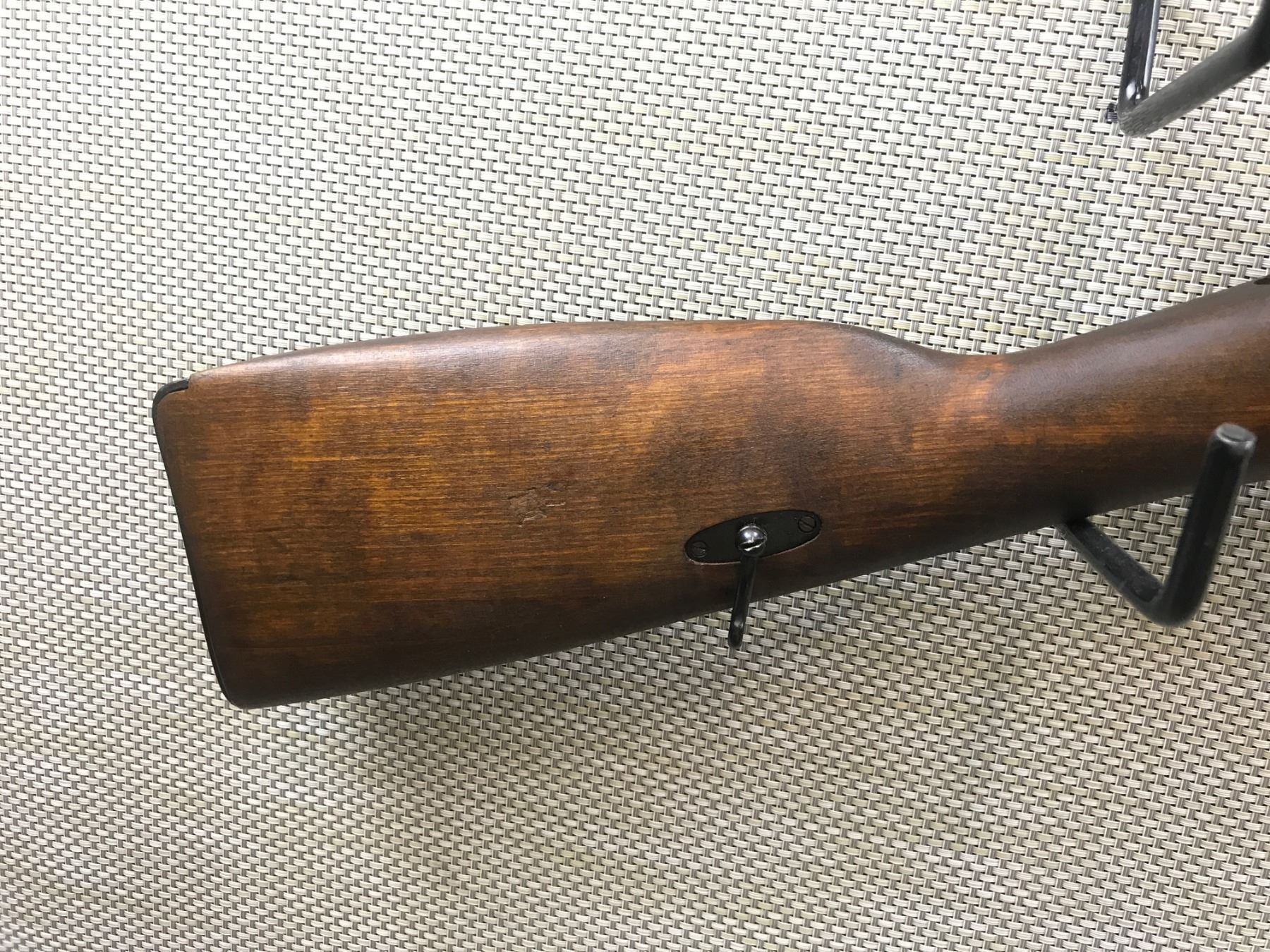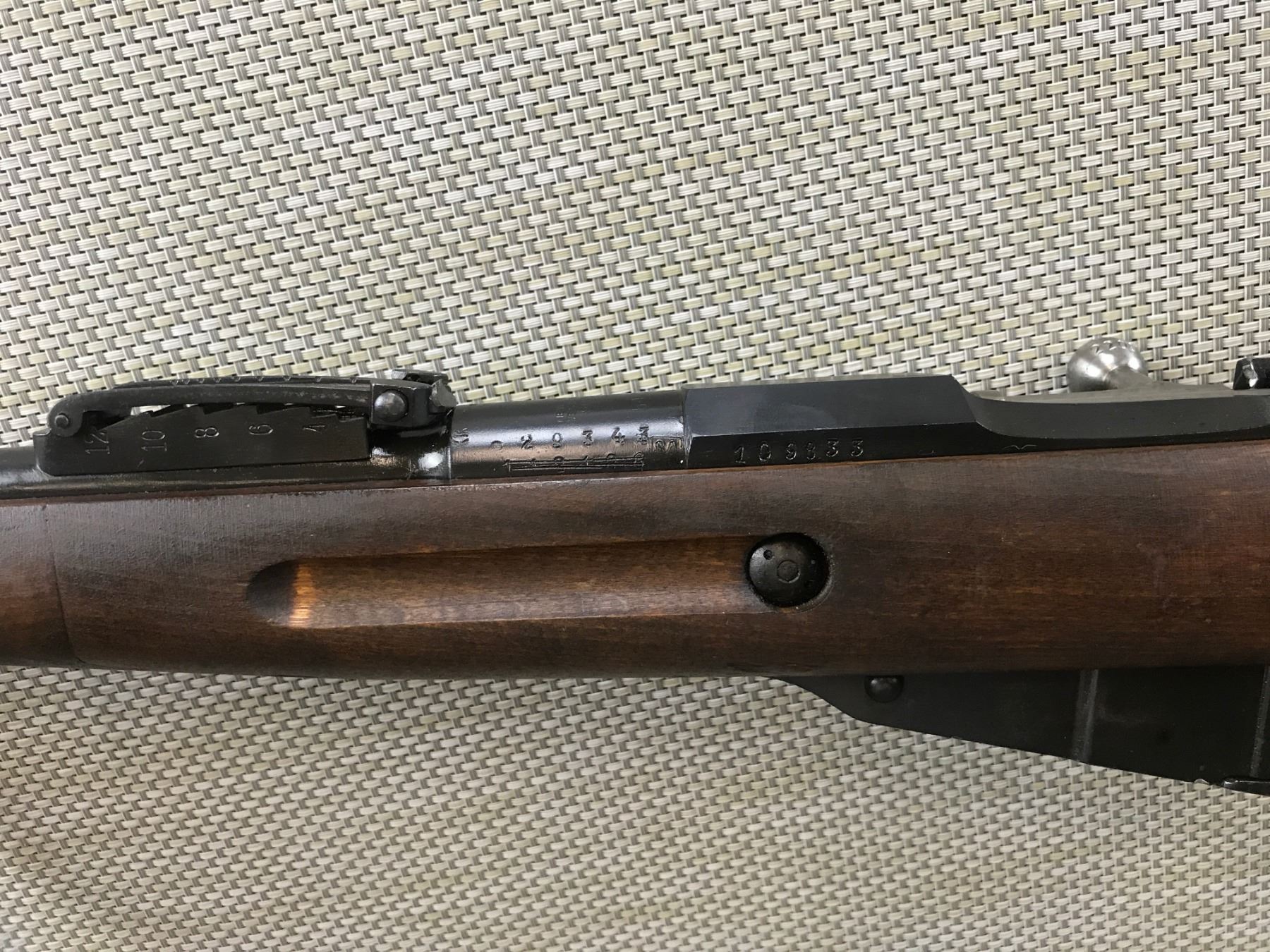 MOSIN NAGANT , MODEL: 1891 , CALIBER: 7.62 X 54R , MANUFACTURED BY WESTINGHOUSE NEW ENGLAND, BOLT ARE RECEIVER DO NOT MATCH BY SERIAL #, DARK BORE, BLADE FRONT AND ADJUSTABLE REAR SIGHT, RETAINS FULL MILITARY CONFIGURATION, RESTOCKED BY FINNS WITH FINGER-JOINT STOCK AND WITH FINNISH WIRE SLING LOOPS BARREL LENGTH: 32" , SERIAL # 109833 , STOCK # 8249 , CONDITION: 6/10 , CLASS: CANADIAN NON RESTRICTED CLASS