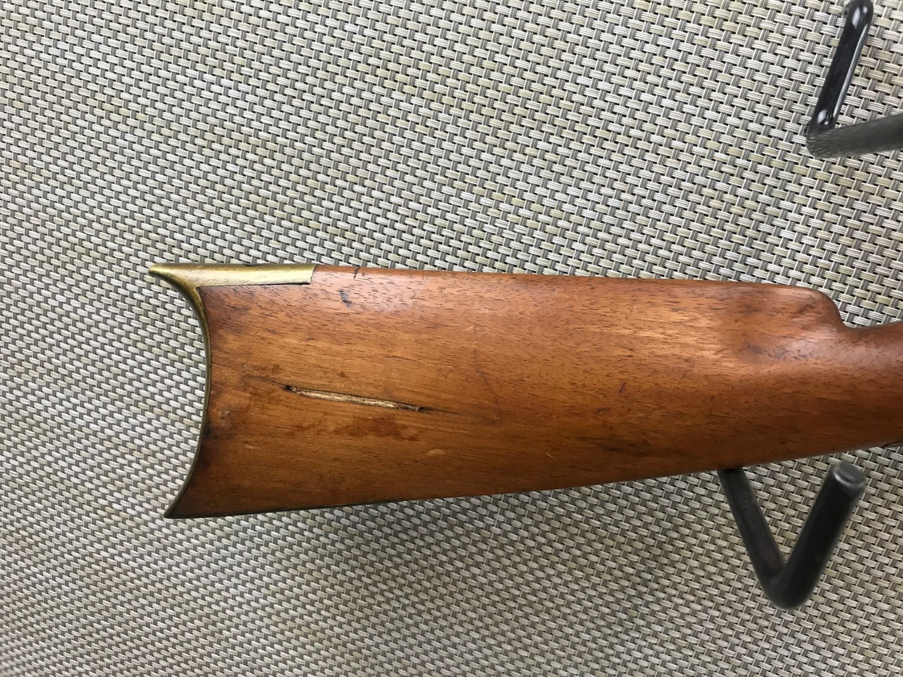 H. WOLF , MODEL: PERCUSSION , CALIBER: 50 CAL PERC , SMOOTH BORE, RAM ROD, OCTAGONAL BARREL,BLADE FRONT AND FIXED REAR SIGHTS, BRASS TRIGGER GUARD, CRESCENT BUTT PLATE, SHOWS SIGNS OF EXCESSIVE FIRING, STOCK IS CRACKED AND CHIPPED , BARREL LENGTH: 32" , SERIAL # N/A , STOCK # 8251 , CONDITION: 5/10 , CLASS: CANADIAN NON RESTRICTED CLASS