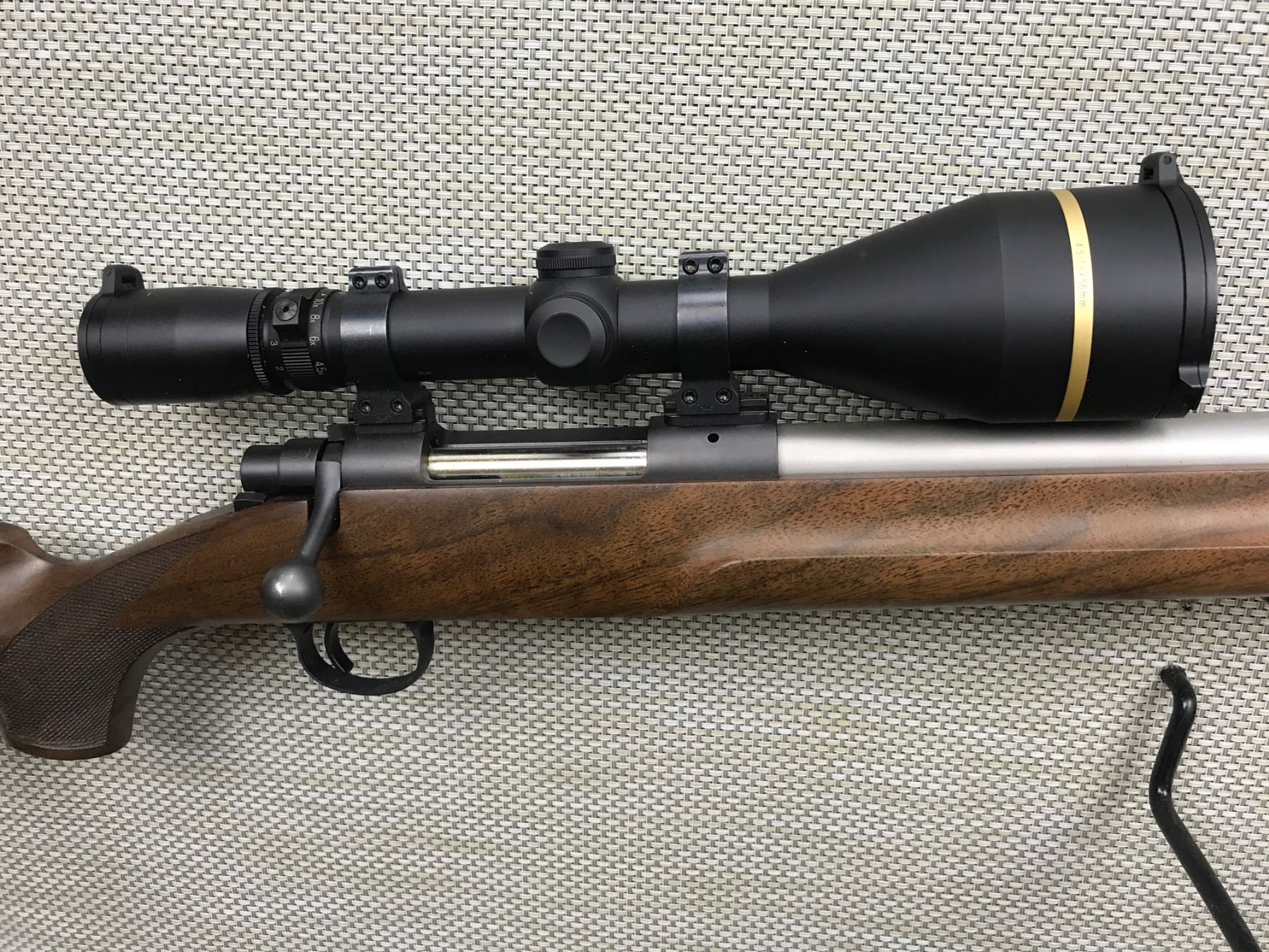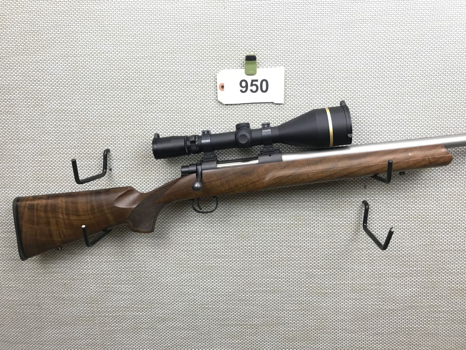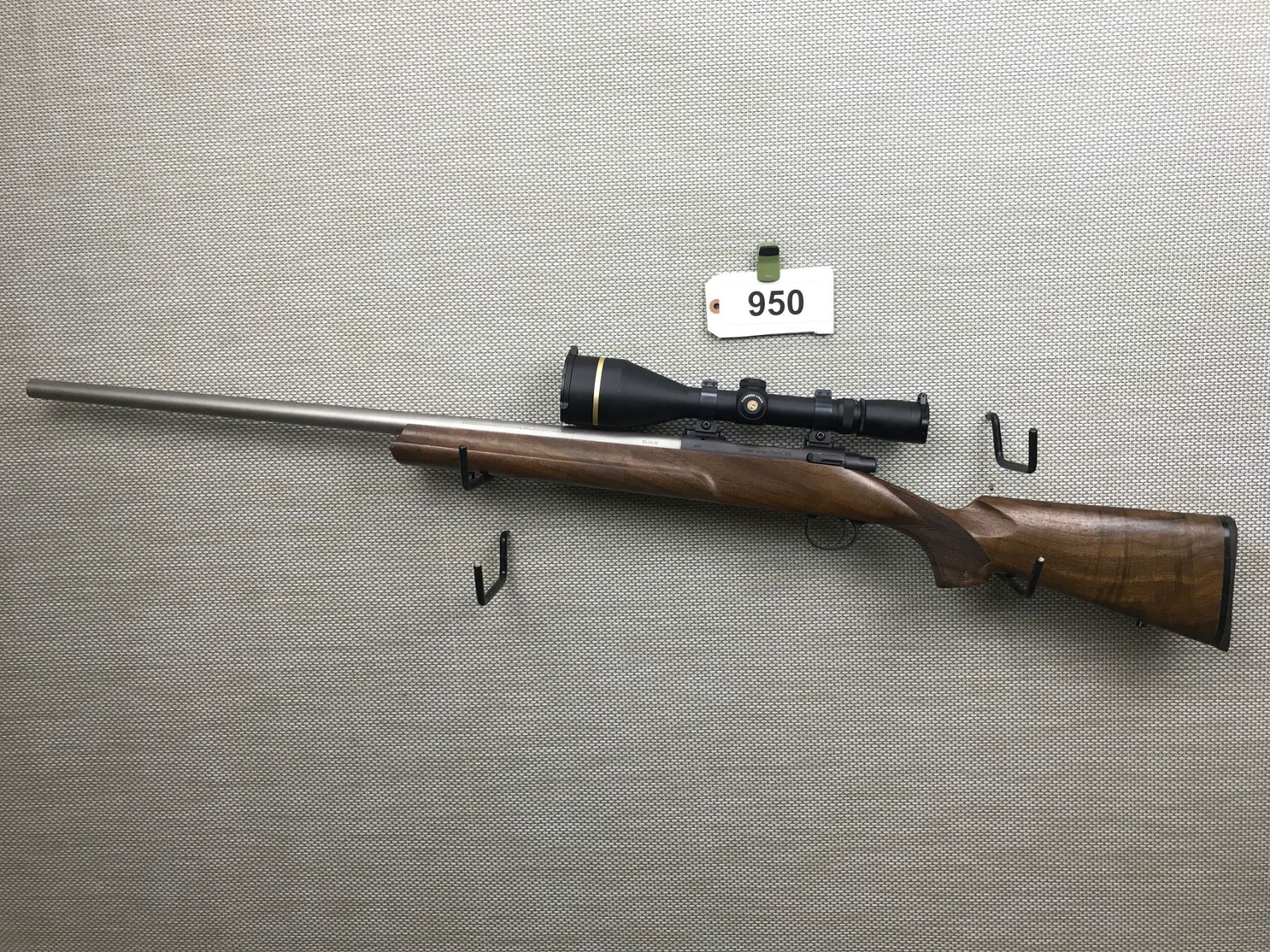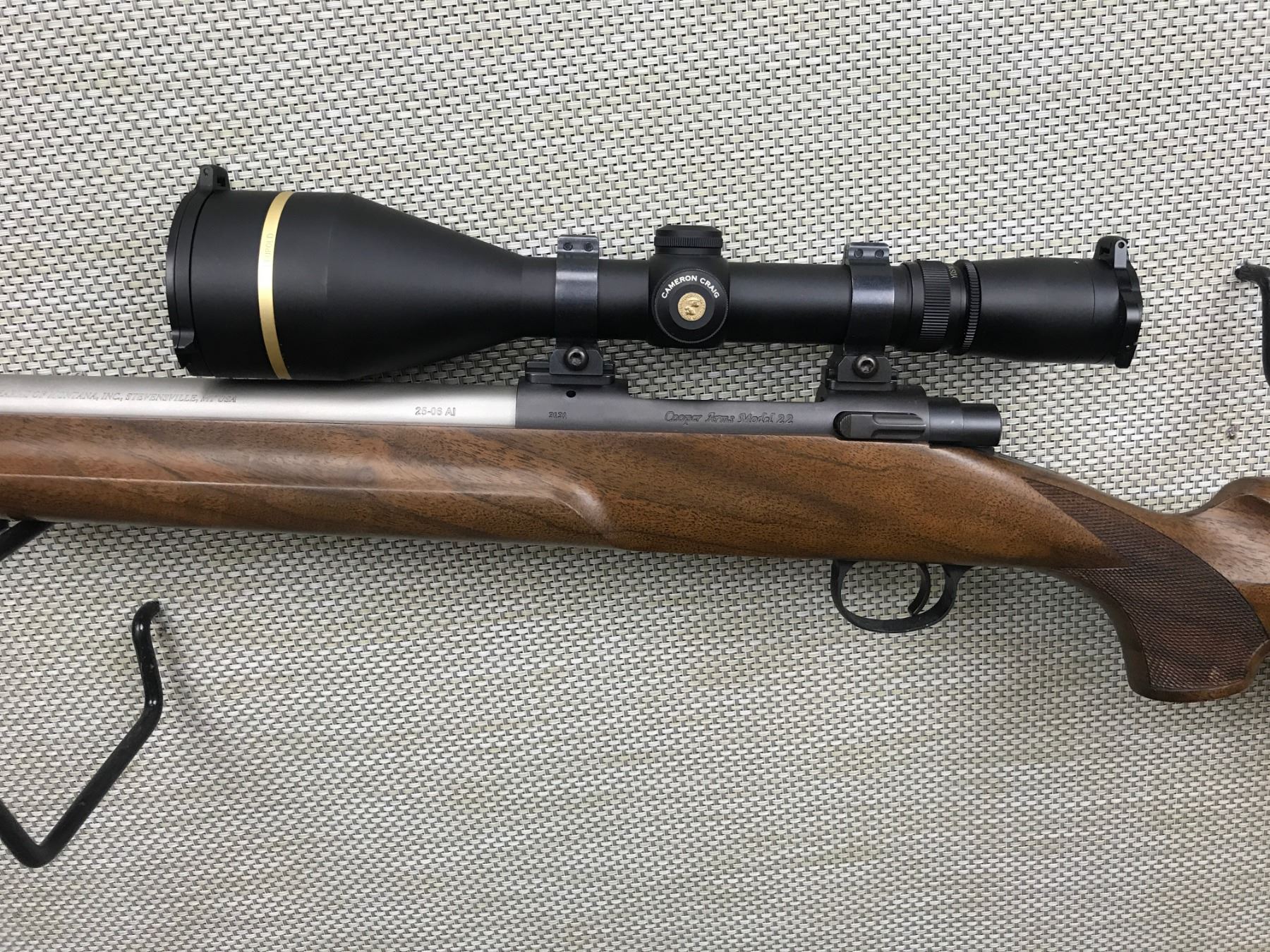 COOPERS ARMS , MODEL: 22 , CALIBER: 25-06 , FEATURES A LEUPOLD VX-L SCOPE , EXCELLENT BORE, MATTE STAINLESS BARREL, NO SIGHTS, CHECKERED PISTOL GRIP BUTT STOCK WITH RUBBER BUTT PLATE AND SLING SWIVEL STUDS, SHOWS VERY LITTLE HANDLING MARKS , BARREL LENGTH: 26" , SERIAL # 3131 , STOCK # 8319 , CONDITION: 8/10 , CLASS: CANADIAN NON RESTRICTED CLASS