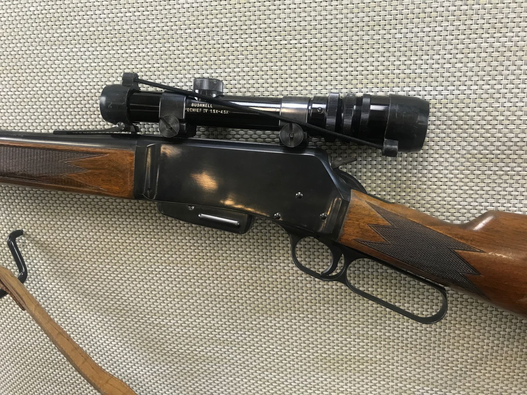 BROWNIN , MODEL: BLR , CALIBER: 308 WIN , COMES WITH 2 MAGAZINES, BORE IS EXCELLENT, HOODED FRONT AND ADJUSTABLE REAR SIGHT, FEATURES A BUSHNELL 1.5 - 4.5 SCOPE, LEATHER SLING, SHOWS SOME HANDLING MARKS, VENTED RUBBER RECOIL PAD, CHECKERED FORED AND STRAIGHT GRIP BUTT STOCK , BARREL LENGTH: 20" , SERIAL # 36433K72 , STOCK # 8336 , CONDITION: 8/10 , CLASS: CANADIAN NON RESTRICTED CLASS