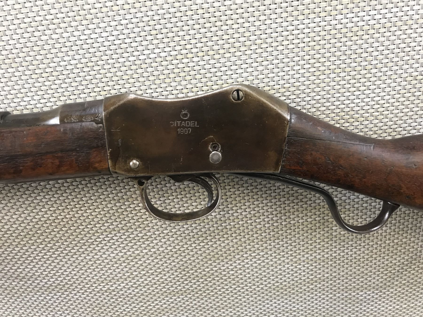 MARTINI , MODEL: CALVARY CARBINE , CALIBER: 303 BR , MARKED CITIDAL 1907, HAS EXTENSIVE MILITARY MARKS INCLUDING THE DOUBLE BRD ARROW OUT OF SERVICE MARK, PITTED BORE WITH STRONG RIFLING, BARLEY CORN FRONT AND FULLY ADJUSTABLE REAR SIGHT, FEATURES ORIGINAL BAYONET LUG, SHOWS SOME HANDLING MARKS, SMALL CRACK AT THE WRIST, MISSING THE FRONT SLING SWIVEL, STEEL BUTT PLATE , BARREL LENGTH: 21" , SERIAL # N/A , STOCK # 8373 , CONDITION: 5/10 , CLASS: CANADIAN NON RESTRICTED CLASS