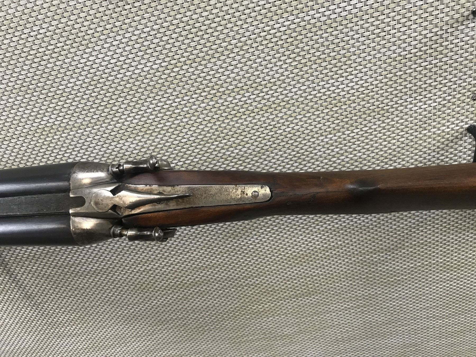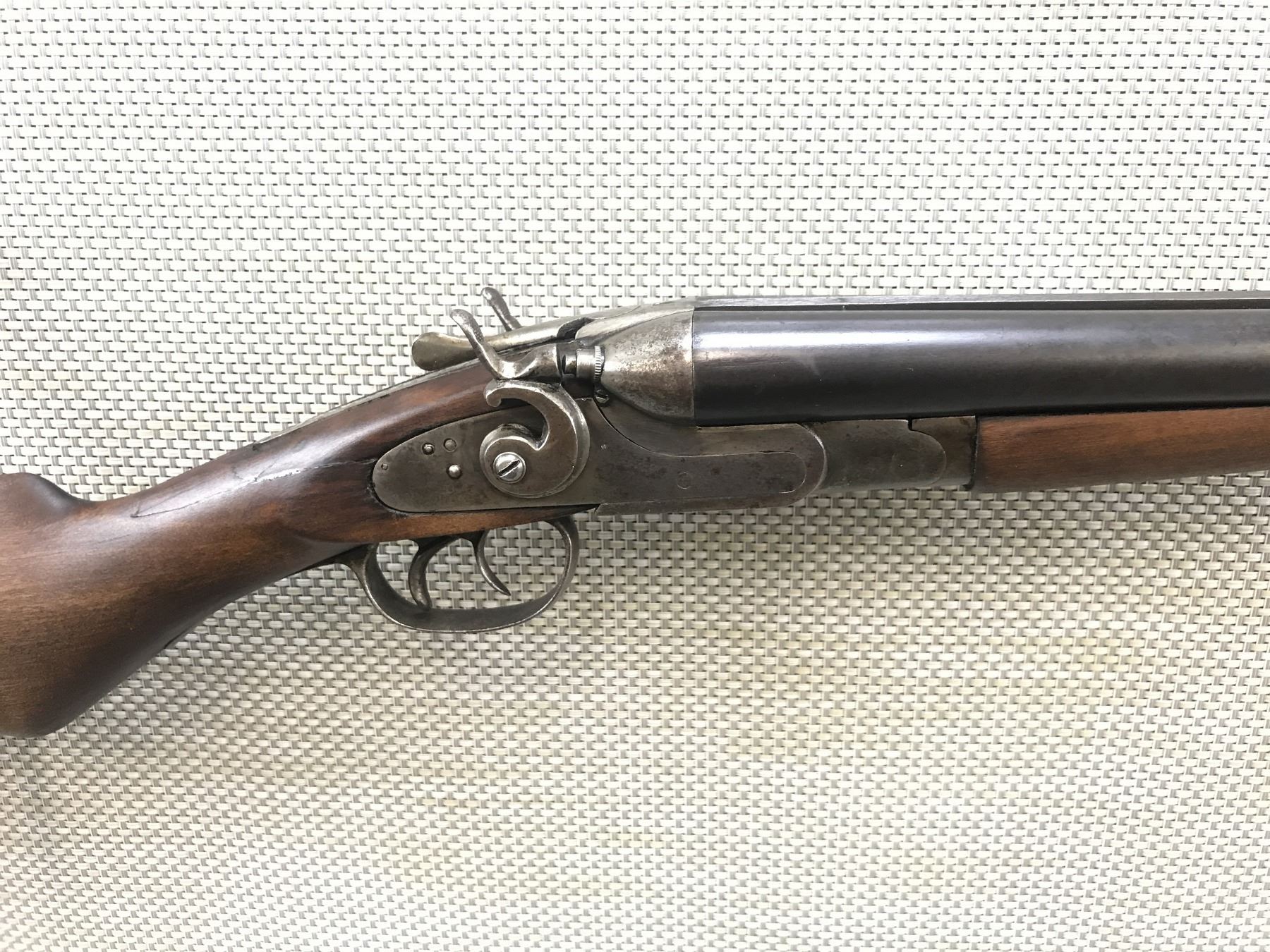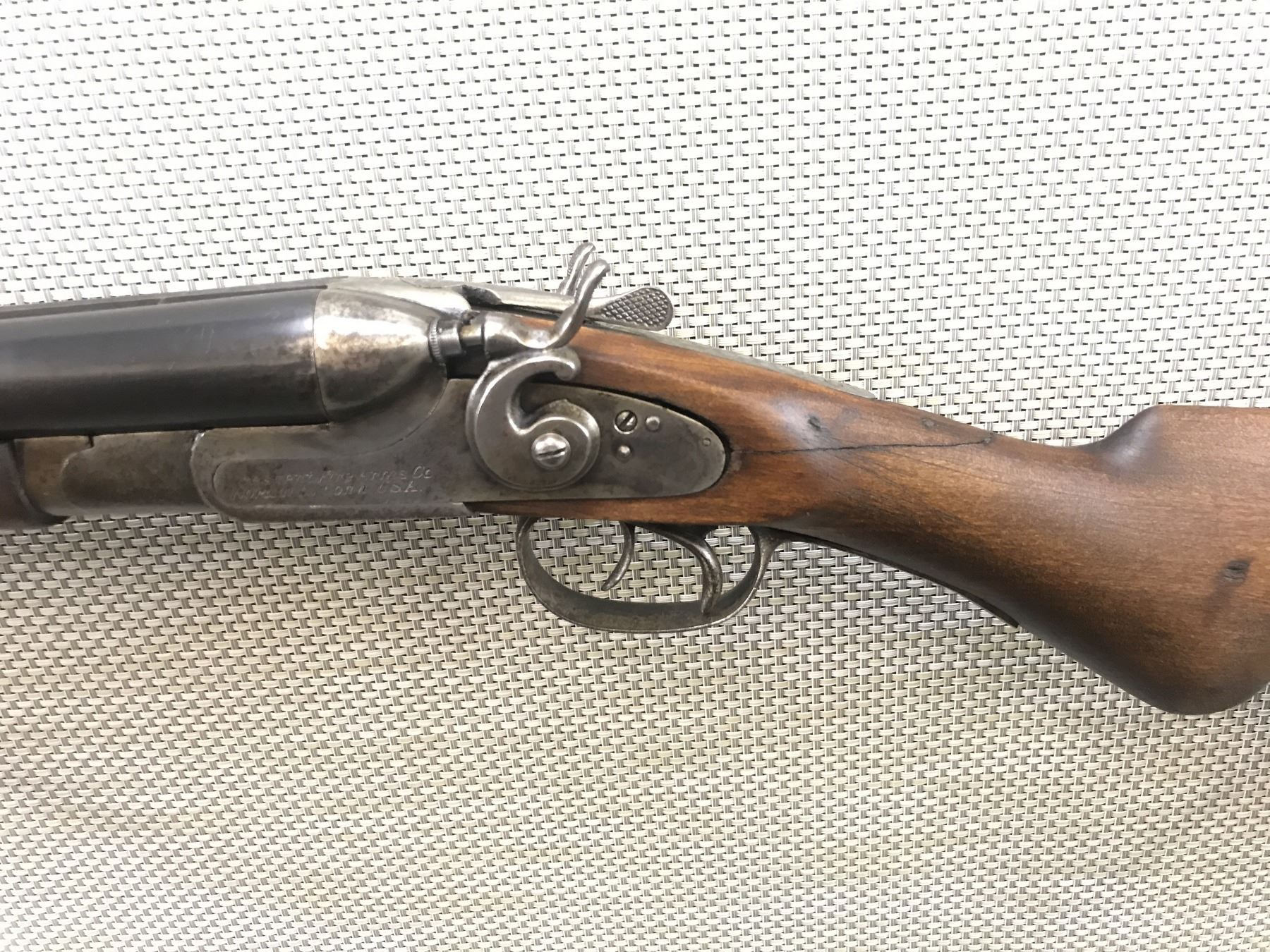 CRESCENT FIREARMS CO , MODEL: SIDE BY SIDE SHOTGUN , CALIBER: 12GA X 3" , REPLACEMENT STOCK HAS REPAIRED CRACKS, THERE IS MINOR PITTING IN THE BORES, FIXED FULL AND MODIFIED CHOKES, BEAD FRONT SIGHT, SHOWS EXTENSIVE HANDLING MARKS, VENTED RUBBER RECOIL PAD HAS BEEN RESHAPED , BARREL LENGTH: 30" , SERIAL # N/A , STOCK # 8374 , CONDITION: 4/10 , CLASS: CANADIAN NON RESTRICTED CLASS