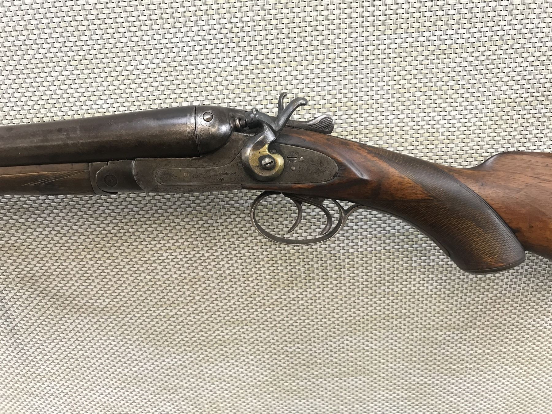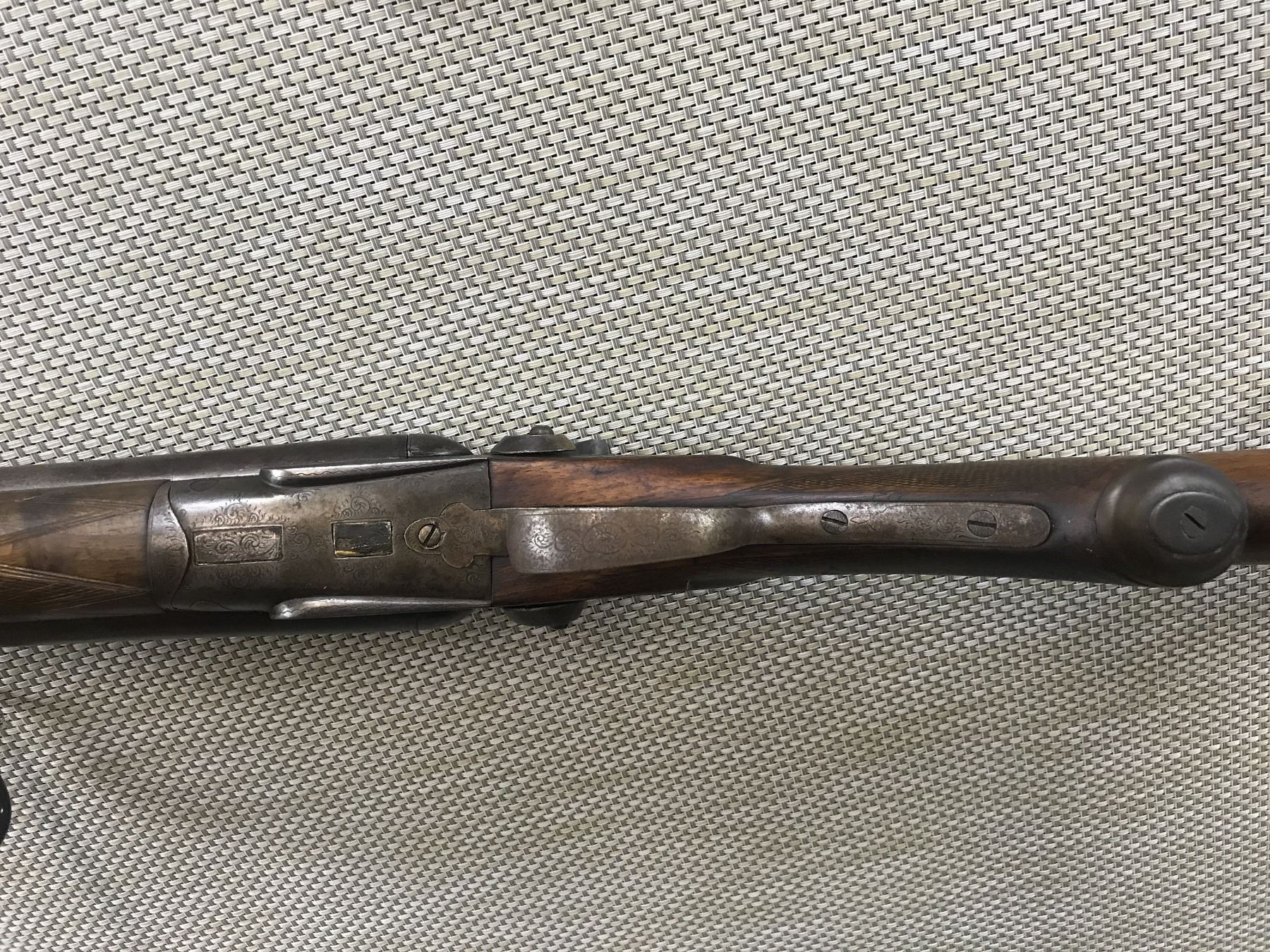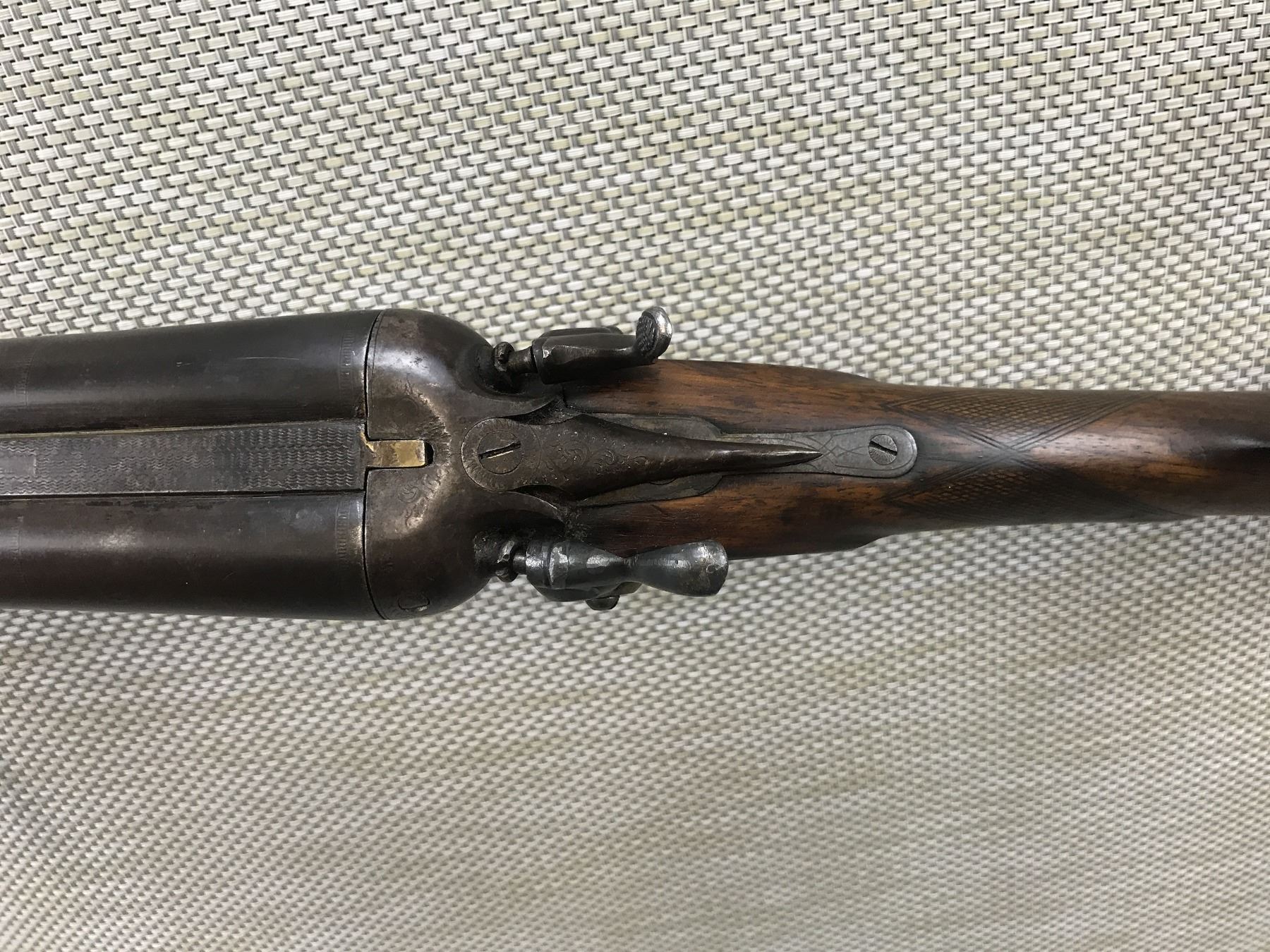 UNITED ARMS , MODEL: IMPERIAL SIDE BY SIDE , CALIBER: 10GA X 3" , PITTED BORES, REPAIRED LOCK AND HAMMER, FIXED FULL AND MODIFIED CHOKES, BEAD FRONT SIGHT, CHECKERED FOREND AND CAPPED PISTOL GRIP BUTT STOCK WITH PLASTIC BUTT PLATE, SHOWS SOME HANDLING MARKS, DOUBLE HAMMER DOUBLE TRIGGER , BARREL LENGTH: 32" , SERIAL # 18541 , STOCK # 8375 , CONDITION: 5/10 , CLASS: CANADIAN NON RESTRICTED CLASS