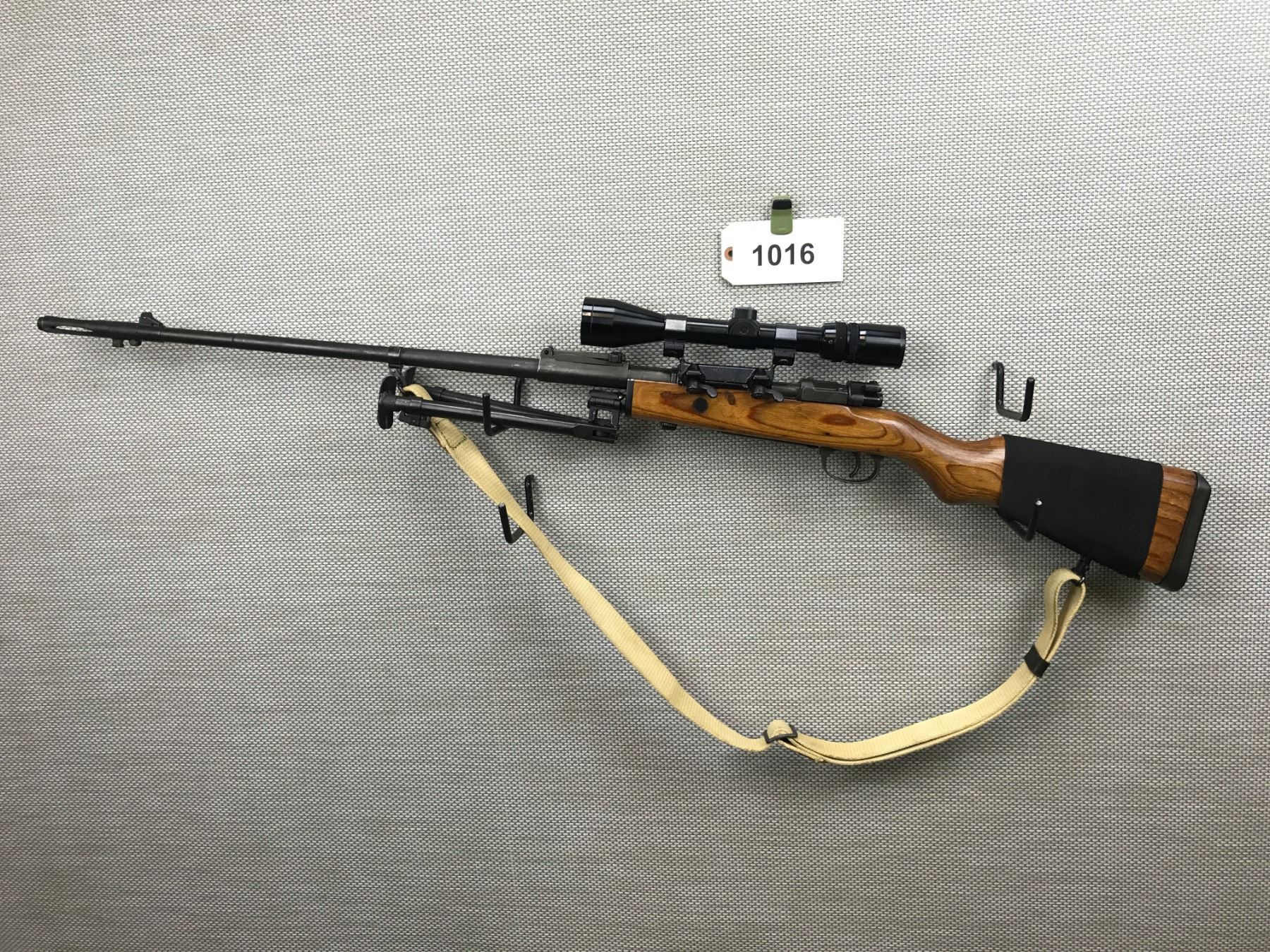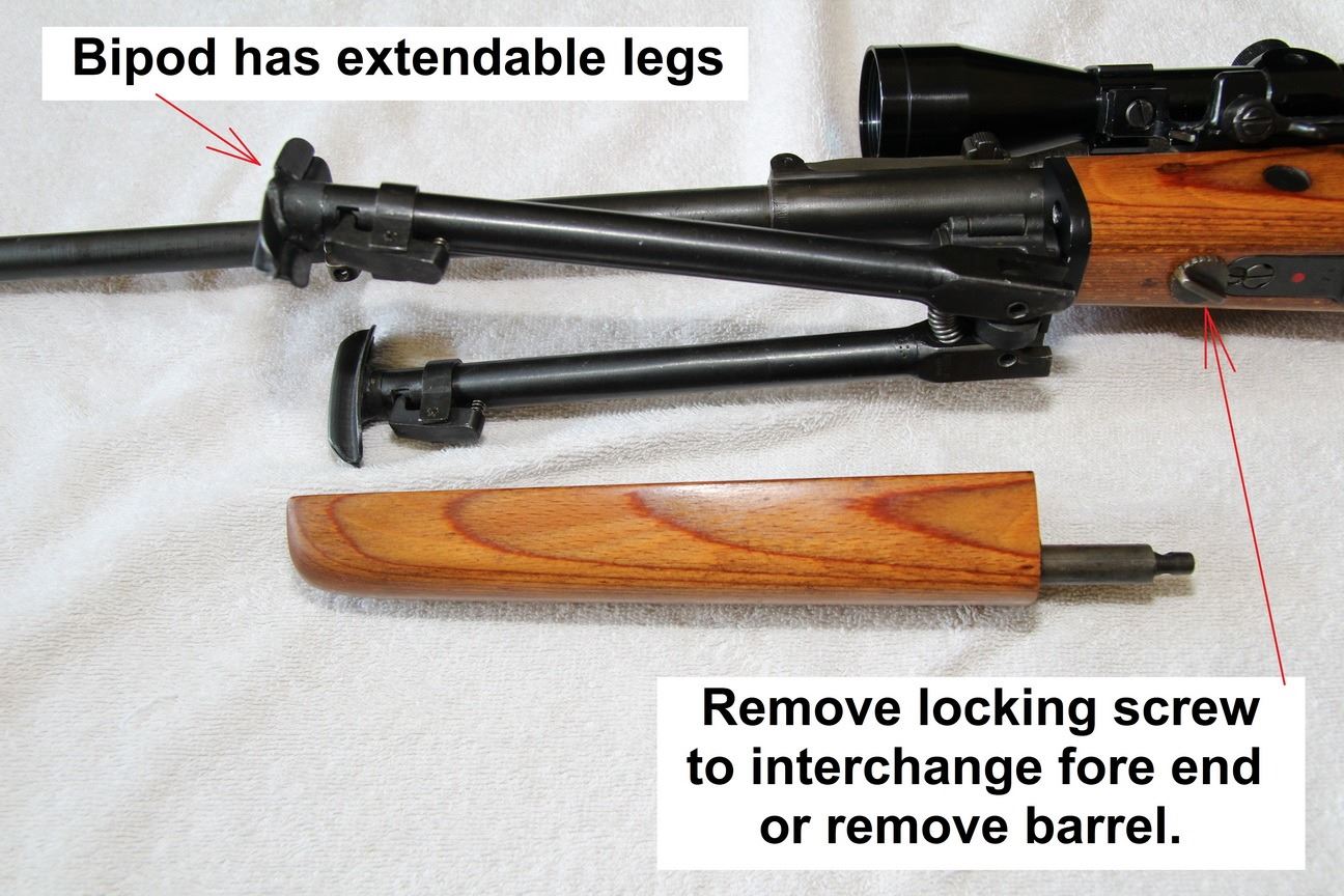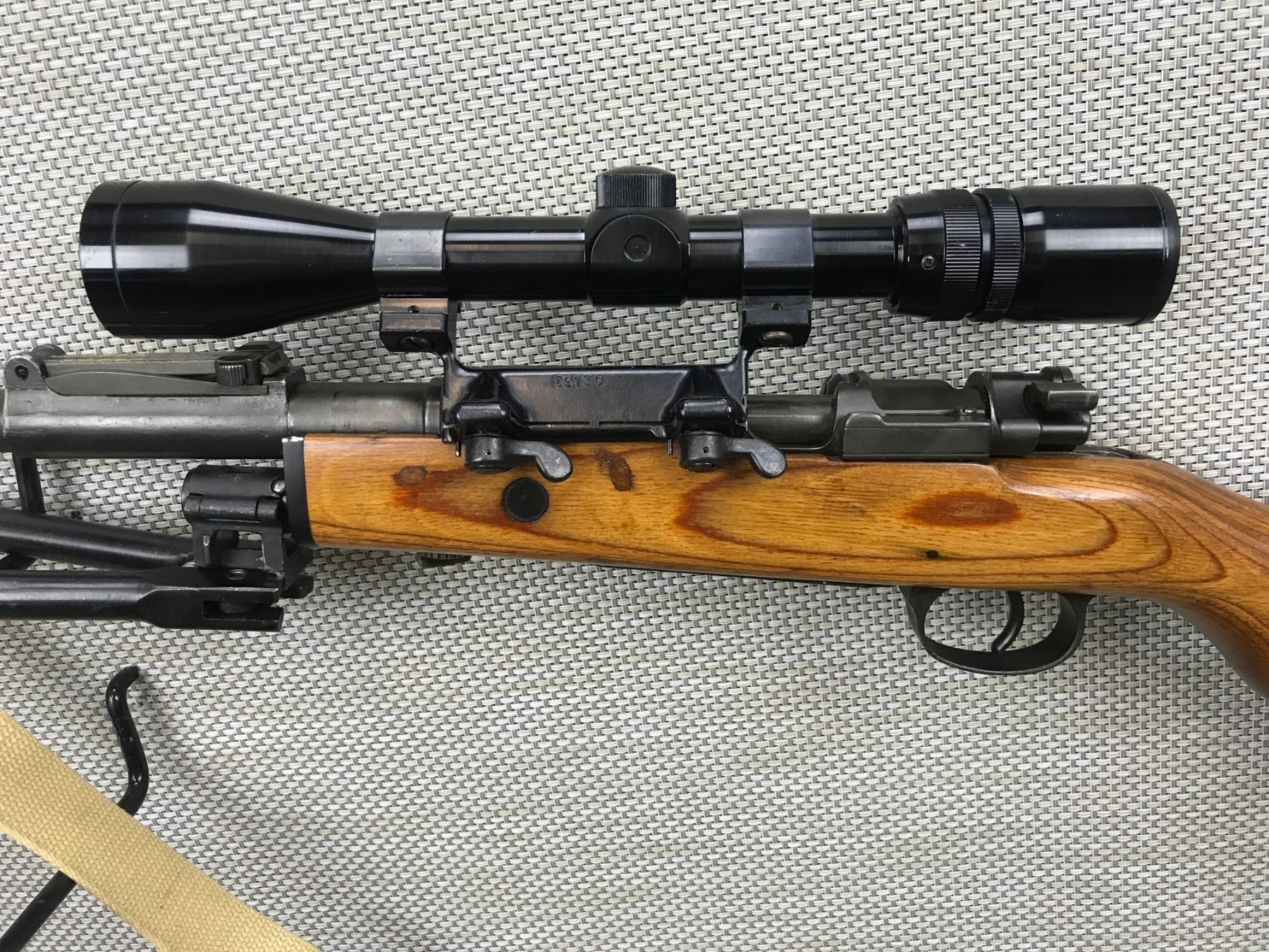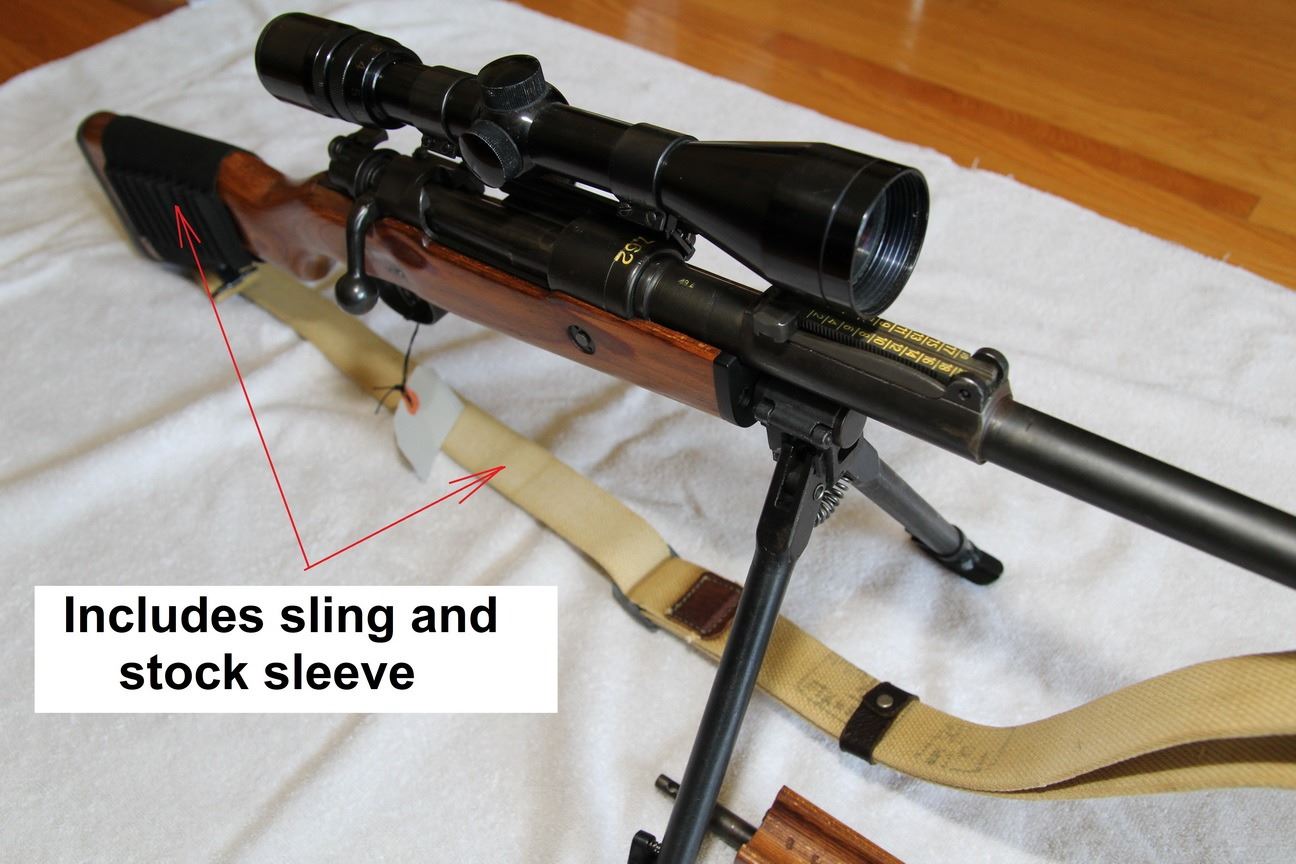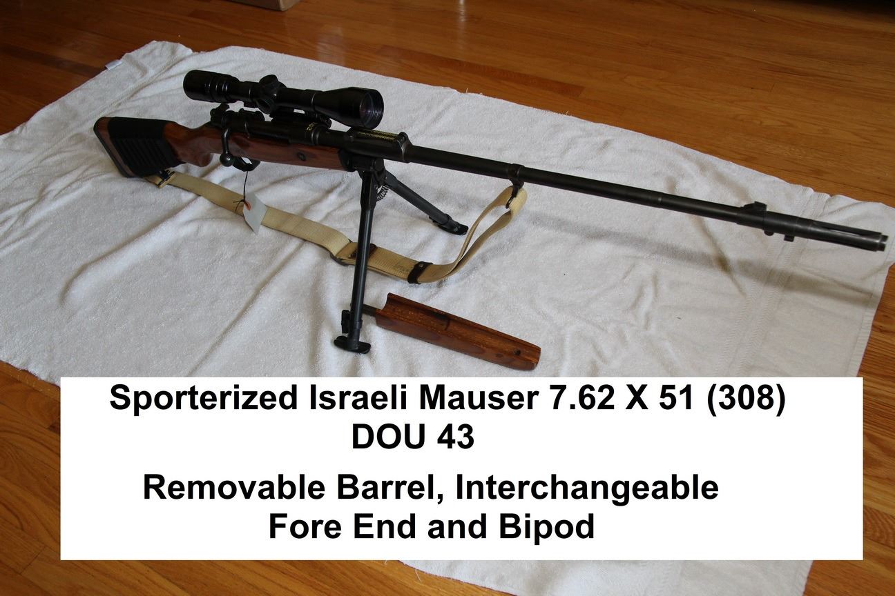 MAUSER , MODEL: ISRAEL K98 SPORTERIZED , CALIBER: 7.62 X 51 , 3 - 9 POWER SCOPE WITH MOUNT, FN FAL FLASH HIDER, INTERCHANGEABLE BIPOD AND FOREND ( NOT ATTACHED BUT INCLUDED) , MIRROR EXCELLENT BORE, CANVAS SLING ON SLING LOOPS, WOOD STOCK, NYLON AMMO SLEEVE ON BUTT, STEEL BUTT PAD, , BARREL LENGTH: 23" , SERIAL # 6284 , STOCK # 8385 , CONDITION: 9/10 , CLASS: CANADIAN NON RESTRICTED CLASS