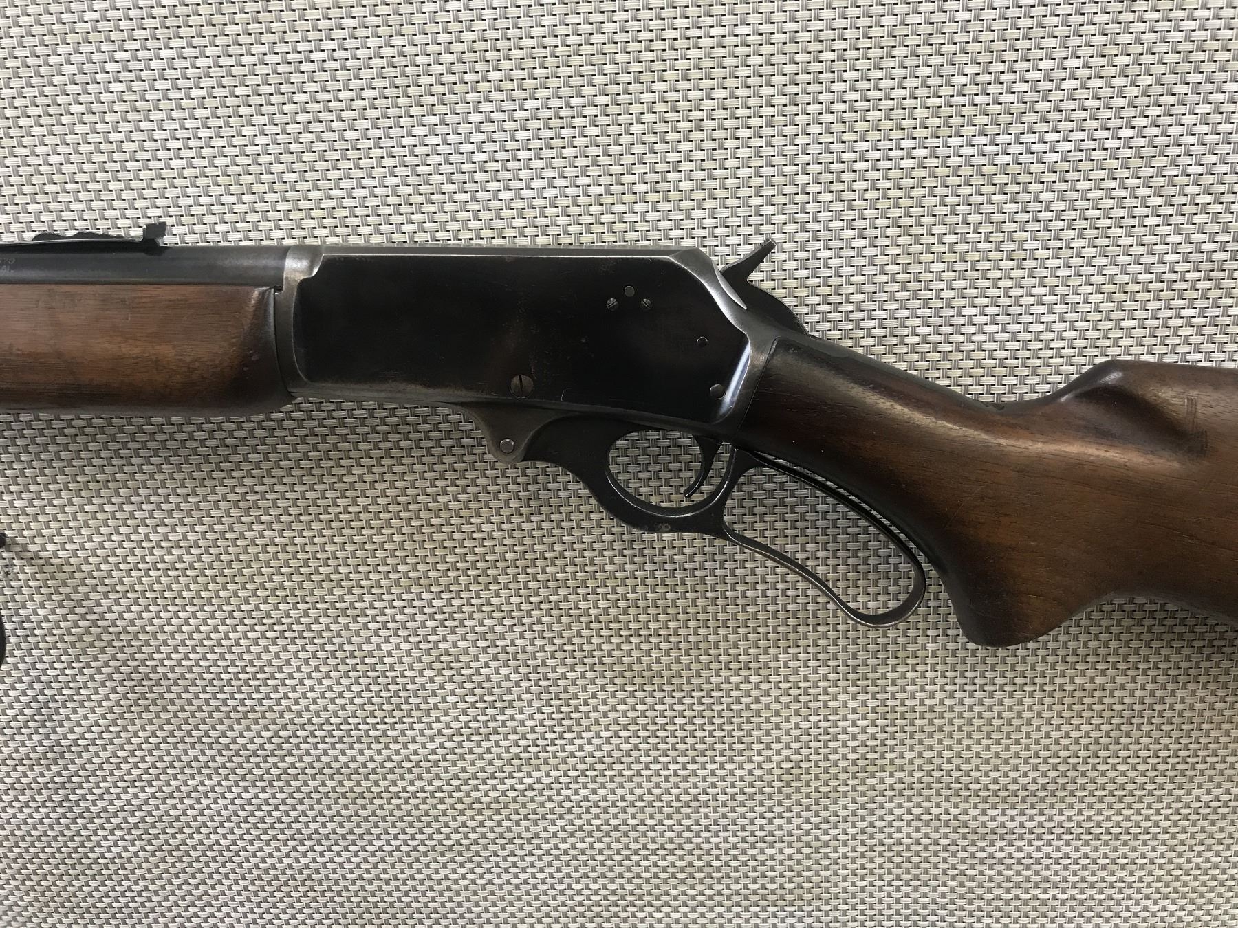 MARLIN , MODEL: 336RC , CALIBER: 30-30 WIN , VERY GOOD BORE, DOVETAIL FRONT AND FULLY ADJUSTABLE REAR SIGHT, STOCK HAS BEEN SHORTENED AND HAS A REPLACED VENTED RUBBER RECOIL PAD, SHOWS SOME HANDLING MARKS AND LIGHT SURFACE PITTING , BARREL LENGTH: 20" , SERIAL # K10796 , STOCK # 8408 , CONDITION: 5/10 , CLASS: CANADIAN NON RESTRICTED CLASS