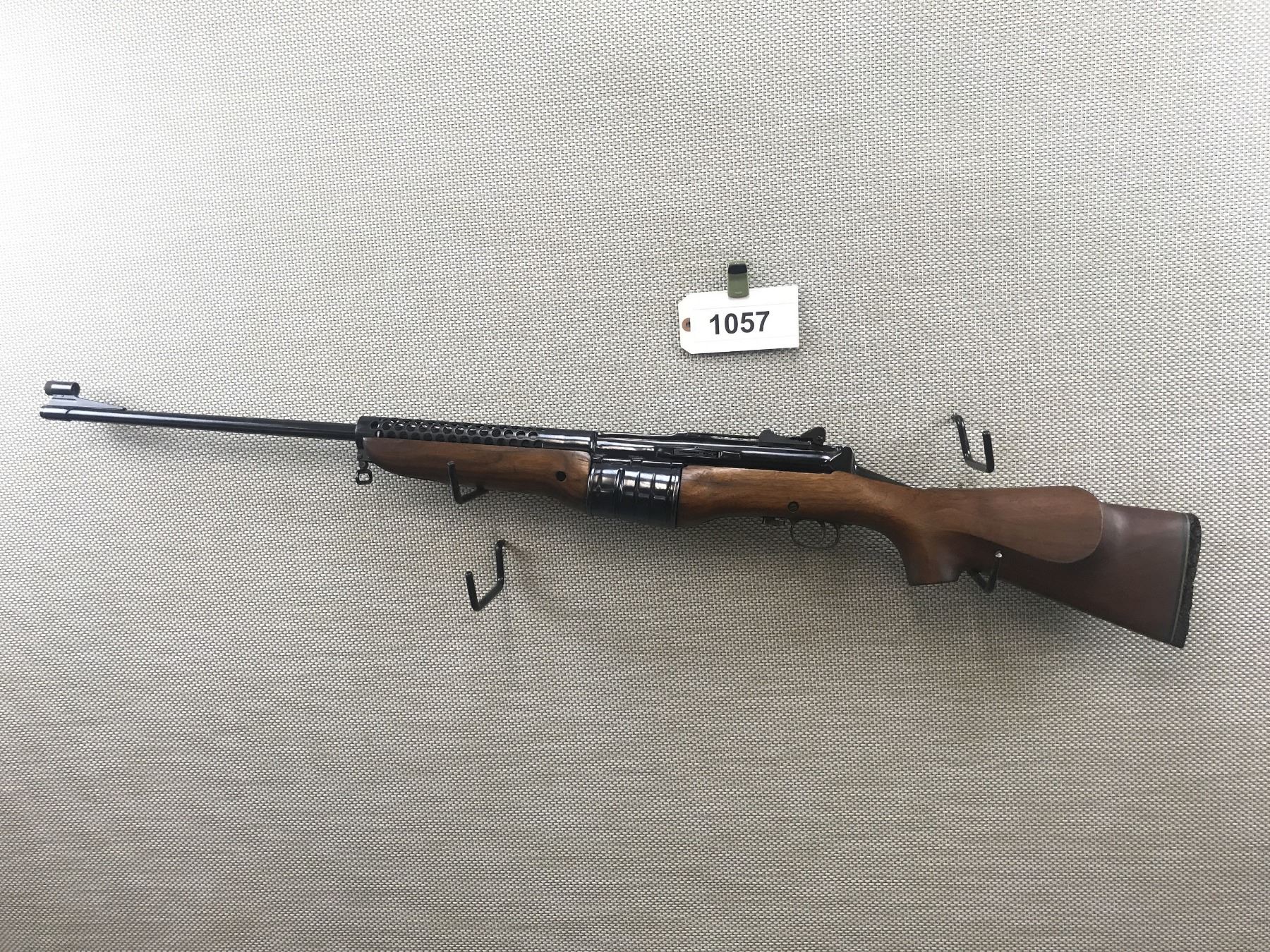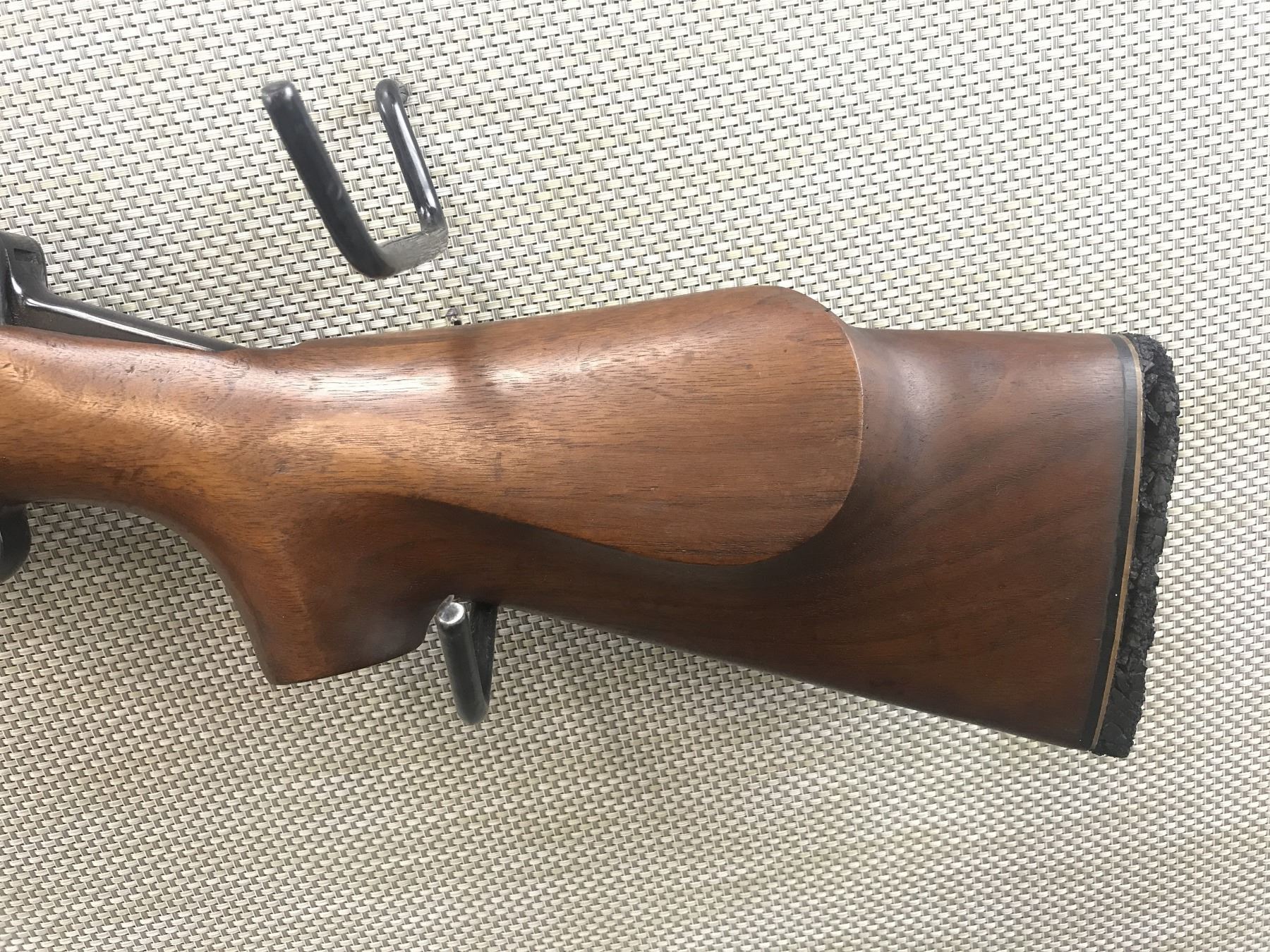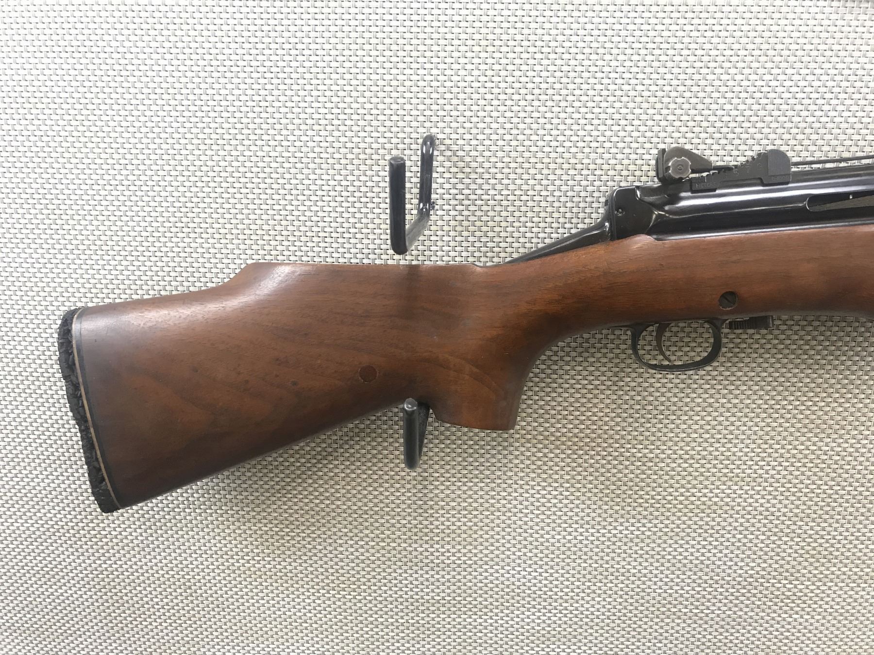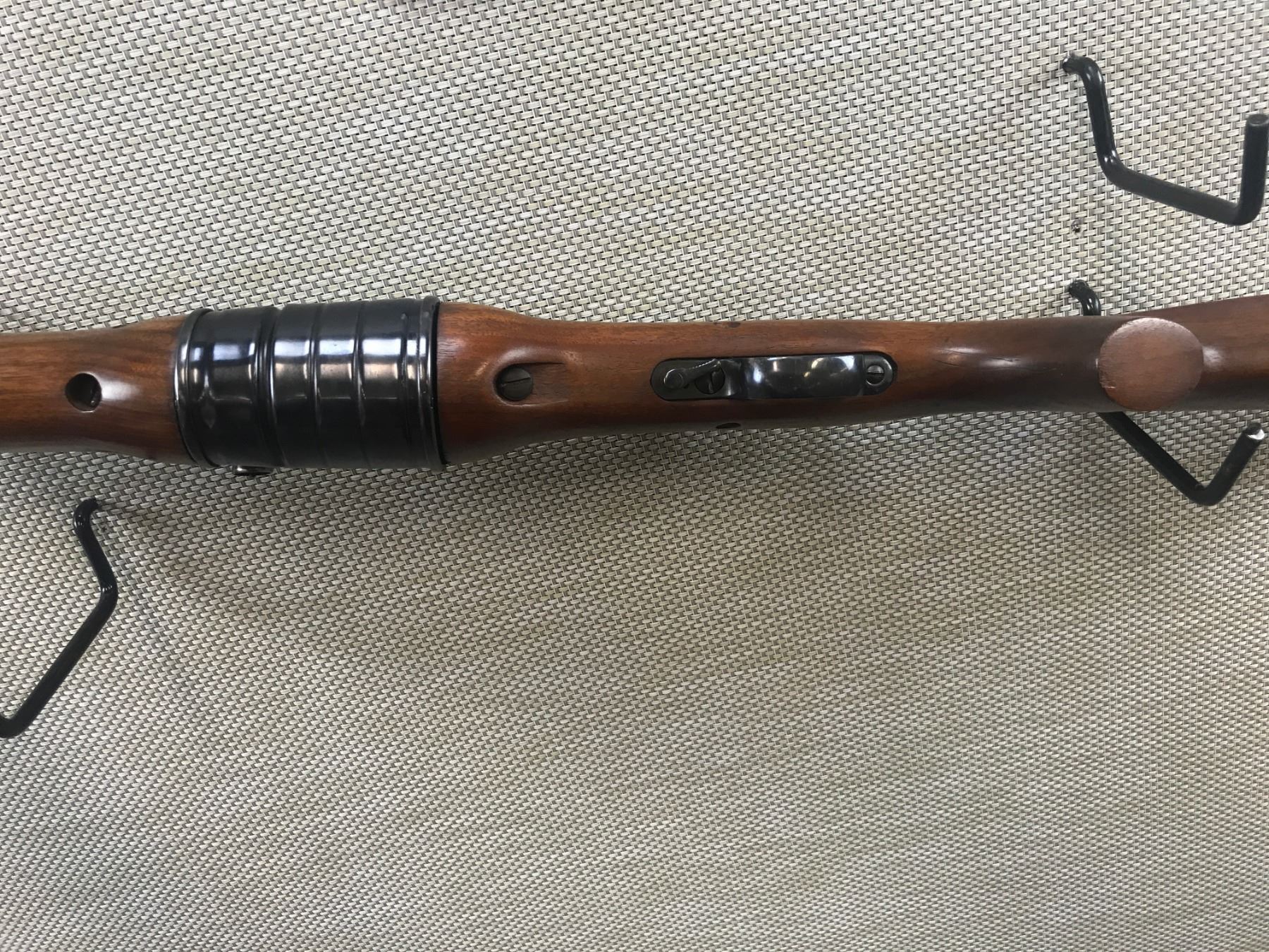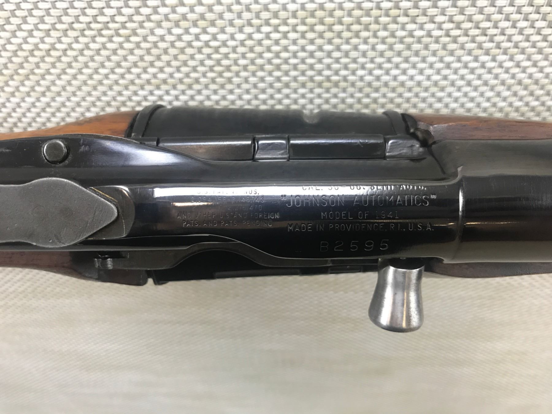 JOHNSON AUTOMATICS , MODEL: MODEL OF 1941 , CALIBER: 30-06 SPRG , VERY GOOD BORE, HOODED FRONT AND PEEP APERTURE REAR SIGHT, FIREARM RETAINS FULL MILITARY CONFIGURATIONS BUT IT HAS BEEN REBLUED AND THE STOCK HAS BEEN REFINISHED, POSSIBLE REPLACED BUTT STOCK, BUTT PAD IS ROTTED AND CRUMBLING, SHOWS VERY LITTLE HANDLING MARKS, MISSING THE REAR SLING SWIVEL , BARREL LENGTH: 23" , SERIAL # B2595 , STOCK # 8426 , CONDITION: 5/10 , CLASS: CANADIAN NON RESTRICTED CLASS