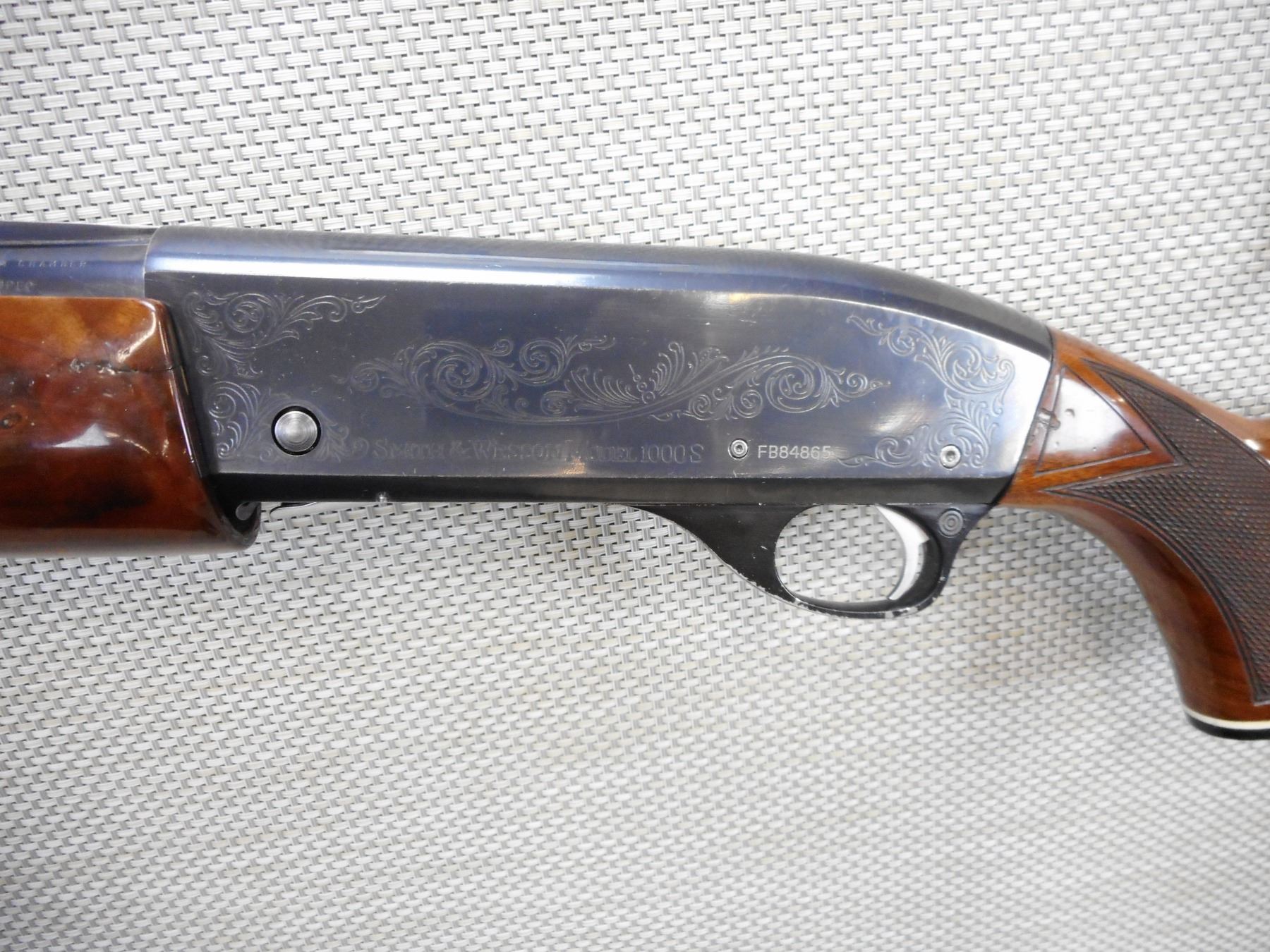 SMITH & WESSON , MODEL: 1000S , CALIBER: 12GA X 2 3/4" , VERY GOOD BORE, NO CHOKE, BRASS BEAD FRONT AND MID BEAD SIGHT, PORTED BARREL WITH FULLY VENTED RIB, CHECKERED FOREND AND CAPPED PISTOL GRIP BUTT STOCK WITH RUBBER RECOIL PAD, SHOWS SOME HANDLING MARKS , BARREL LENGTH: 25" , SERIAL # FB84865 , STOCK # 8520 , CONDITION: 7/10 , CLASS: CANADIAN NON RESTRICTED CLASS