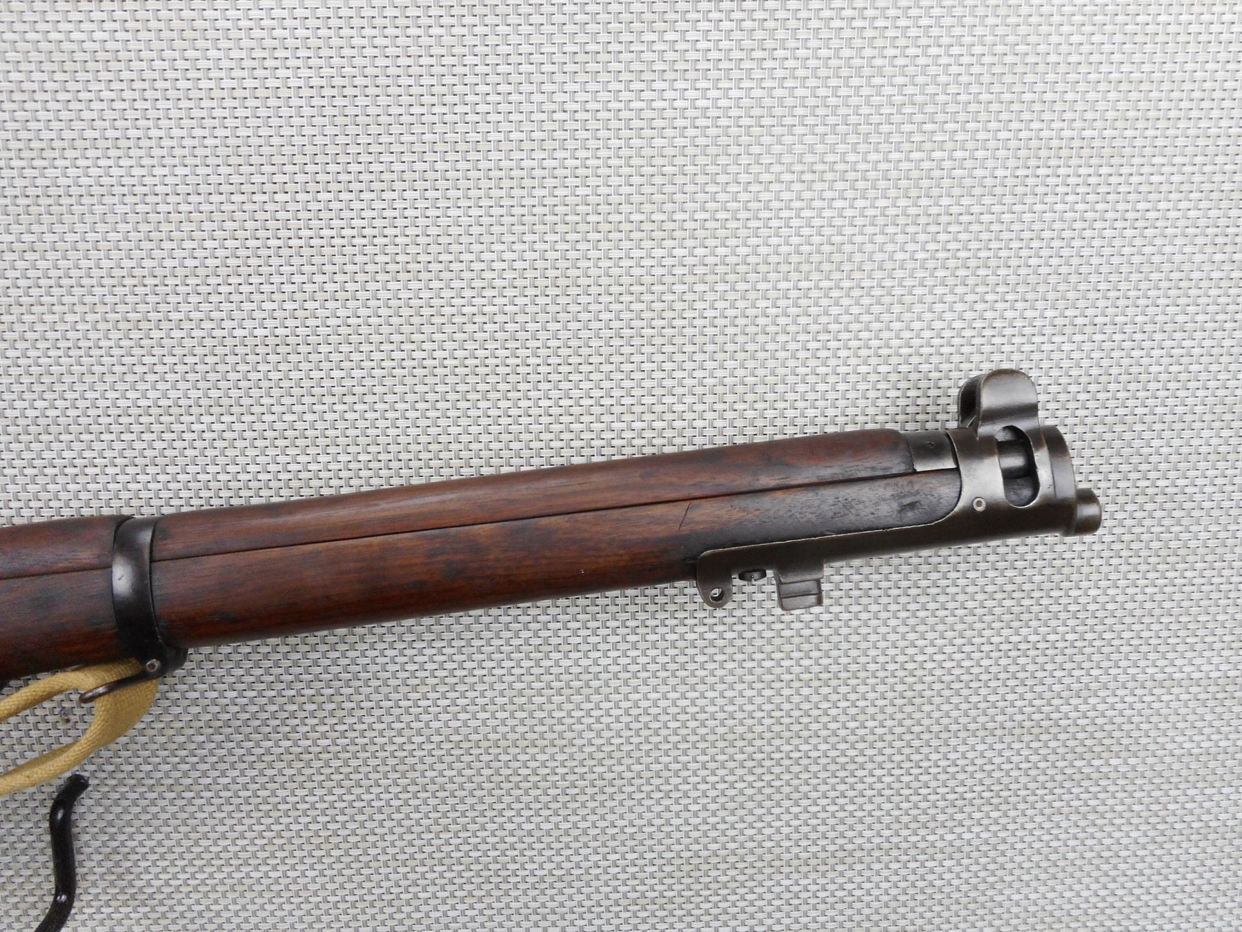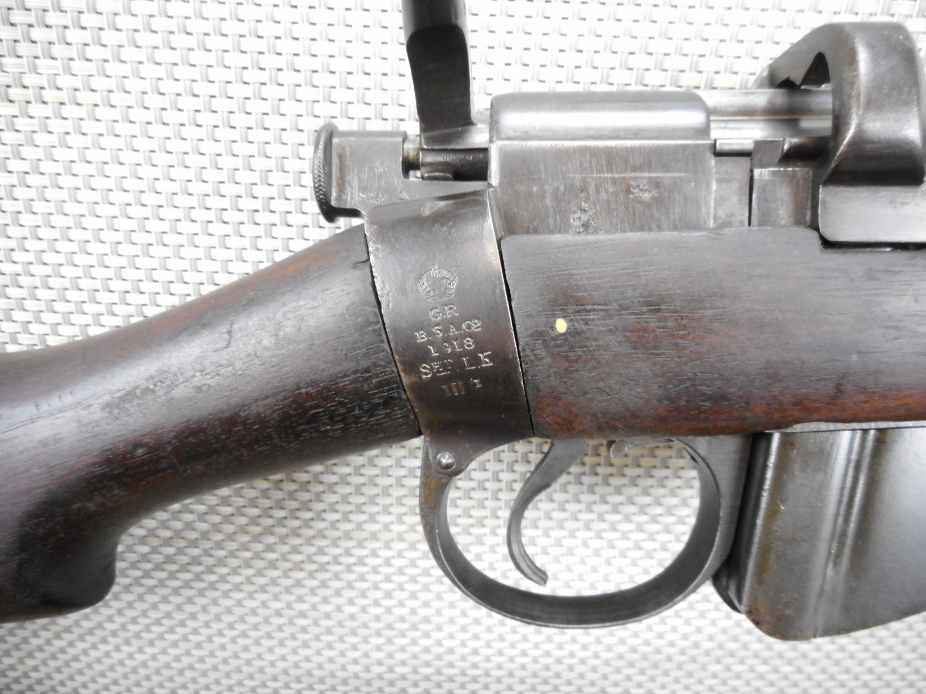 WWI ERA, LEE ENFIELD , MODEL: NO1 MKIII* , CALIBER: 303 BR , COMES WITH MAGAZINE, DATED 1918, BOLT AND RECEIVER MATCH BY SERIAL #, BARLEY CORN FRONT AND ADJUSTABLE REAR SIGHTS, SHOWS EXTENSIVE MILITARY MARKS, ORIGINAL CANVAS SLING WITH MILITARY MARKS, SHOWS SOME HANDLING MARKS, RETAINS FULL MILITARY CONFIGURATION , BARREL LENGTH: 25" , SERIAL # K44197 , STOCK # 8529 , CONDITION: 7/10 , CLASS: CANADIAN NON RESTRICTED CLASS