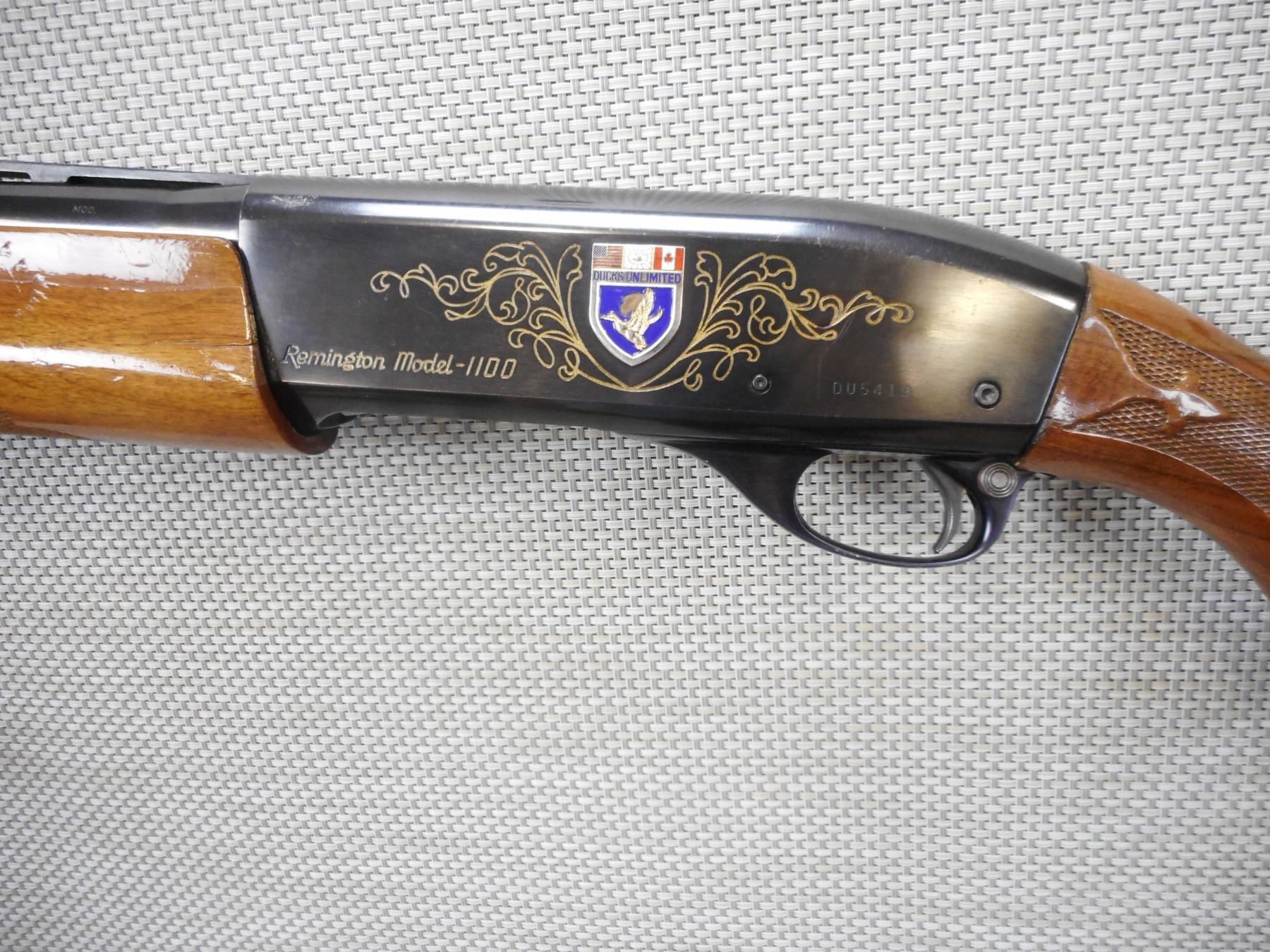 REMINGTON , MODEL: 1100 DUCKS UNLIMITED COMMEMORATIVE , CALIBER: 12GA X 2 3/4" , COMES WITH A CASE, VERY GOOD BORE, FIXED MODIFIED CHOKE, FIBER OPTIC FRONT AND VENTED RIB BARREL, CHECKERED FOREND AND CAPPED PISTOL GRIP BUTT STOCK, FEATURES THE MULTI FLAG DUCKS UNLIMITED LOGO ON A LIGHTLY ENGRAVED RECEIVER, SHOWS VERY LITTLE HANDLING MARKS, FIBER OPTIC BEAD FRONT SIGHT , BARREL LENGTH: 28" , SERIAL # DU5419 , STOCK # 8547 , CONDITION: 9/10 , CLASS: CANADIAN NON RESTRICTED CLASS