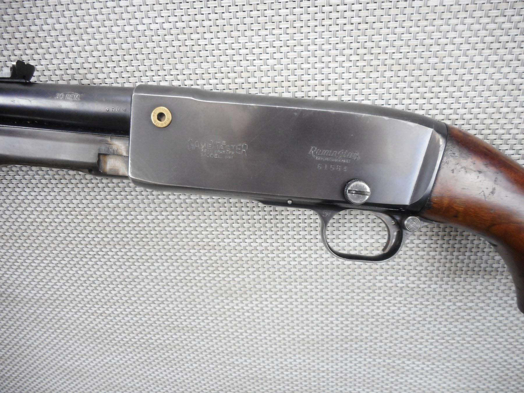 REMINGTON , MODEL: 141 GAMEMASTER , CALIBER: 30 REM , TAKEDOWN MODEL, VERY GOOD BORE, RAMP FRONT AND ADJUSTABLE REAR SIGHT, SHOWS SOME HANDLING MARKS, STEEL BUTT PLATE , BARREL LENGTH: 24" , SERIAL # 61584 , STOCK # 8567 , CONDITION: 8/10 , CLASS: CANADIAN NON RESTRICTED CLASS