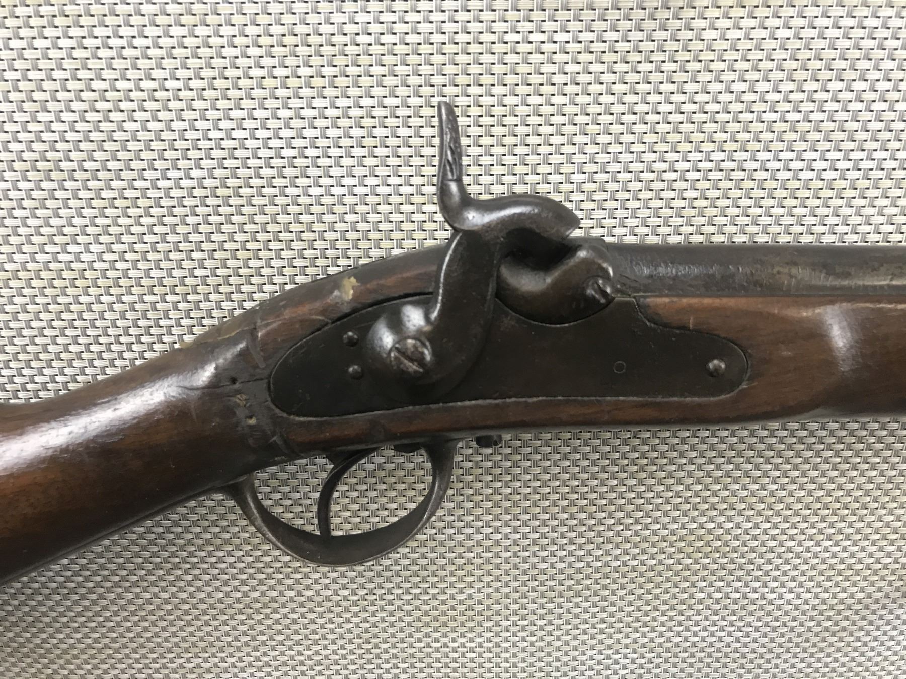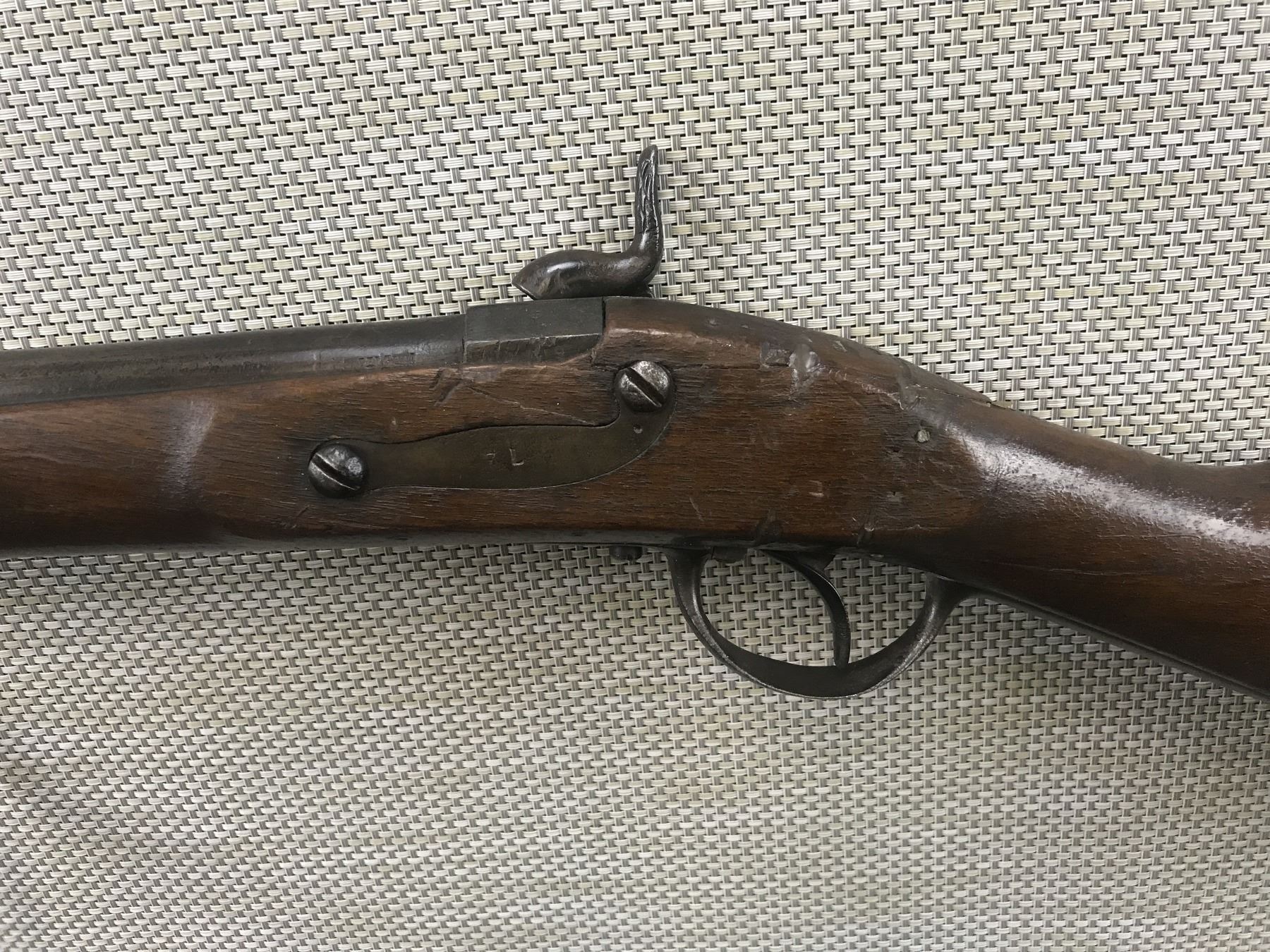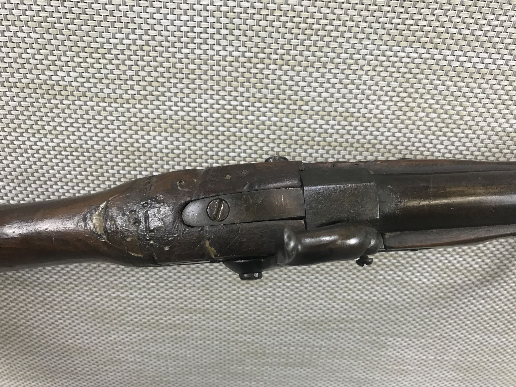 UNKNOWN BELGIAN PERCUSSION , MODEL: PERCUSSION SHOTGUN , CALIBER: 65 CAL PERC , REPLACED STEEL RAM ROD, MISSING THE NIPPLE, STOCK IS CRACKED AND REPAIRED OVER THE LOCK, STEEL BUTT PLATE HAS MILITARY MARKINGS, SHOWS EXTENSIVE HANDLING MARKS, DOVETAIL FRONT AND NO REAR SIGHT , BARREL LENGTH: 31" , SERIAL # N/A , , CONDITION: ANTIQUE 3/10 , CLASS: CANADIAN ANTIQUE CLASS