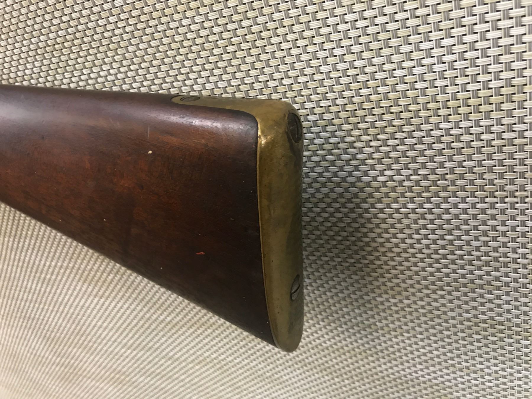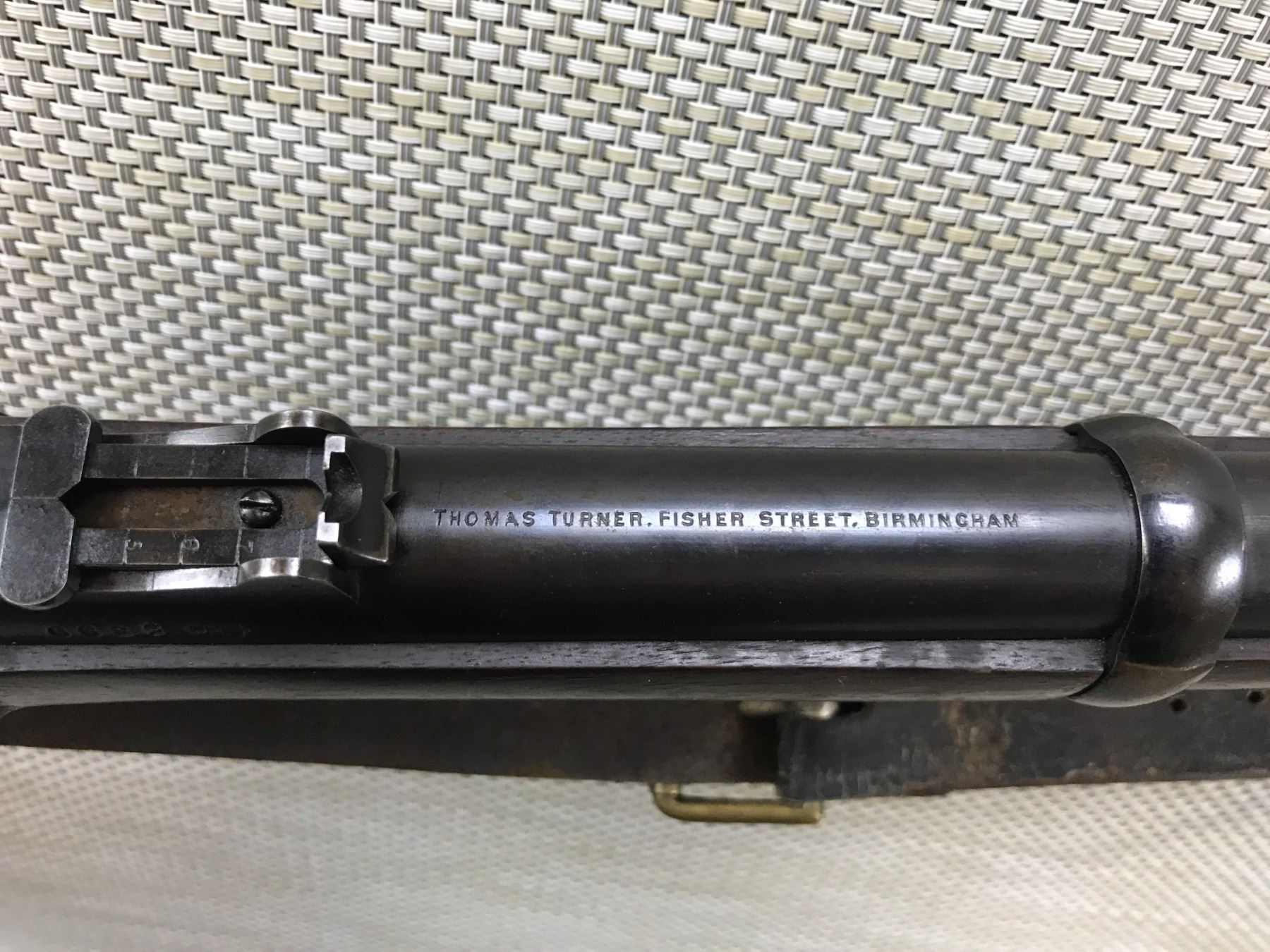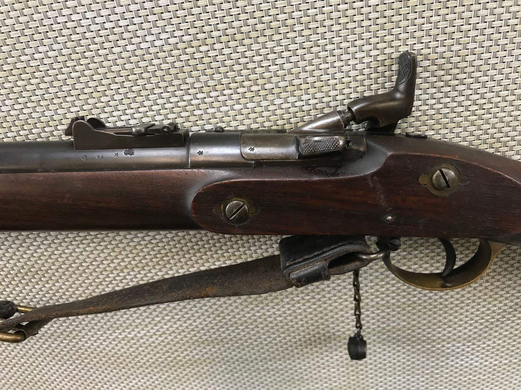 SNIDER ENFIELD /THOMAS TURNER , MODEL: COMMERCIAL TRADE MILITARY RIFLE , CALIBER: 577 SNIDER , COMES WITH PAPERWORK THAT SAYS IT WAS A BRITISH MARTINI ENFIELD (IT IS NOT) PLEASE SEE PHOTO FOR FULL PROVENANCE OF THIS RIFLE OWNED BY DR. FOSTER FROM TORONTO, BARREL ADDRESS IS THOMAS TURNER, FISHER STREET BIRMINHAM HAS A LEATHER SLING, EXCELLENT BORE, FRONT BLADE AND ADJUSTABLE LADDER REAR SIGHT, BRASS BUTT PLATE, TRIGGER GUARD AND NOSE CAP, ORIGINAL RAM ROD, 70% OF ORIGINAL BLUE REMAINS ON THE BARREL AND BARREL BANDS , BARREL LENGTH: 36 1/2" , SERIAL # N/A , , CONDITION: ANTIQUE 8/10 , CLASS: CANADIAN ANTIQUE CLASS