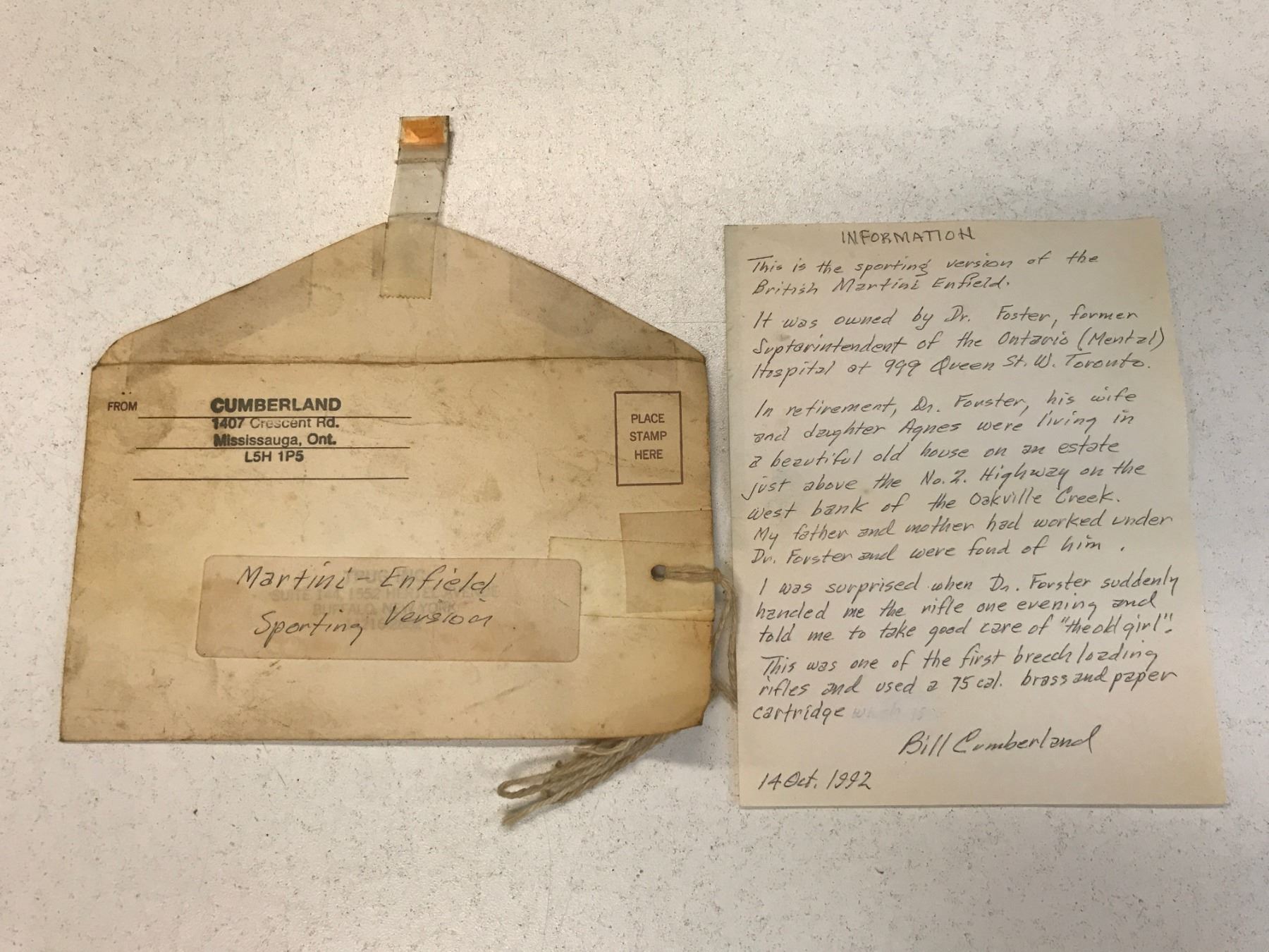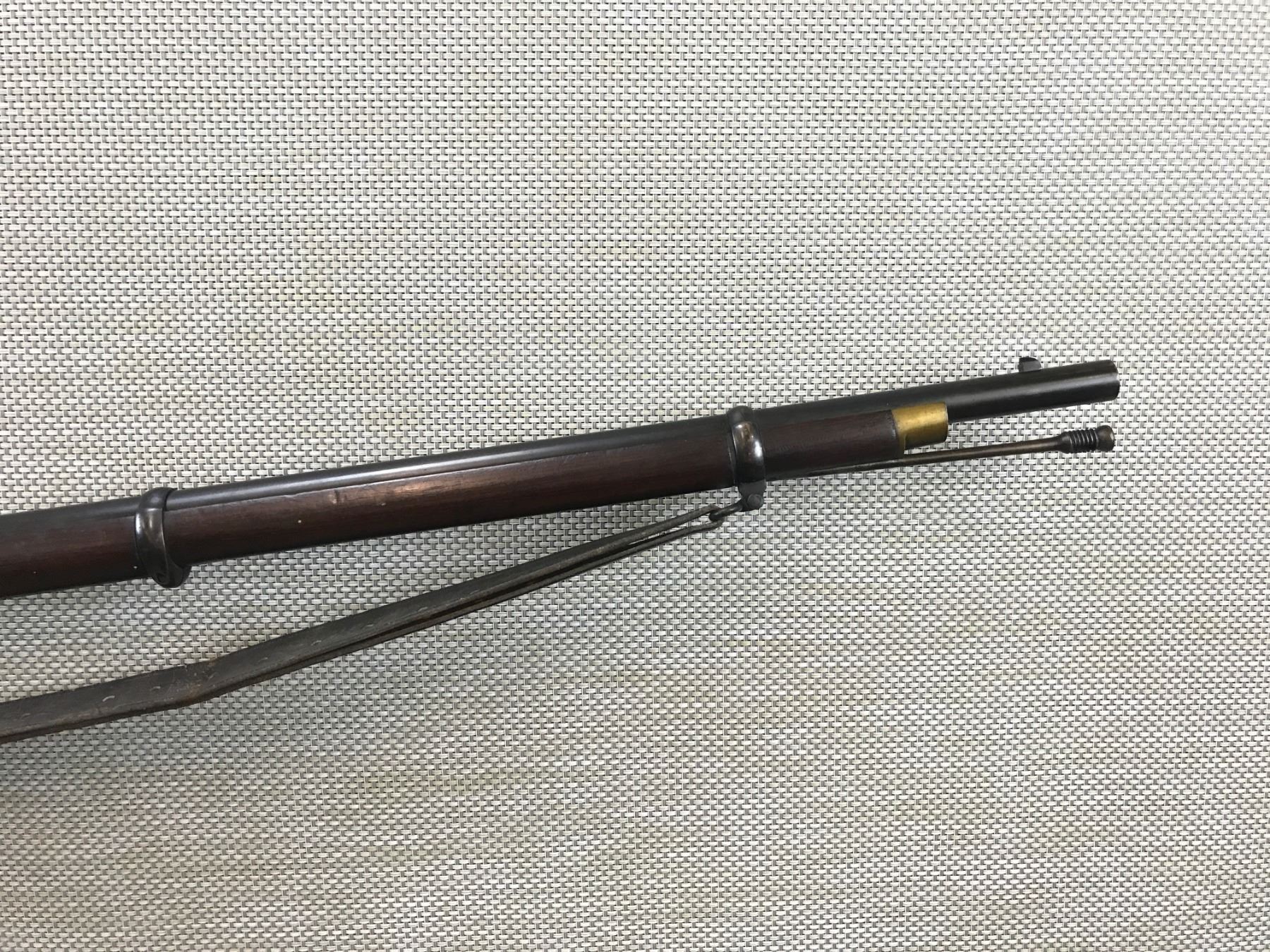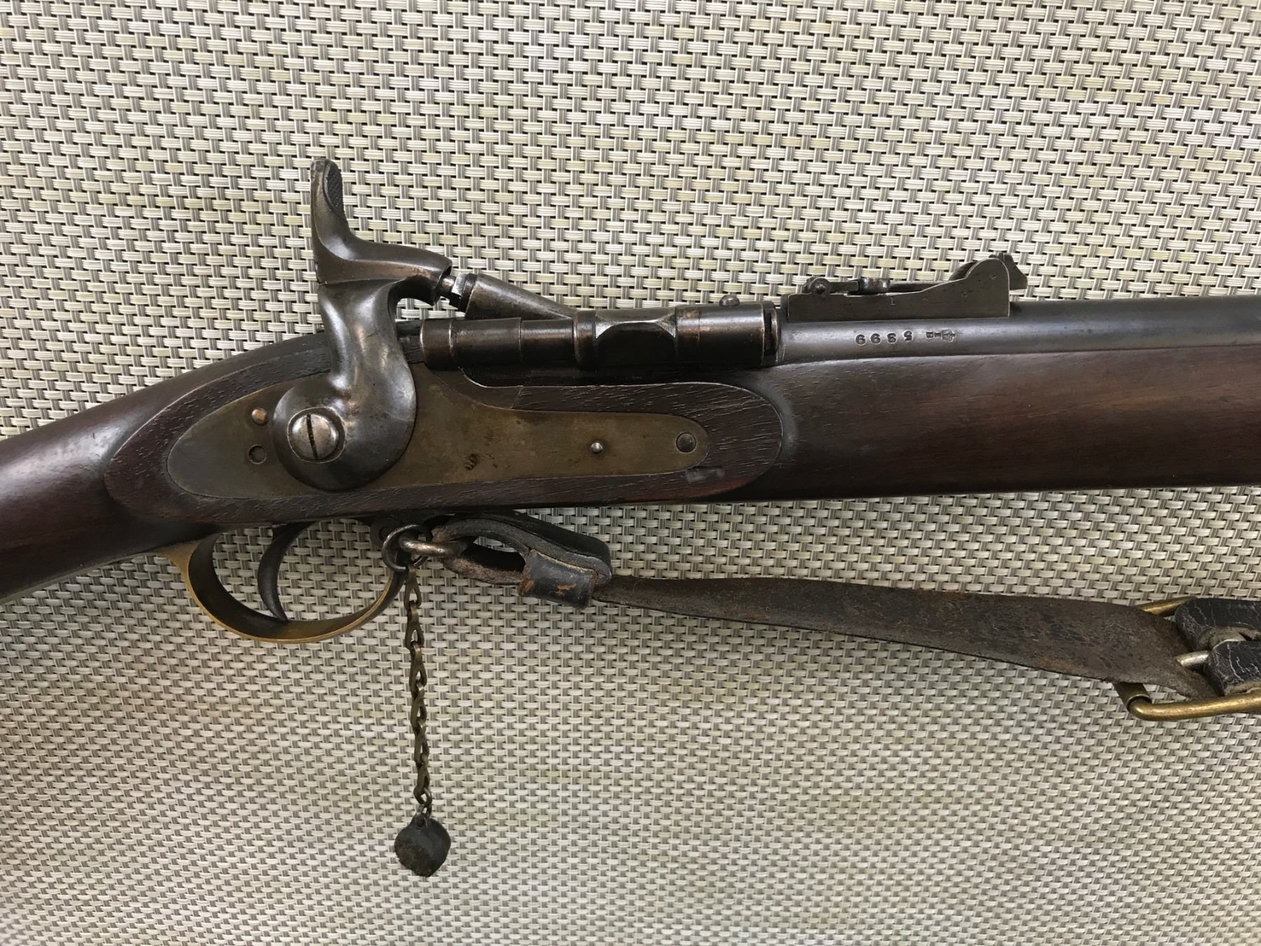SNIDER ENFIELD /THOMAS TURNER , MODEL: COMMERCIAL TRADE MILITARY RIFLE , CALIBER: 577 SNIDER , COMES WITH PAPERWORK THAT SAYS IT WAS A BRITISH MARTINI ENFIELD (IT IS NOT) PLEASE SEE PHOTO FOR FULL PROVENANCE OF THIS RIFLE OWNED BY DR. FOSTER FROM TORONTO, BARREL ADDRESS IS THOMAS TURNER, FISHER STREET BIRMINHAM HAS A LEATHER SLING, EXCELLENT BORE, FRONT BLADE AND ADJUSTABLE LADDER REAR SIGHT, BRASS BUTT PLATE, TRIGGER GUARD AND NOSE CAP, ORIGINAL RAM ROD, 70% OF ORIGINAL BLUE REMAINS ON THE BARREL AND BARREL BANDS , BARREL LENGTH: 36 1/2" , SERIAL # N/A , , CONDITION: ANTIQUE 8/10 , CLASS: CANADIAN ANTIQUE CLASS