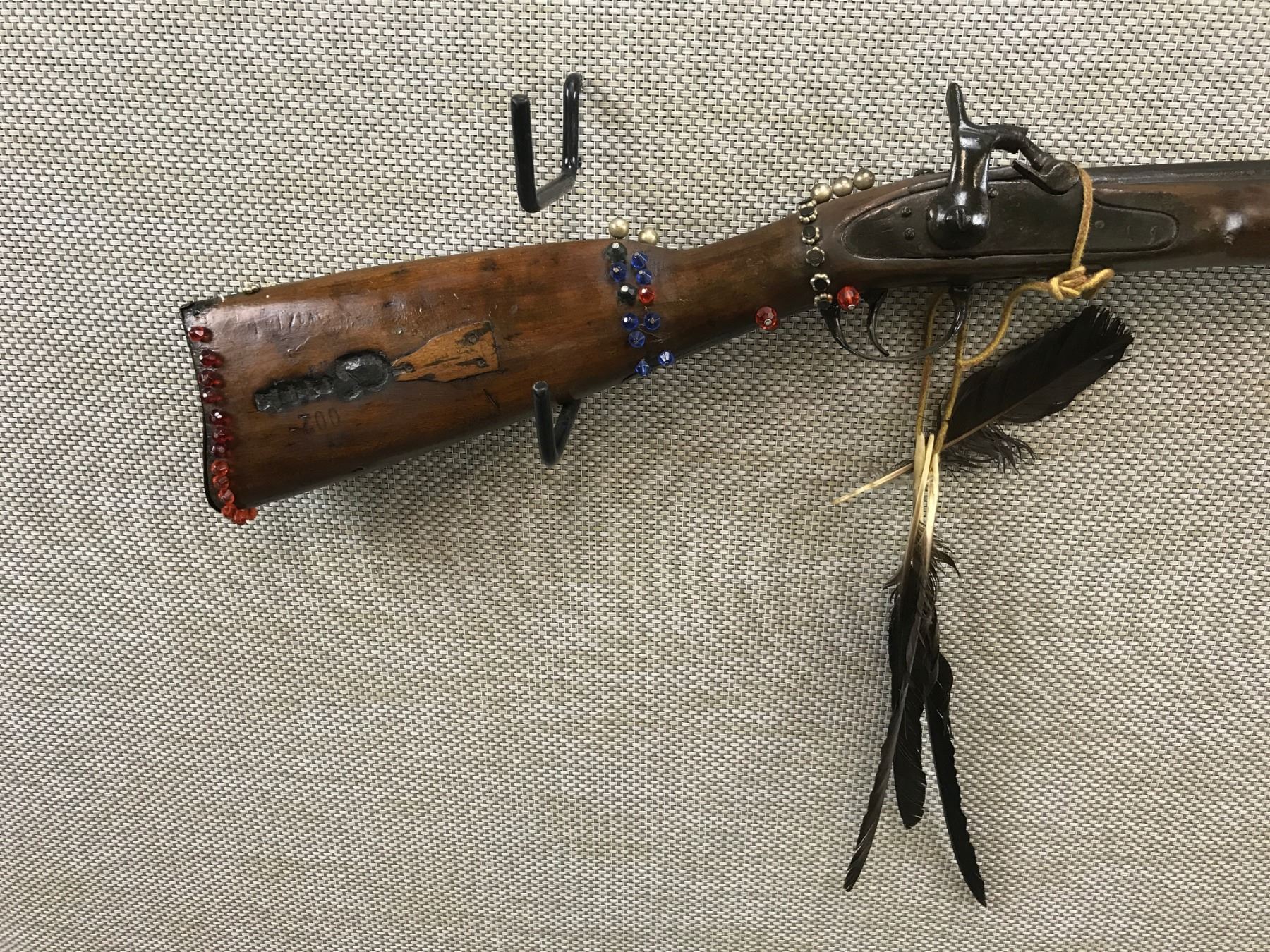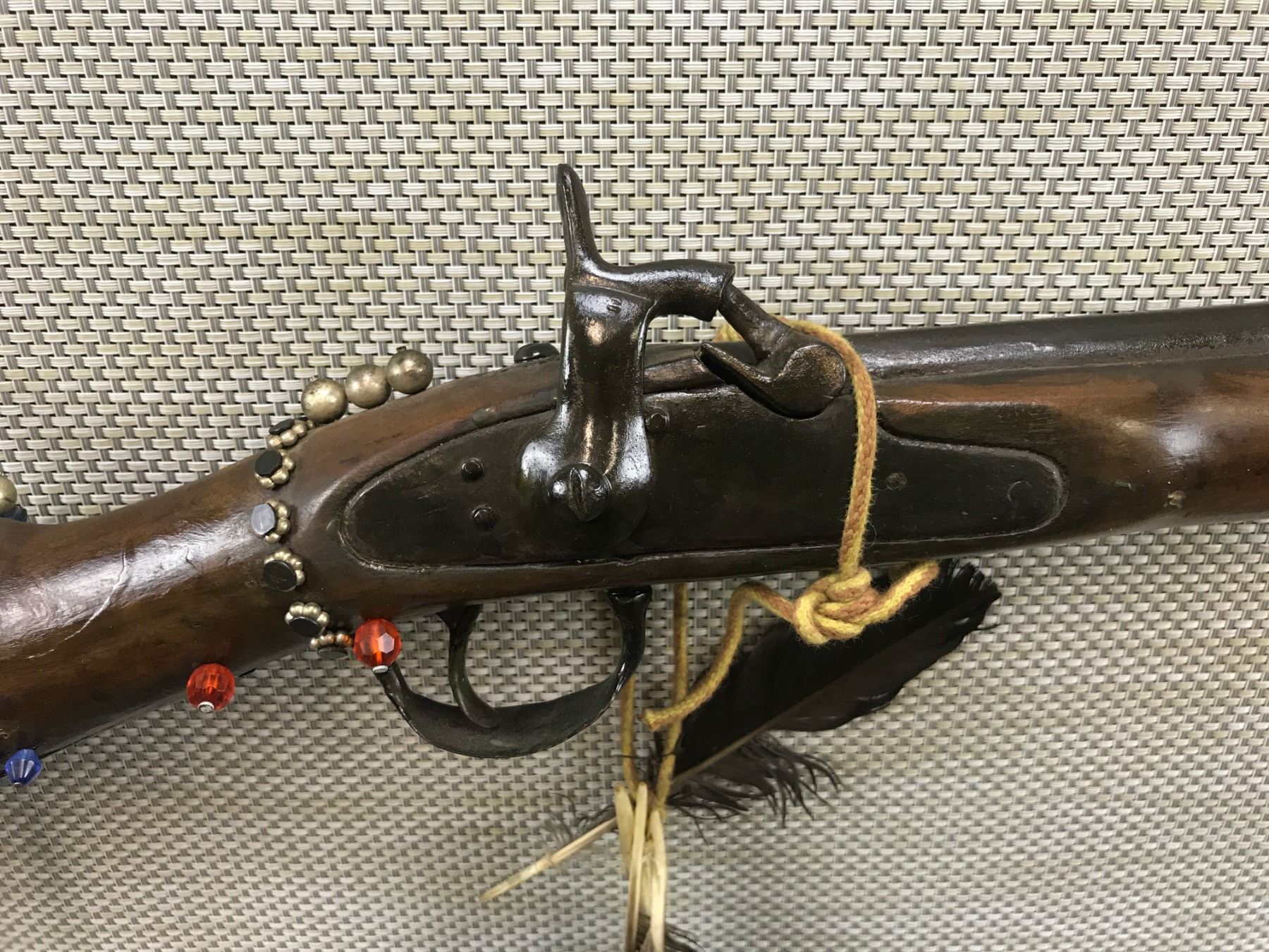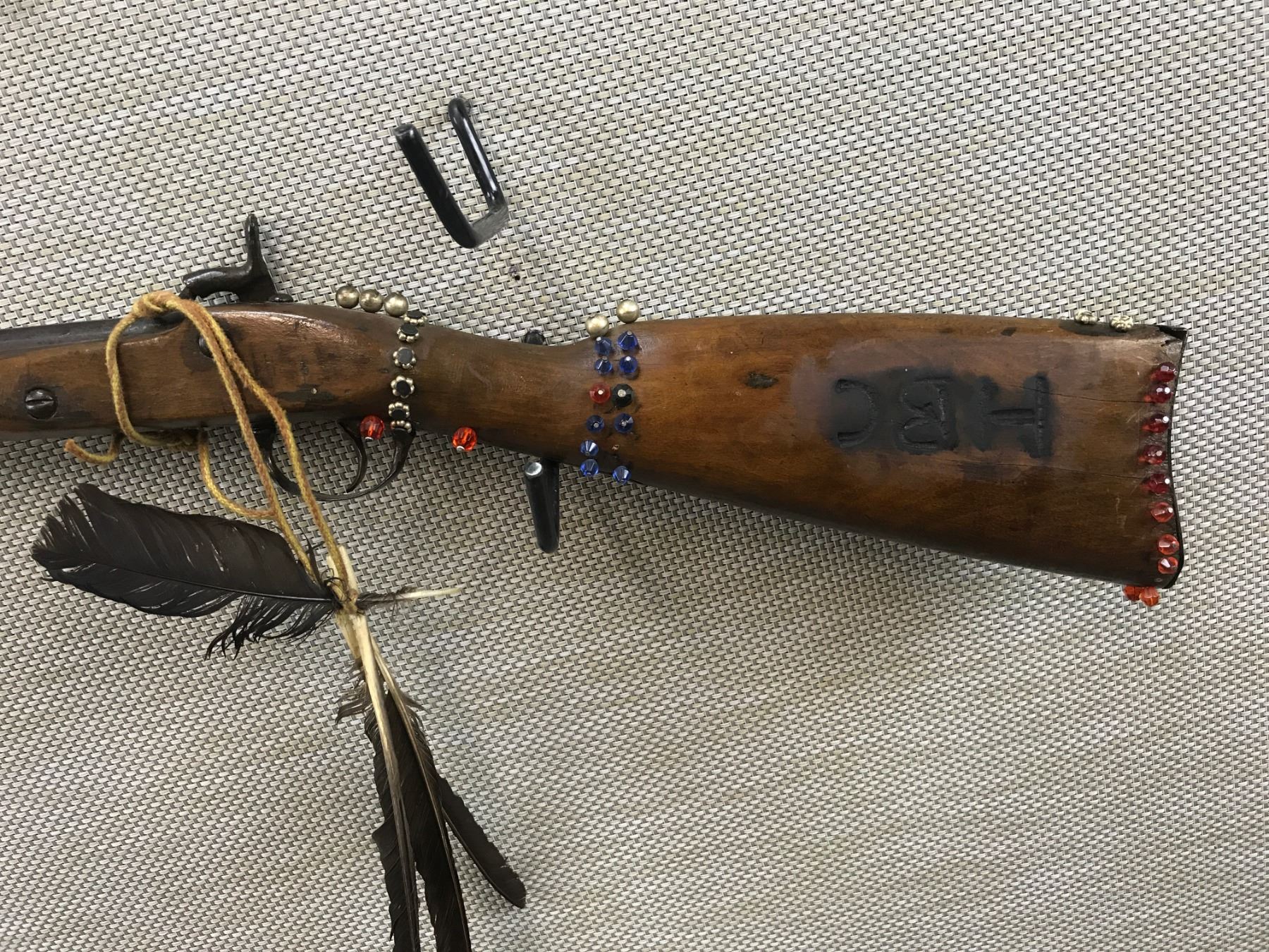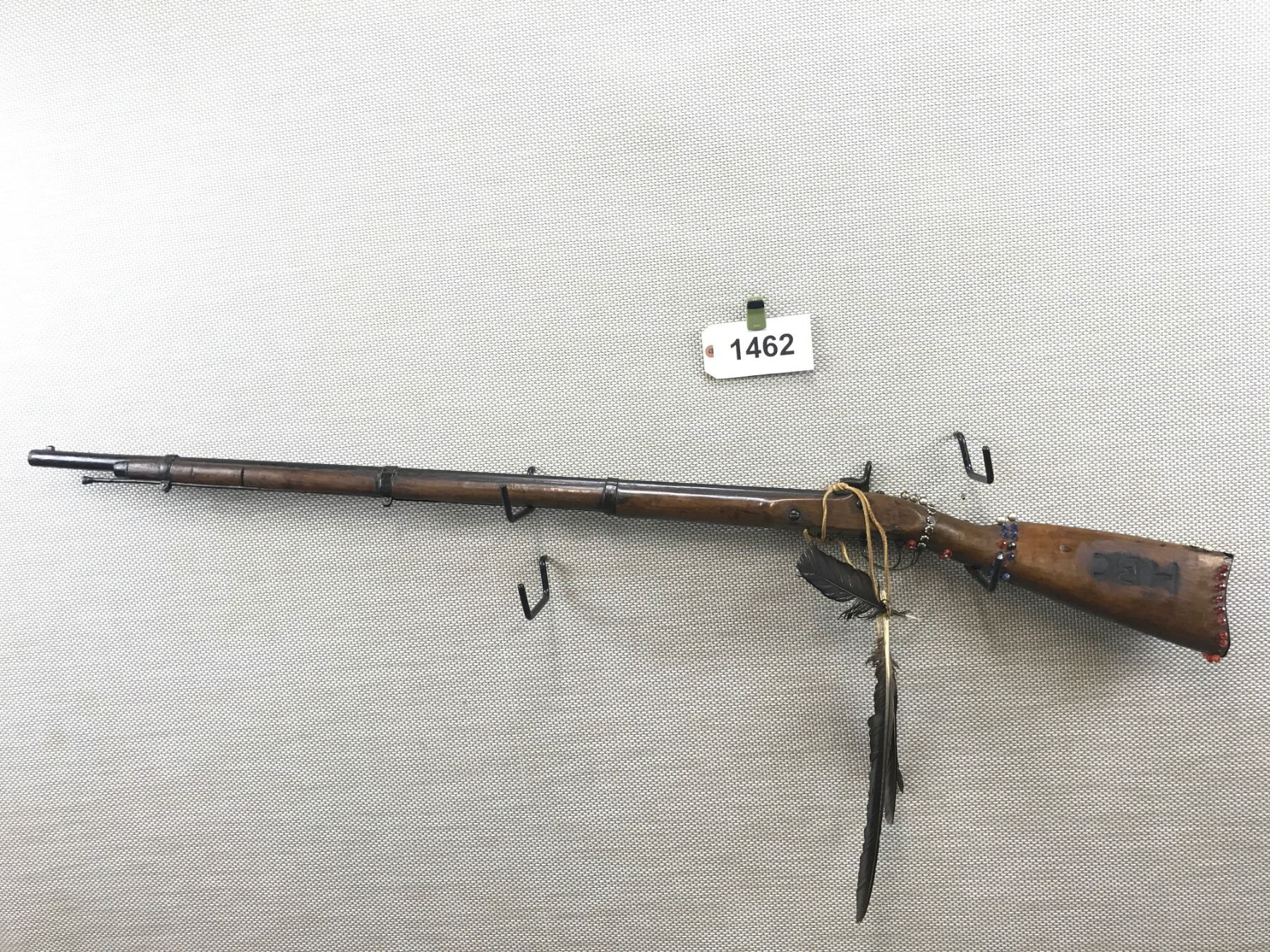 UNKNOWN , MODEL: MADE TO LOOK LIKE A HUDSON BAY TRADE GUN , CALIBER: 60 CAL , NON ORIGINAL BEADS AND FEATHERS, MADE TO LOOK LIKE A HUDSON BAY TRADE GUN, NO MARKINGS ON THE GUN TO VERIFY THIS, WORK APPEARS TO BE DONE AFTER PURCHASE , BARREL LENGTH: 37" , SERIAL # N/A , , CONDITION: , CLASS: CANADIAN ANTIQUE CLASS