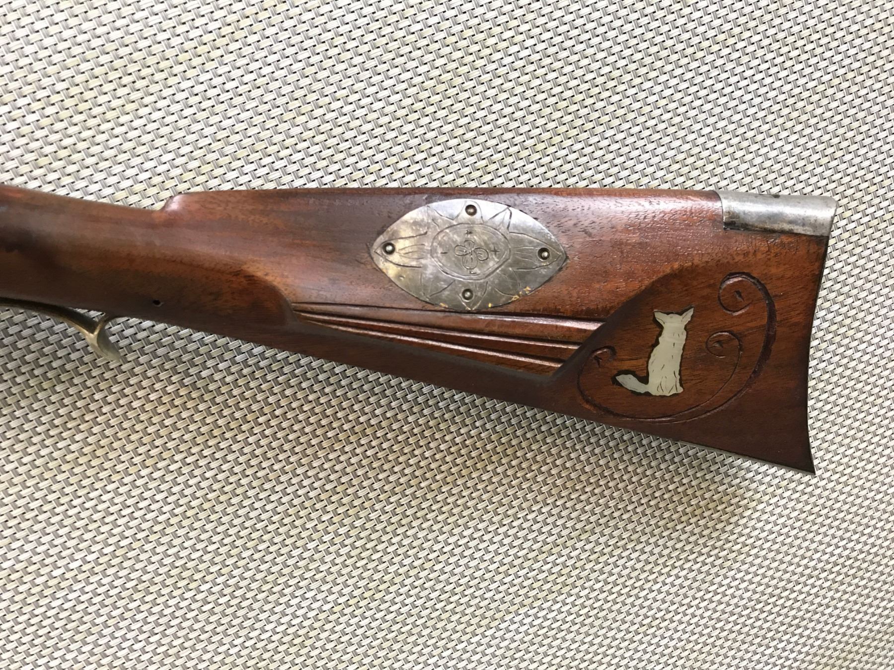 UNKNOWN , MODEL: FLINTLOCK KENTUCKY STYLE , CALIBER: 45 CAL , OCTAGONAL BARREL, RIFLED BORE, HAS A PATCH BOX, STOCK HAS AN INLAYED MOTHER OF PEARL WOLF, SILVER TRIGGER GUARD, SET TRIGGER, NOTCHED SIGHTS, WOODEN RAM ROD, STOCK IS CRACKED BETWEEN THE TANG AND THE LEFT LOCK PLATE , BARREL LENGTH: 32" , SERIAL # N/A , , CONDITION: ANTIQUE 6/10 , CLASS: CANADIAN ANTIQUE CLASS