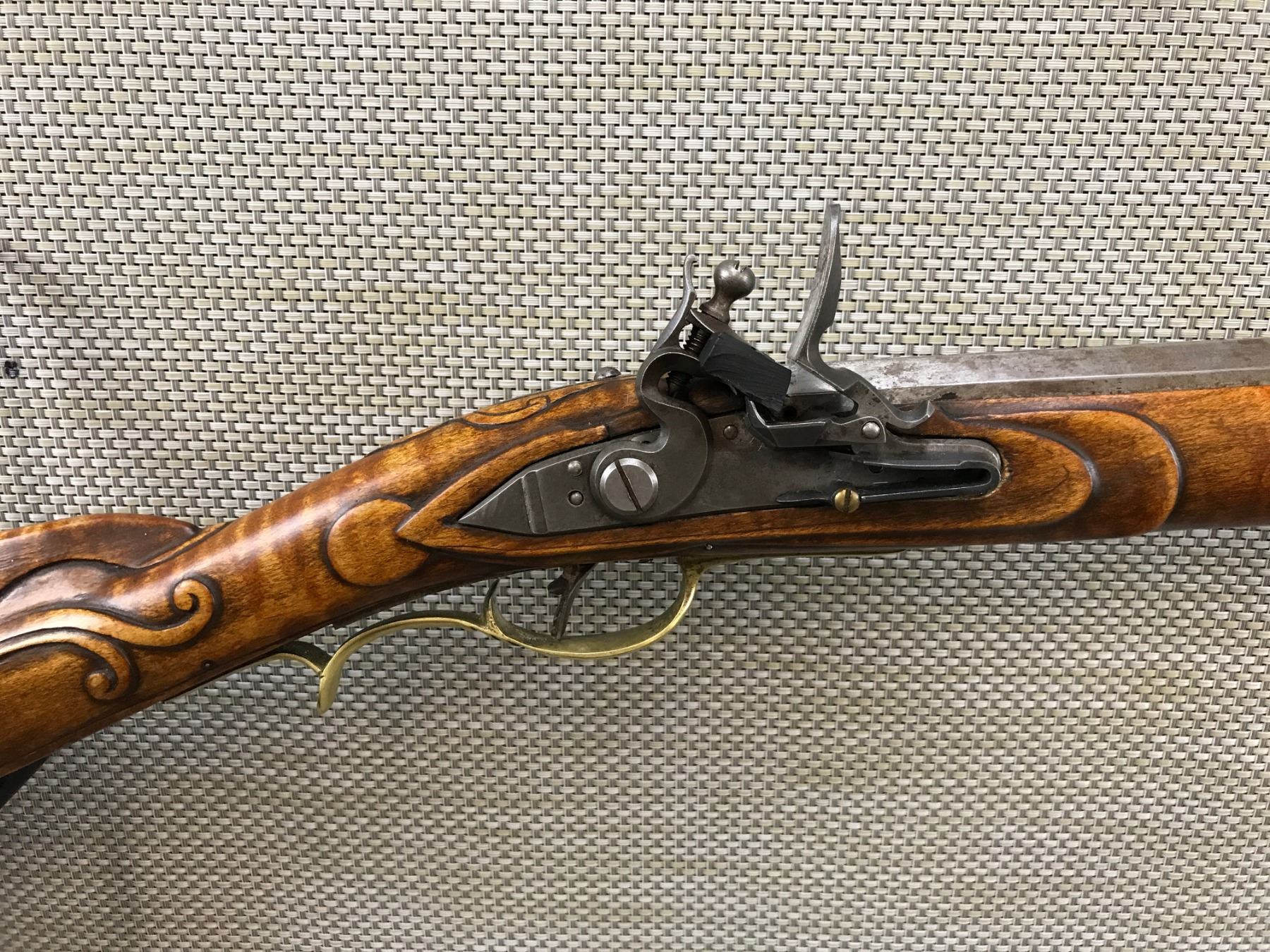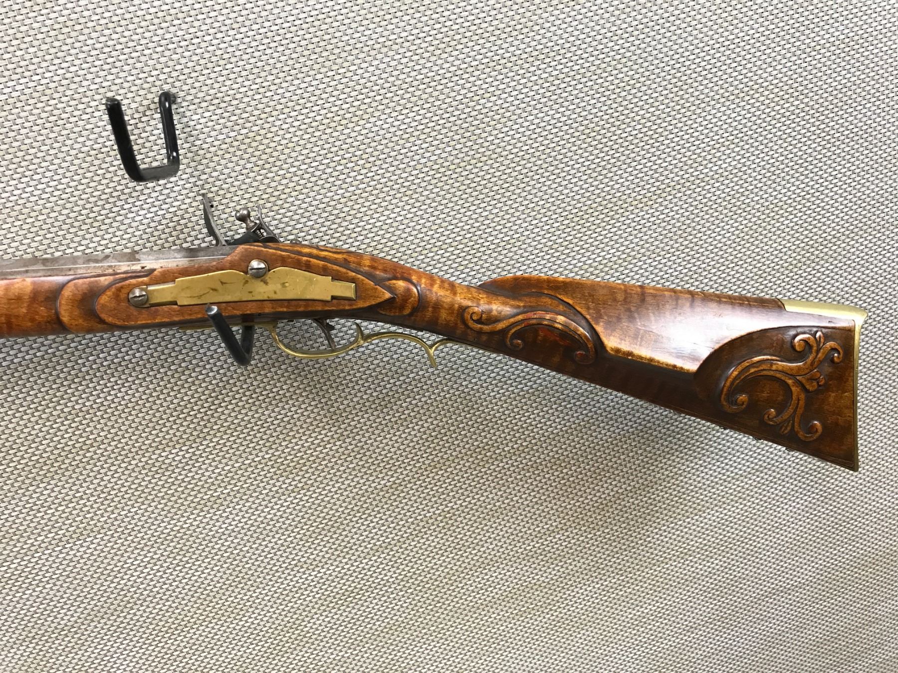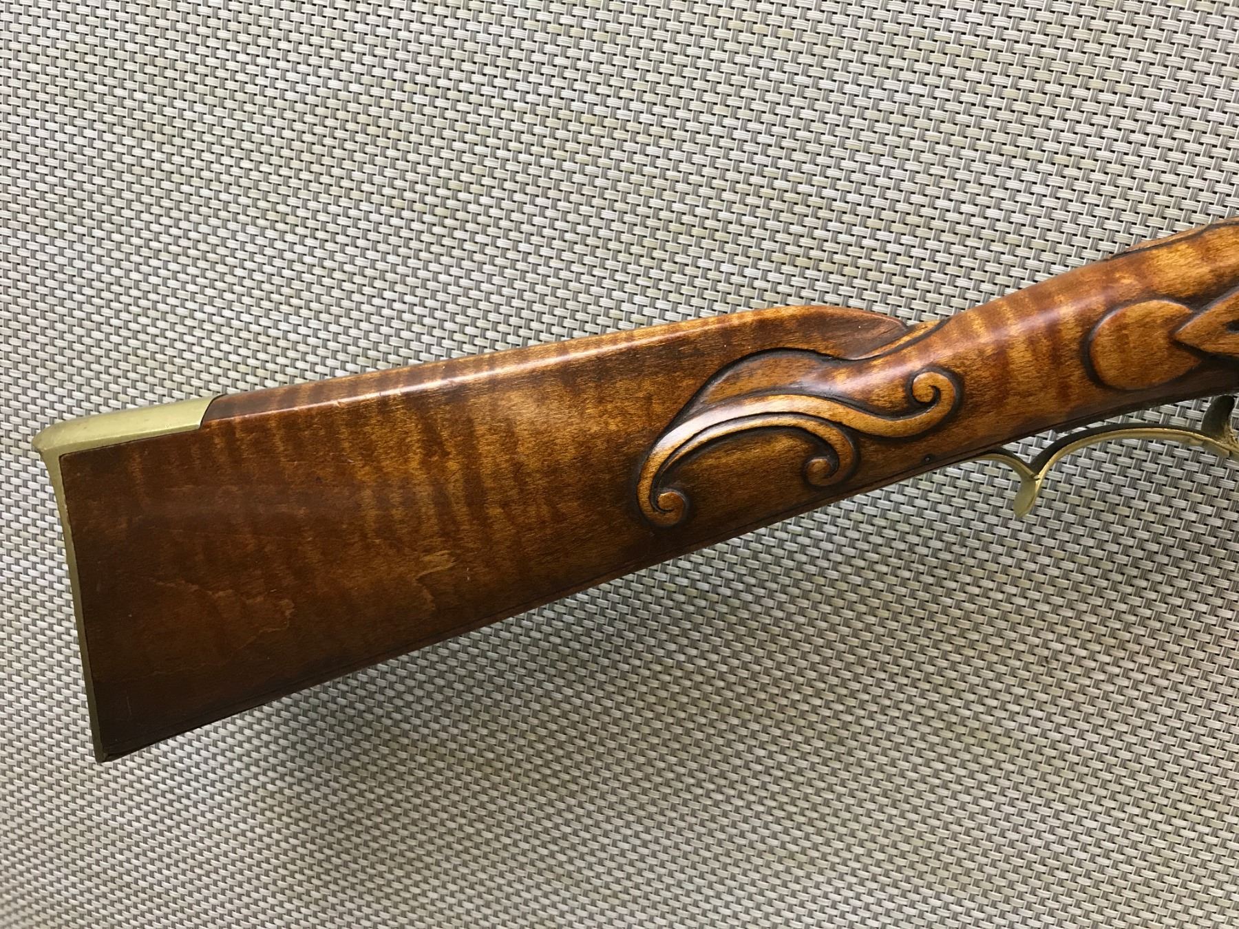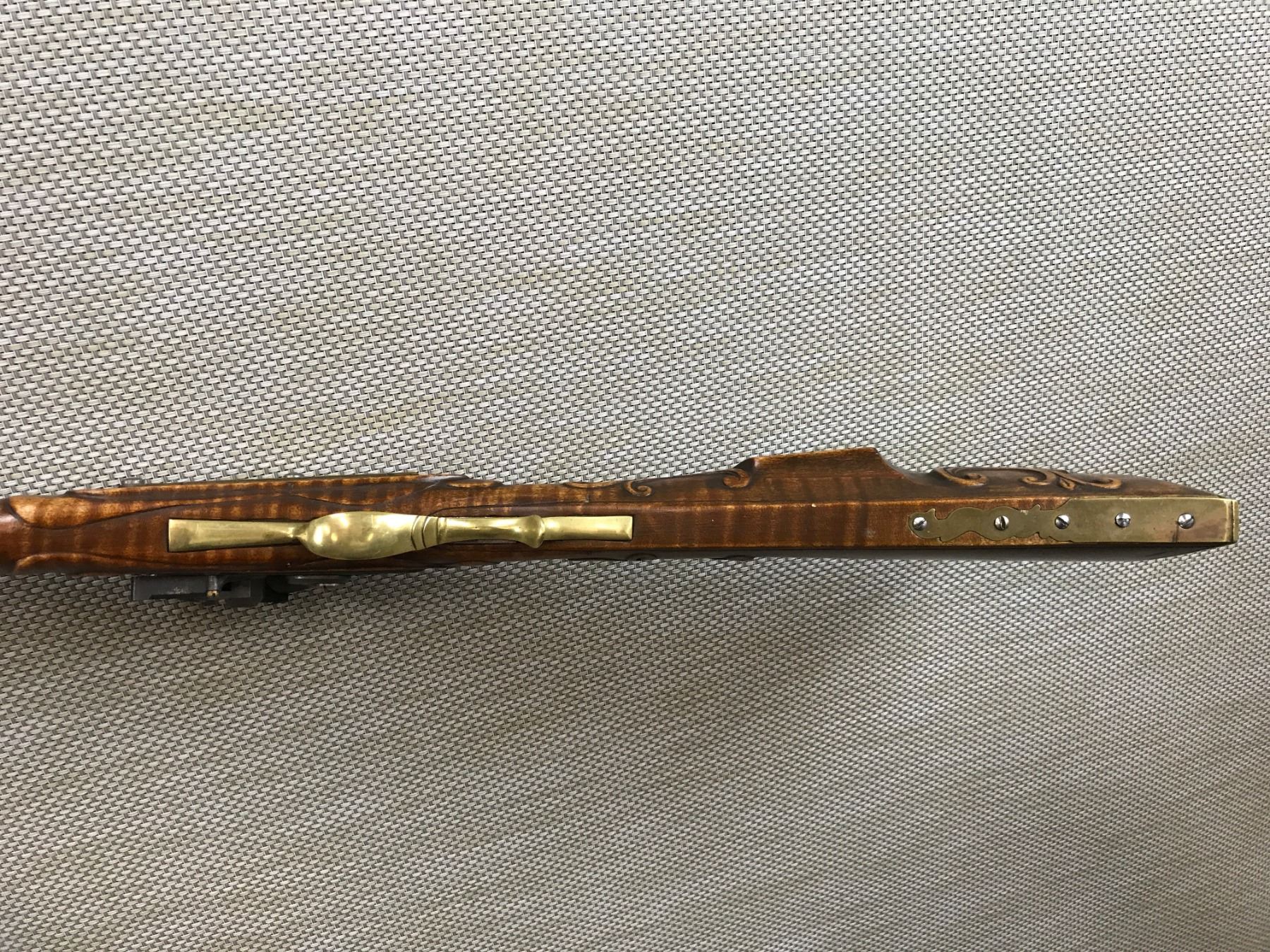 UNKNOWN , MODEL: REPRODUCTION FLINTLOCK KENTUCKY STYLE RIFLE , CALIBER: 50 CAL , RIFLED BORE, FRONT BLADE MISSING REAR SIGHT, FULL WOOD STOCK, CARVED WITH CHEEK PIECE, BRASS BUTT PLATE, TRIGGER GUARD, HAS A RAM ROD , BARREL LENGTH: 42" , SERIAL # N/A , , CONDITION: ANTIQUE 6/10 , CLASS: CANADIAN ANTIQUE CLASS