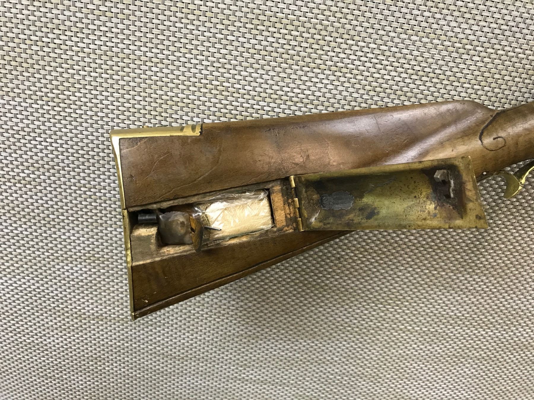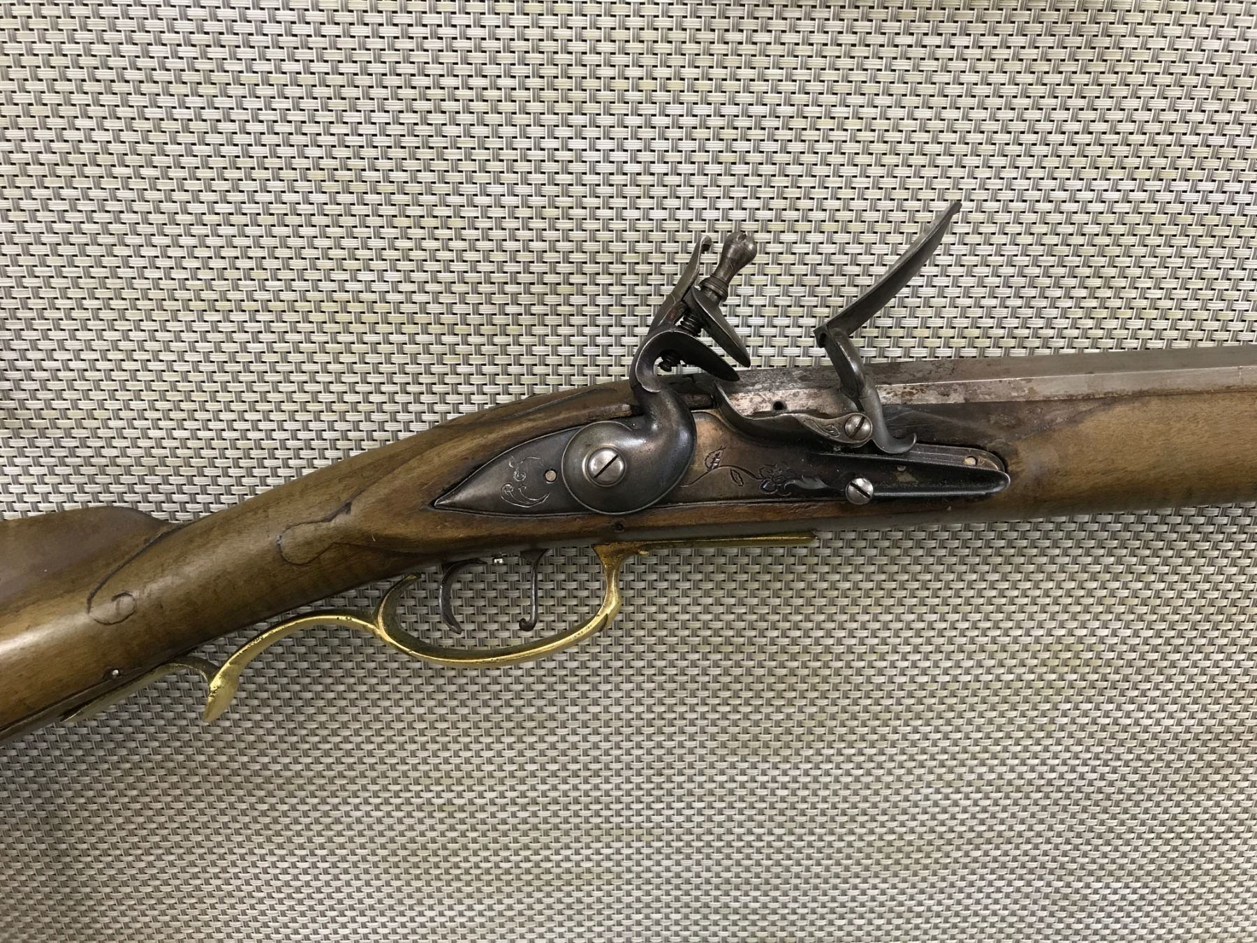 UNKNOWN , MODEL: REPRODUCTION FLINTLOCK KENTUCKY STYLE RIFLE , CALIBER: 50 CAL , BARREL IS MARKED R MILLER, OCTAGONAL BARREL IS FLARED AT THE MUZZLE, BRASS PATCH BOX, BUTT PLATE AND TRIGGER GUARD, SET TRIGGER, NOTCH AND BLADE SIGHTS , BARREL LENGTH: 36" , SERIAL # N/A , , CONDITION: ANTIQUE 6/10 , CLASS: CANADIAN ANTIQUE CLASS