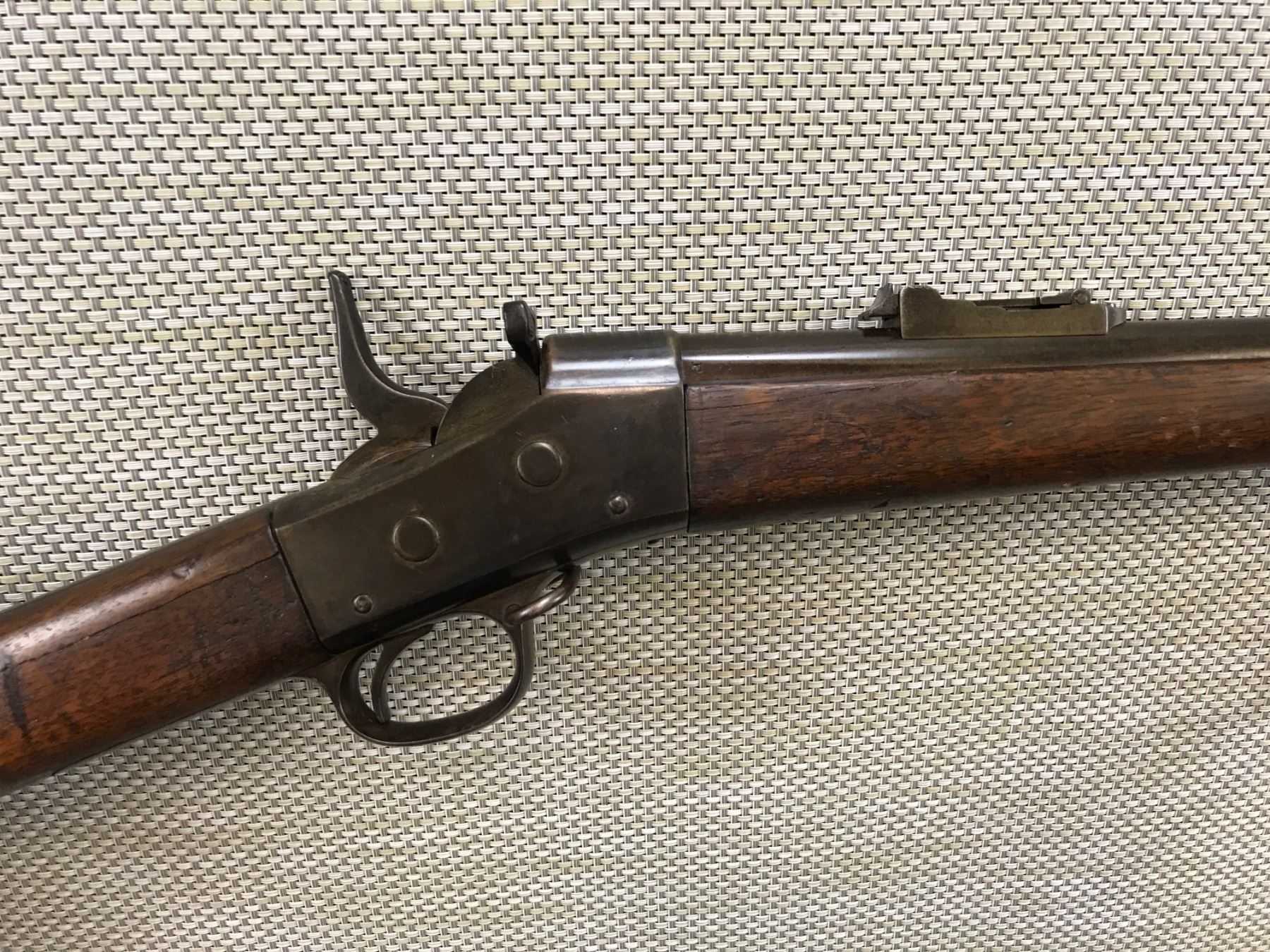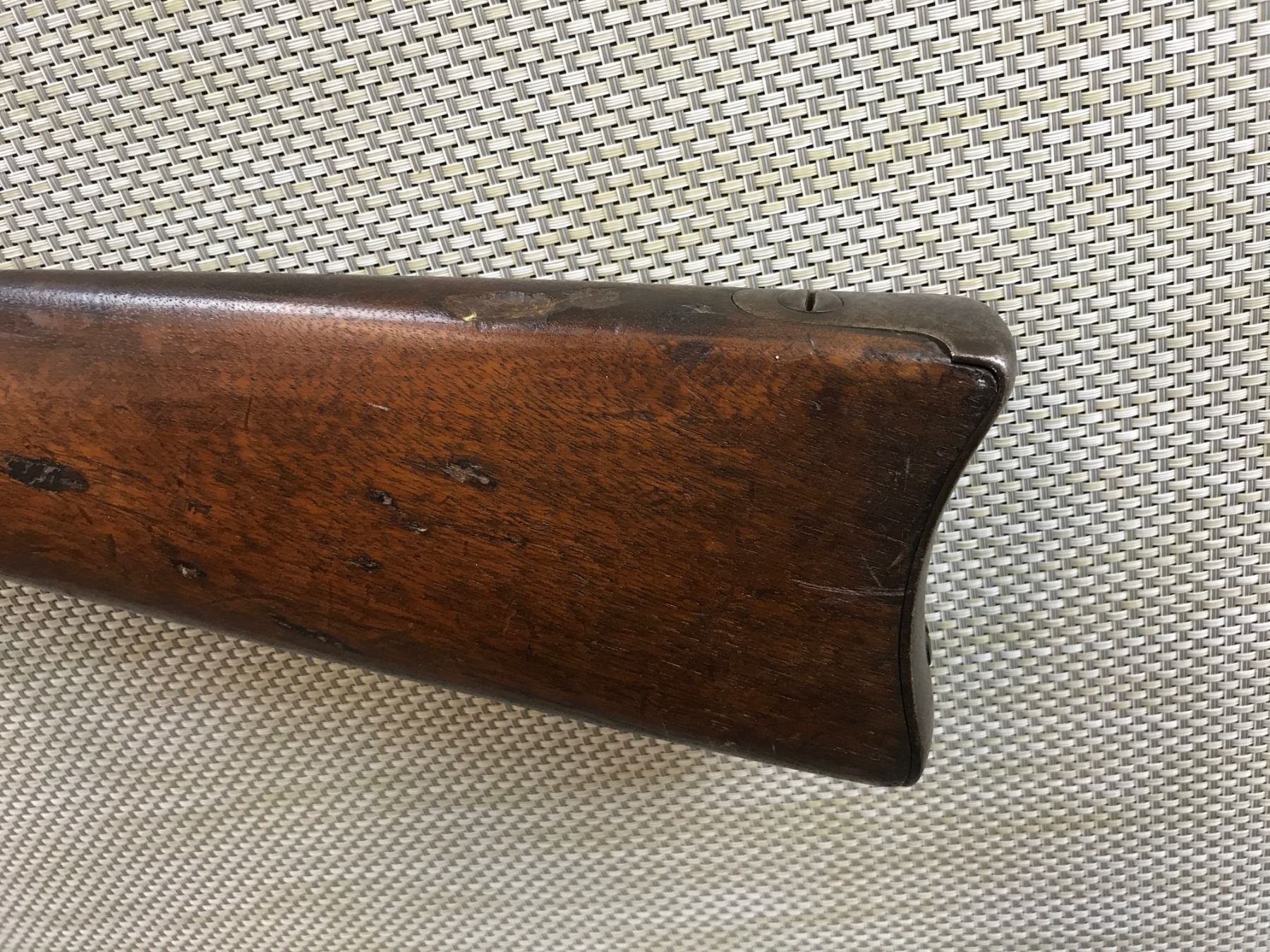 REMINGTON , MODEL: ROLLING BLOCK , CALIBER: 50-70 GOV , CLEANING ROD, SLING LOOPS, FRONT BLADE AND ADJUSTABLE LADDER SIGHT, METAL BUTT PLATE, SMALL CRACK IN THE BUTT STOCK AT THE TANG AND BUTT PLATE, BORE IS DARK WITH MINOR PITTING VERY LITTLE RIFLING IS VISIBLE , BARREL LENGTH: 36" , SERIAL # N/A , , CONDITION: ANTIQUE 5/10 , CLASS: CANADIAN ANTIQUE CLASS