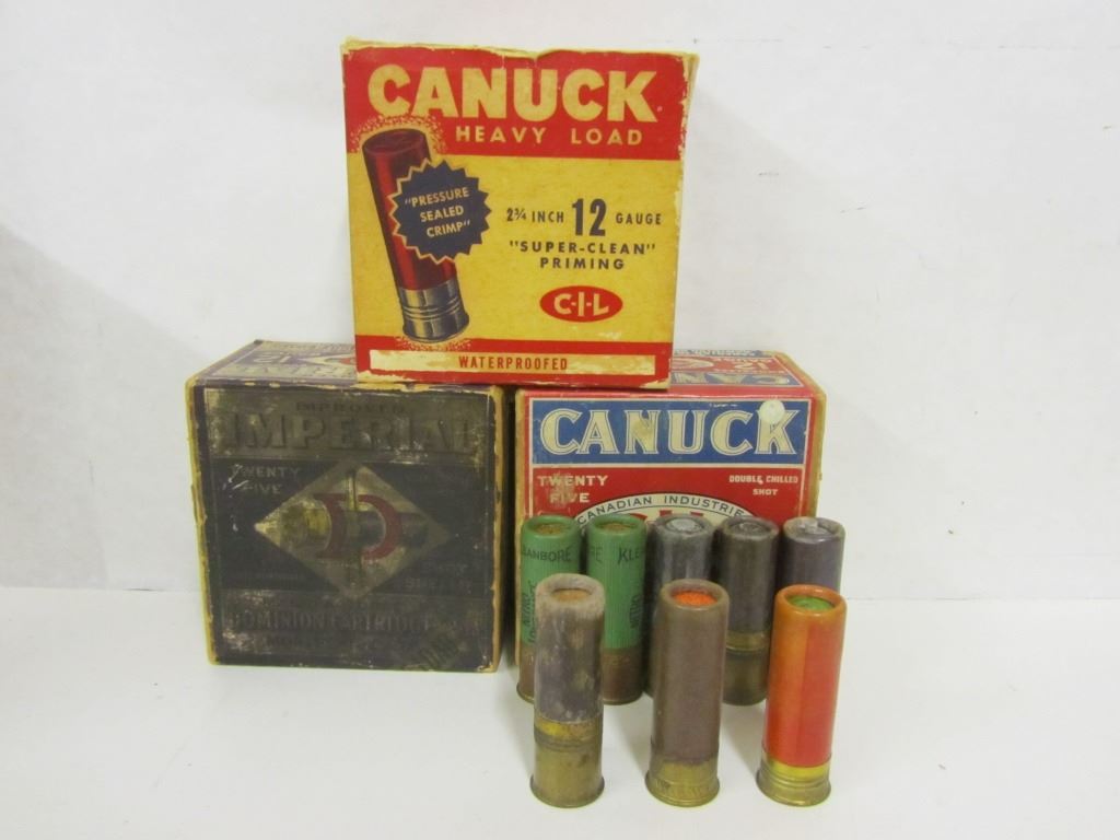 ONE EMPTY DOMINION CARTRIDGE CO. IMPROVED IMPERIAL 12GA BOX, ONE C-I-L DOMINION CO. CANUCK 12GA BOX WITH THREE IMPERIAL CANUCK 2 /34" SLUGS TWO UMC KLEANBORE NITRO EXPRESS 2 3/4" #4c SHELLS ONE IMPERIAL DOMINION 2 /34" SSG SHELL ONE PETERSVICTOR 2 /34" #6 SHELL ONE DOMINION CANUCK 2 3/4" #5 SHELL, ONE C-I-L CANUCK 12GA 2 3/4" #6 BOX WITH 5 SHELLS INSIDE.