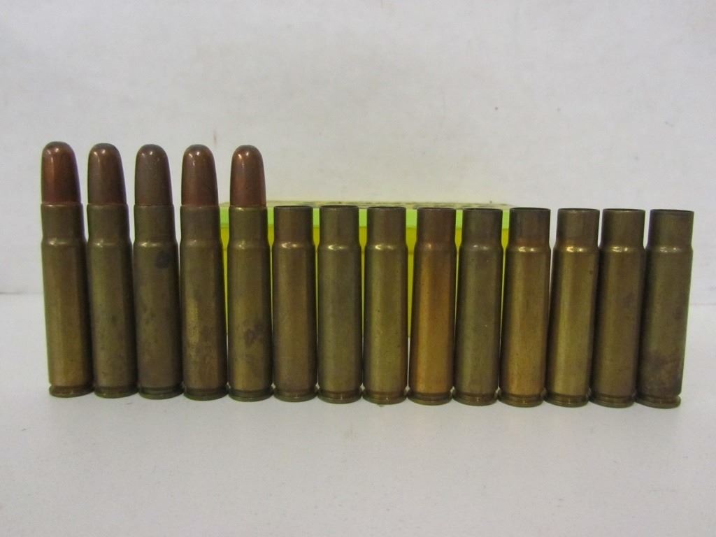 FIVE 35 REM FACTORY LOADS AND NINE PIECES OF ONCE FIRED BRASS