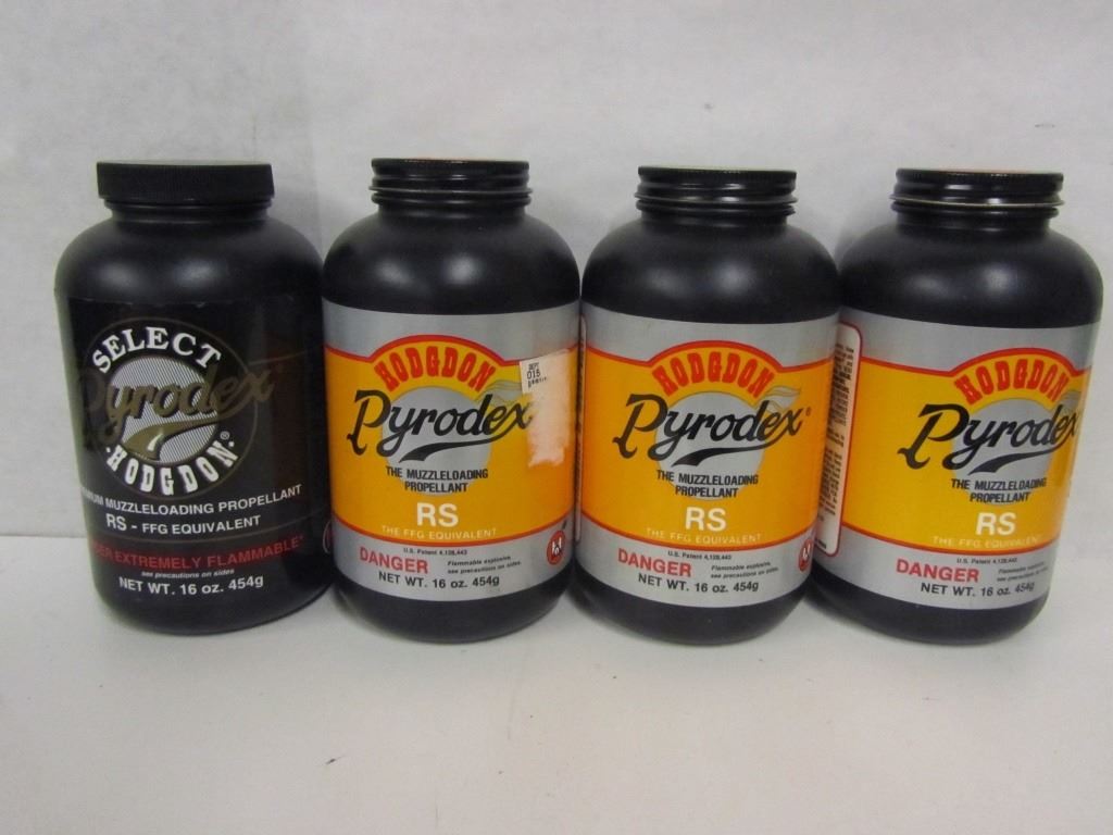 THREE BOTTLES OF HODGDON PYRODEX RS-FFG EQUIVALENT SMOKELESS MUZZLE LOADING POWDER, ONE BOTTLE OF HODGDON SELECT PYRODEX PREMIUM RS-FFG EQUIVALENT MUZZLE LOADING NON-SMOKELESS POWDER.