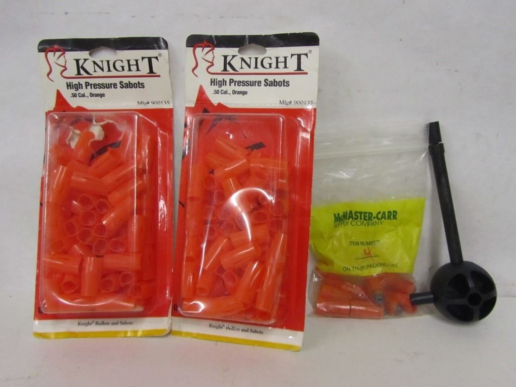 TWO PACKAGES OF KNIGHT 50CAL HIGH PRESSURE SABOTS, ONE BAG OF 9 SABOTTED BULLETS, ONE BULLET STARTER